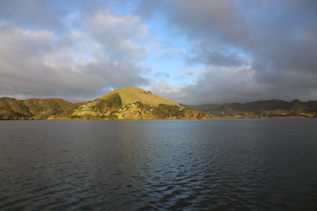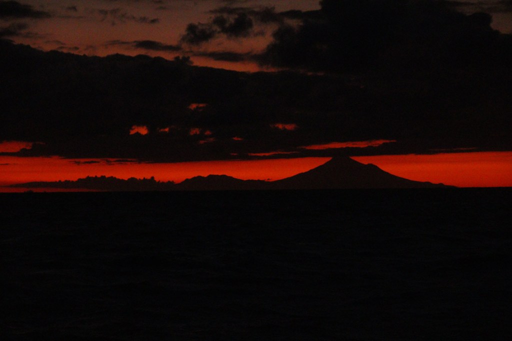 Vers 6:00 le jour commence à poindre, le soleil rougi l’horizon à l’est. Quelque chose se découpe en ombre chinoise dans la bande lumineuse entre la mer et les nuages. Pas de doute, c’est une montagne. Relèvement pris c’est bien le mont Taranaki, c’est un stratovolcan actif. Il appartient à la même famille de volcan que le mont Fuji et l’Etna bien qu’il soit moins haut (2518 m contre 3776 et 3350 m respectivement), il n’en n’est pas moins impressionnant vu d’ici. Au fur et à mesure que le soleil se lève le ciel à l’arrière plan passe progressivement de ce rouge orange foncé au jaune puis au bleu pale et la vision s’estompe dans la brume du petit matin. Mais comme la matinée s’avance et le ciel devient un bleu parfaitement limpide sur toute la voute à 360°, le Taranaki ré-aparait seul sur l’horizon et on peut distinguer son sommet enneigé.