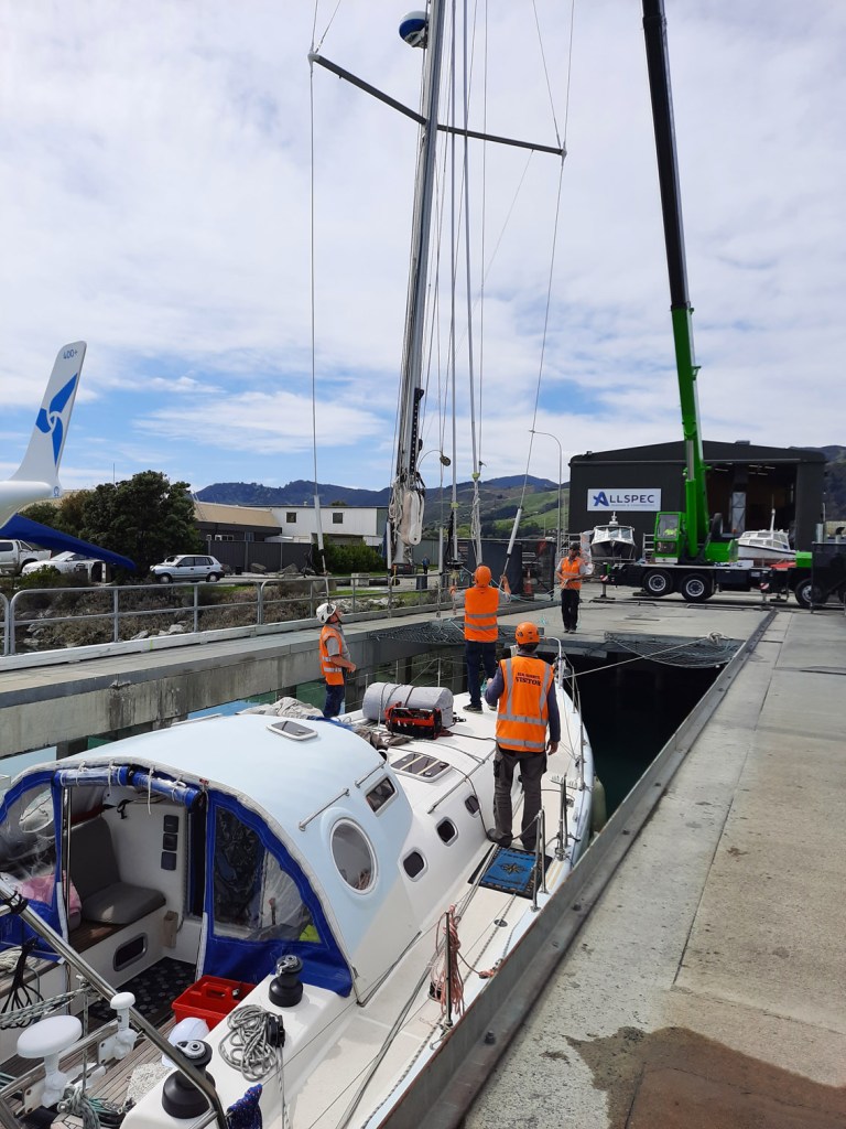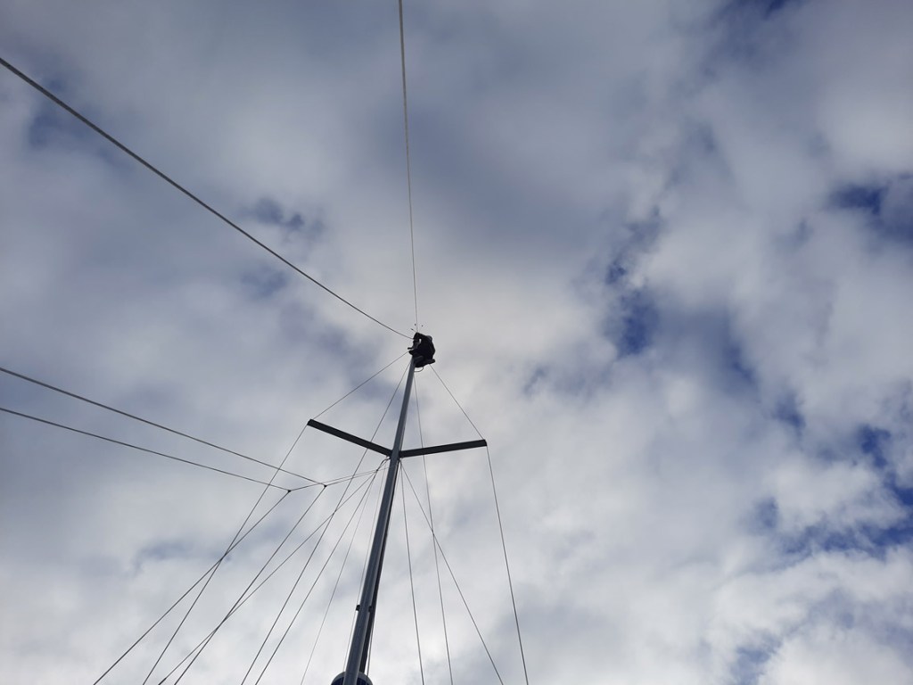 Lundi 5/10/2020, le verdict est tombé, Rob, le gréeur d’Opua, pense que les réas de tête de mât n’ont pas été changé (contrairement à ce qui est écris sur la facture) mais comme la tête de mât est très abîmée, il faut démâter. Adam le gréeur local arrive à mobiliser la grue pour le lendemain mardi et obtient un créneau à la cale pour 11:30. Le reste de la journée est passé à préparer le bateau pour le démâtage. Nous avions déjà enlevé les voiles d’avant dimanche dans un calme mais il y a encore pas mal de choses à démonter (grand-voile , enrouleurs , goupilles, ridoirs, câbles des instruments et autres antennes, hale-bas de bôme, la bôme et j’en passe et de meilleures), pas d’hésitation, on sait faire, la dernière fois c’était seulement en Novembre dernier, mais faudrait pas que çà devienne une habitude !