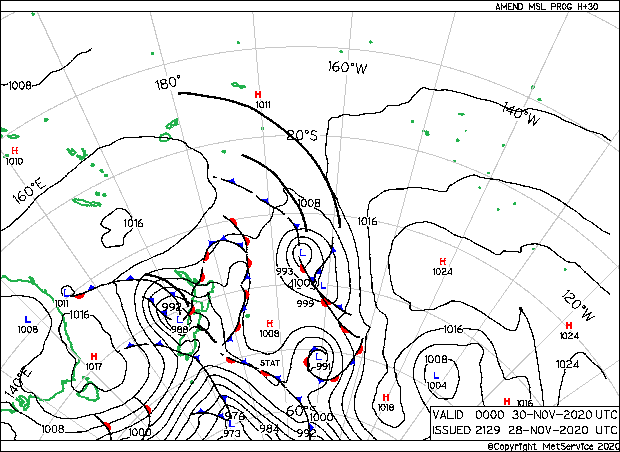 Rien ne vaut une bonne carte météo pour comprendre ce qui se passe. Vous voyez toutes ces dépressions (marquée d’un L pour Low) et notamment celle avec un minima à 998 hPa centrée sur le nord de l’île du Sud pas loin de la magnifique région des Marlborough Sounds où nous sommes. Elle va sans doute être rejointe par la dépression antarctique à 973 hPa qui se trouve sud. Du fait de la topographie montagneuse de l’île, tout çà donne du vent fort de sud-sud-ouest le long de la côte ouest devenant pratiquement ouest en atteignant le Cap Farewell tandis que côté est, c’est un vent de nord-est encore plus fort qui s’engouffre dans l’entonnoir du détroit de Cook. Les deux flux se rencontre pile-poil au dessus de nous. En fonction du déplacement de la dépression et du passage des front, la direction du vent sa force ainsi que la couverture nuageuse et les précipitation changent radicalement et très rapidement.