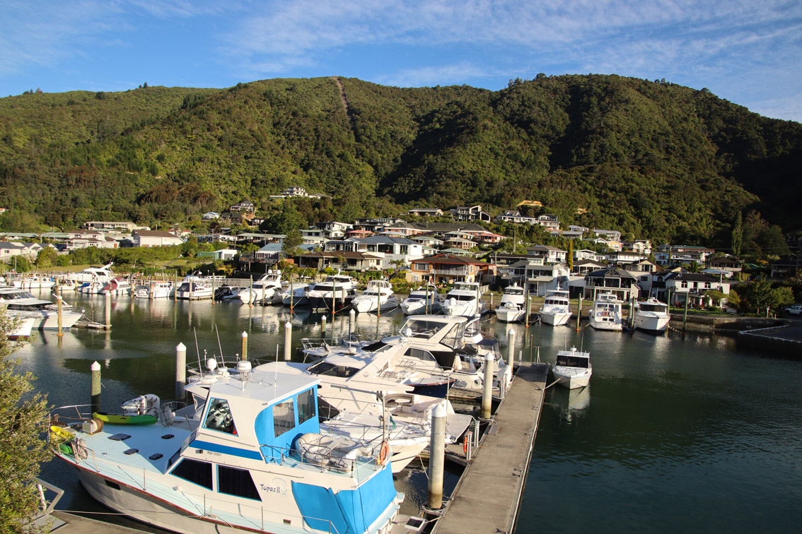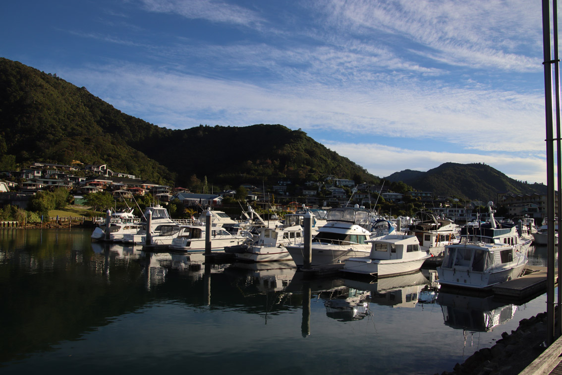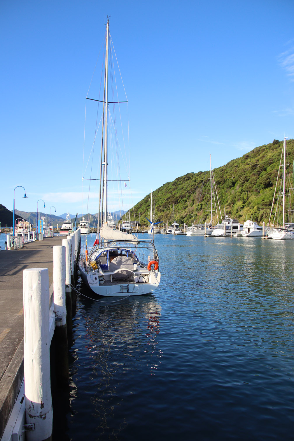 Les bateaux de plaisance de passage, s’arrêtent en principe à Waikama, la grande marina, 5 km à l’est de la ville. Mais quand nous les avions appelés avant de venir, ils nous ont dit qu’il n’avait plus de place et nous ont mis en contact avec la petite marina du centre ville de Picton qui dispose d’un grand bassin pour les bateaux à moteur (inaccessible pour nous à cause de la passerelle fixe qui enjambe l’entrée) et d’un avant port destiné aux professionnels et aux (très) grands bateaux. Ils sont pleins aussi mais ils nous trouvent une place à l’intérieur du quai juste à côté du terminal de la Cougar Line la compagnie de vedettes qui dessert le Queen Charlotte Sound. Avantage : on est en ville tout près des commerces et du supermarché Fresh Choice, pratique pour faire les courses et pour changer la bouteille de gaz, c’est juste là sur le quai. Inconvénient : il faut faire le tour du port à pied par la fameuse passerelle pour aller aux douches et puis on est le long d’un quai (au lieu d’un ponton) mais ce n’est pas vraiment un problème l’amplitude des marées ne dépassant pas 1 m par contre les vedettes se mettent en route vers 7 heures et leurs gros diesels sont bien bruyants (leur « vacium cleaner »(aspirateur), aussi).