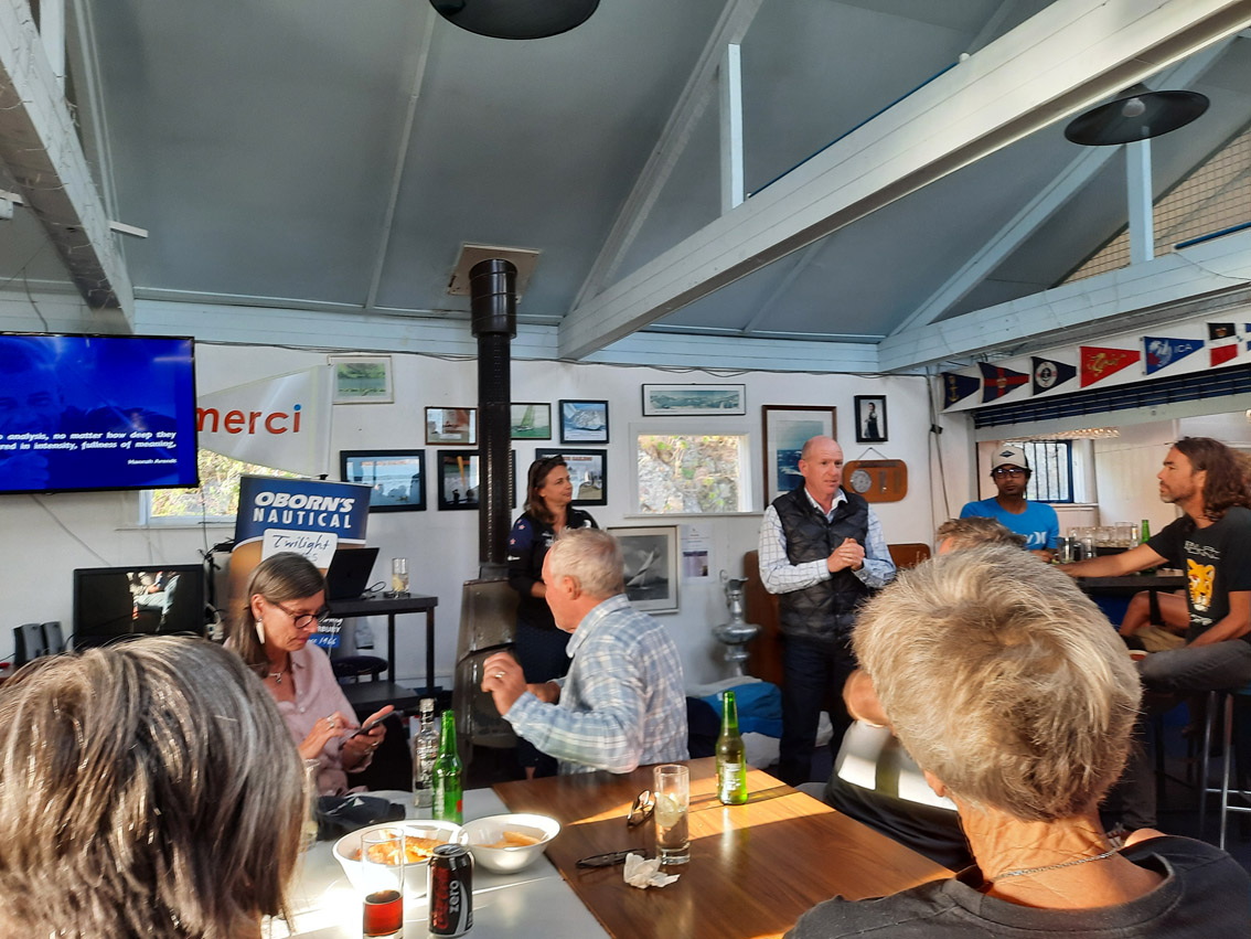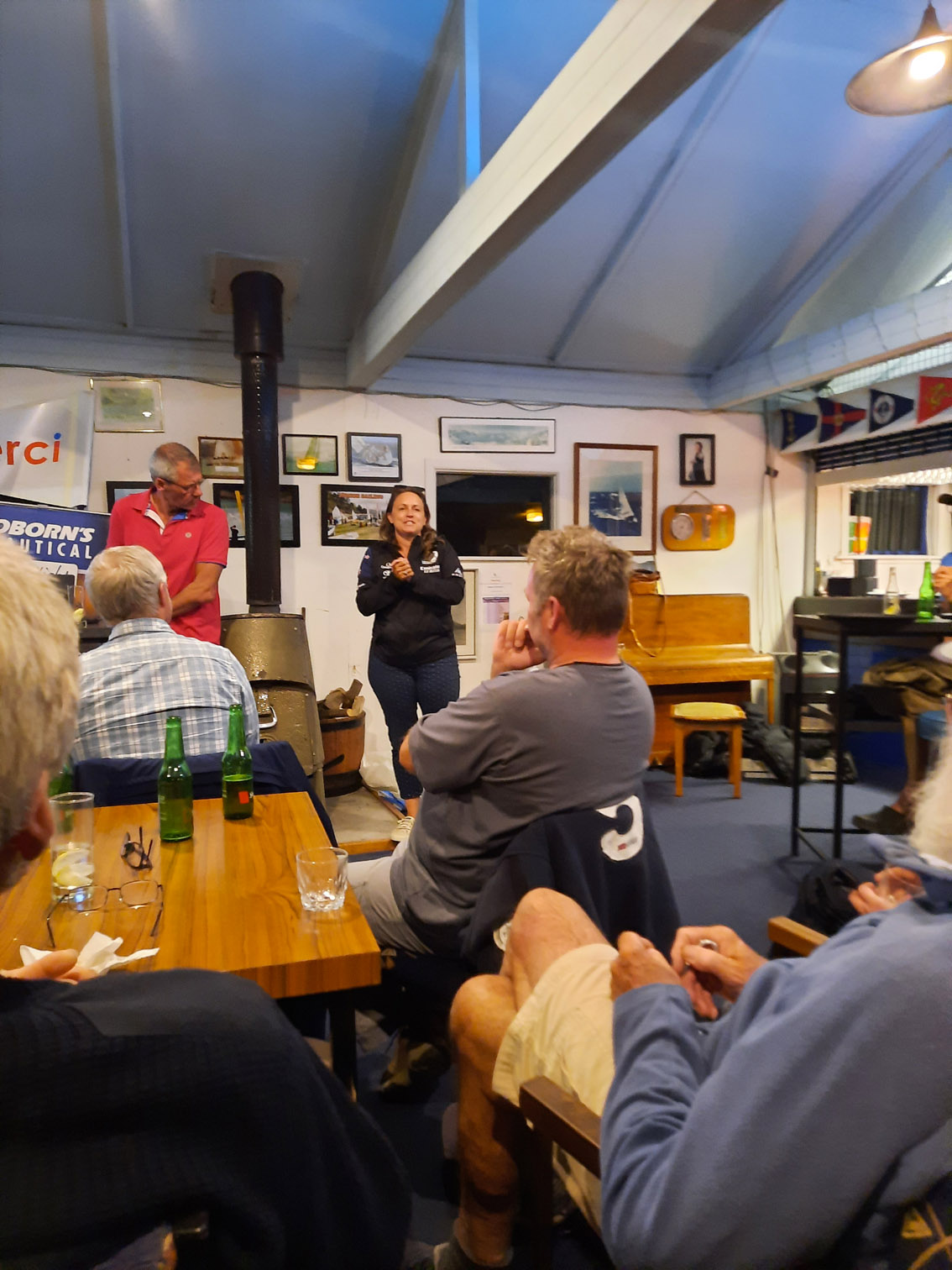 L’après-midi même, Laurie et Benji passent nous voir avec du pain frais (elle est boulangère et prof de boulangerie) et des légumes (Benji a un ami maraîcher) et nous préviennent que Sébastien donne un conférence ce soir au Yacht Club
