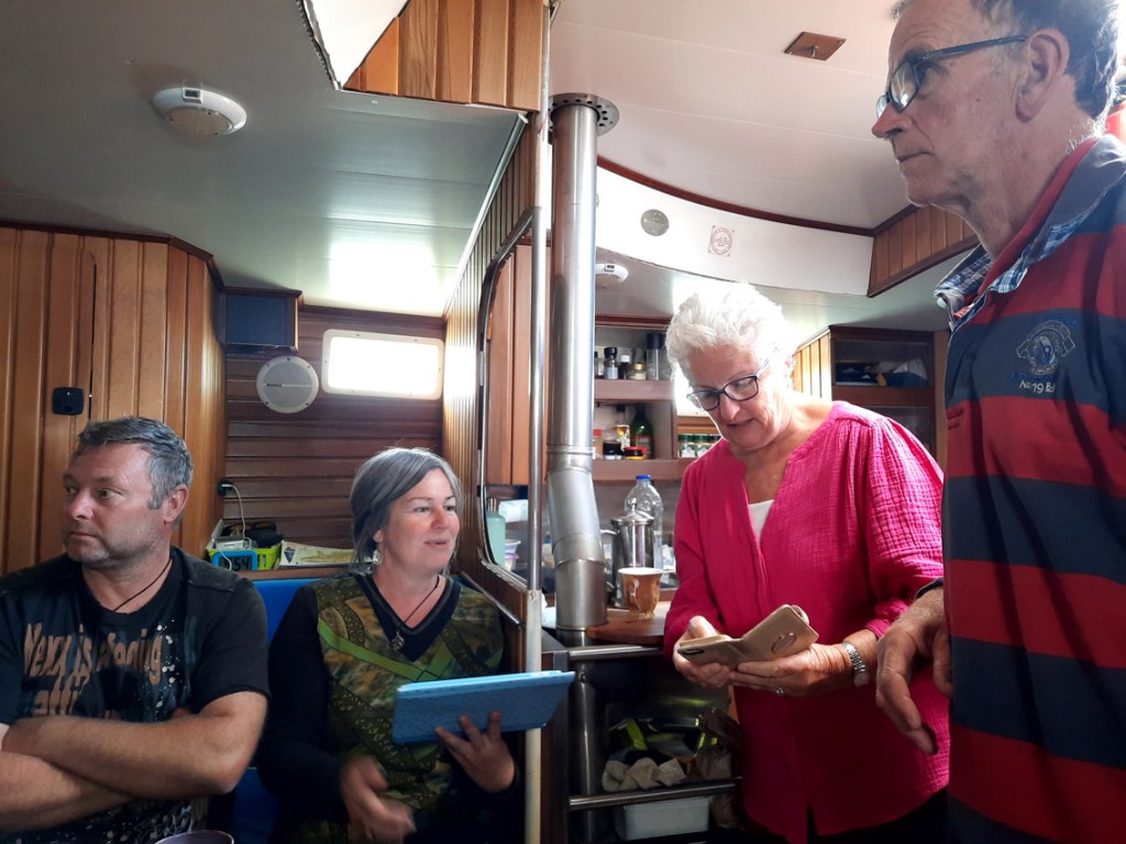 Pour monter à bord du bateau nous avons besoin d’un masque , depuis hier nous sommes en niveau 2 , en Nouvelle Zélande ils ont trouvé un cas de covid 19 . Finalement nous restons à l’extérieur ce qui nous permet de ne pas garder le masque