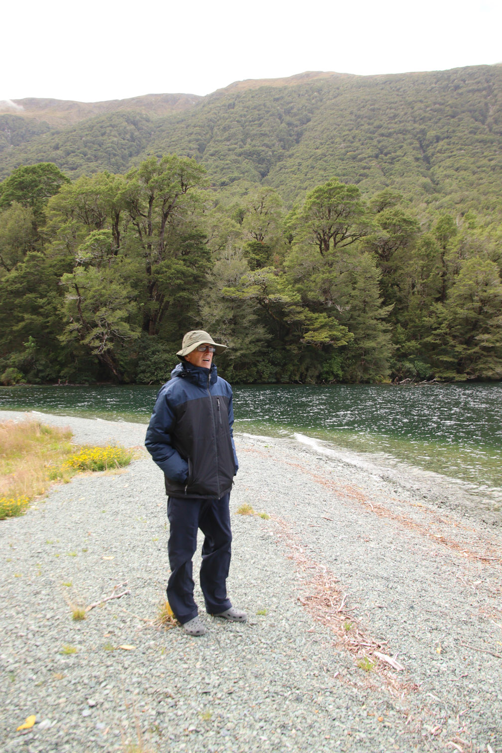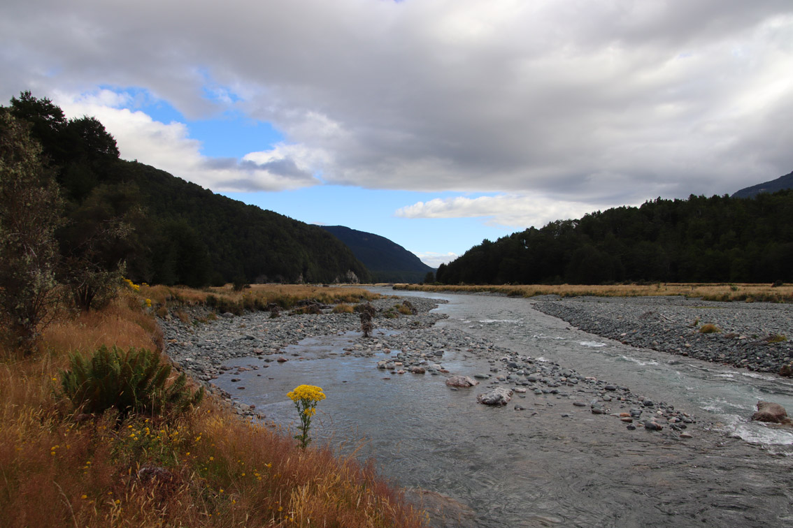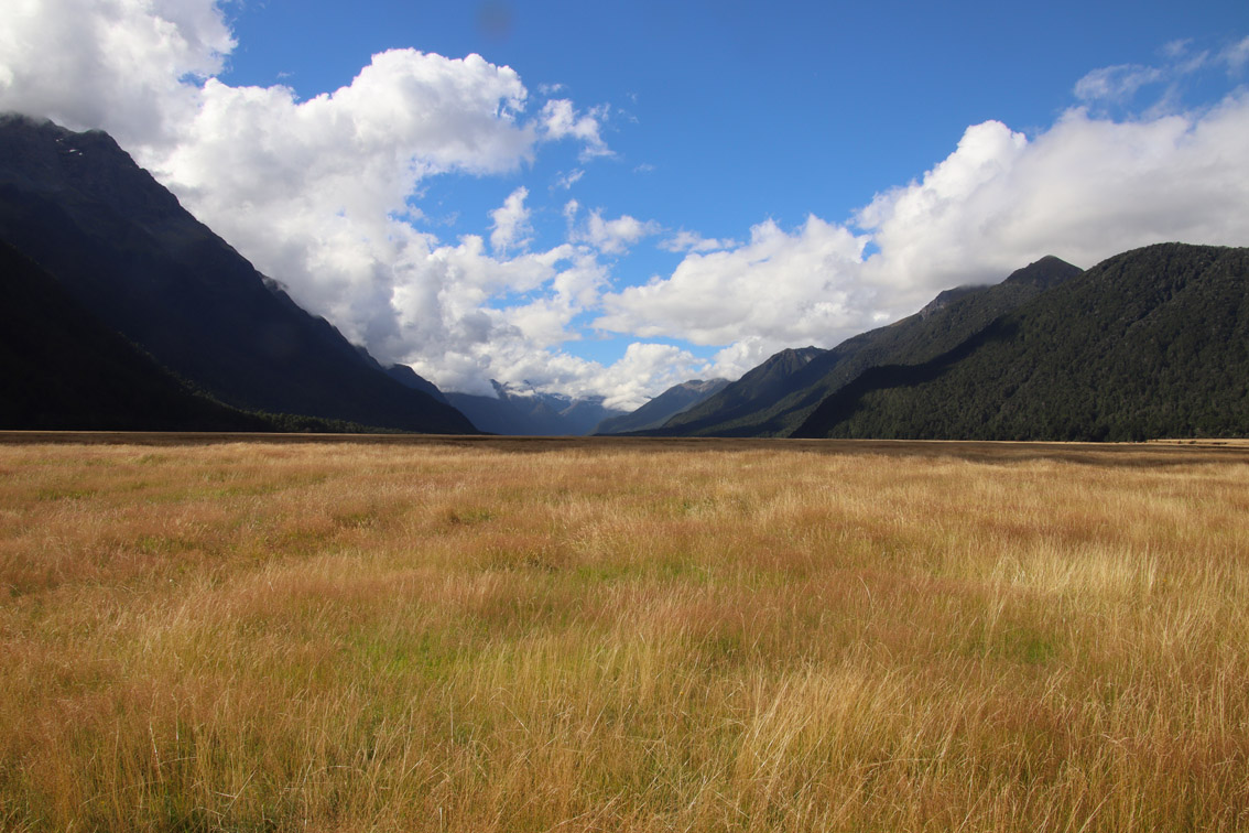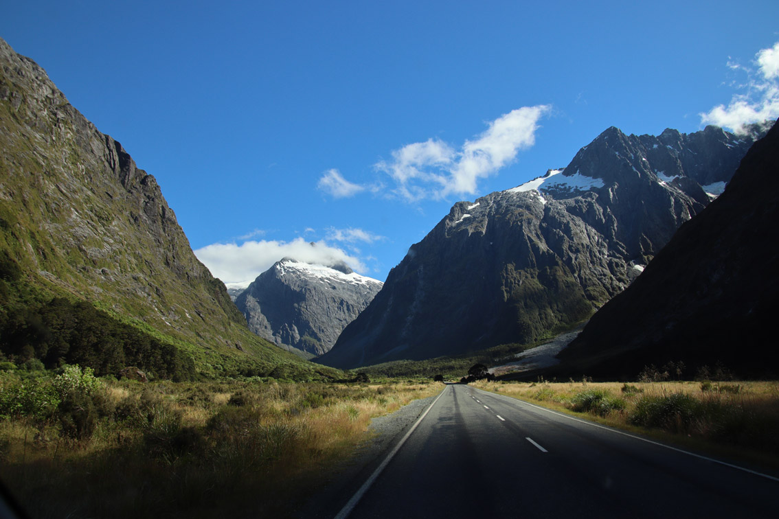 Passé Te Anau (un peu trop vite: attention au radar) nous entrons dans cette grande vallée qui mène au Milford Sound. Nuit dans un camping pour nous tout seul au bord de la rivière