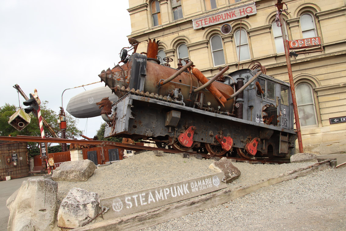 Encore un petit détour avant de quitter Otago: Oamaru. C’est une ville très particulière qui mélange l’architecture victorienne avec ses façades à colonnades et le style « mad max »/steam punk qui crée des oeuvres d’art originales à partir d’anciennes machines.