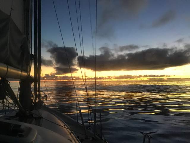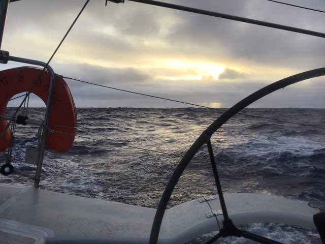 Comme nous vous l’annoncions dans le dernier post, depuis deux jours nous bénéficions d’un sympathique 10/13 nds de vent travers sur une longue houle de plus de 3 mètres, nous permettant d’avancer très confortablement entre 5 et 7 nds . Mais depuis cette nuit minuit Neptune semble s’être un peu épuisé et son soufle à bien diminué. Pas très grave nous profitons de ce temps calme pour bien dormir. Mais au levé du soleil, pour ne pas gâcher la petite brise matinale on s’active pour envoyer le spi. c’est que du bonheur quant nous sortons cette voile qui redonne de la puissance au bateau pour escalader la grosse houle qui elle n’a pas faiblit . Devant nous une perturbation passe et on aurait bien aimer attraper sa queue et profiter ainsi avec son vent favorable et nous rapprocher plus rapidement du but. Mais elle va beaucoup plus vite que nous et il va donc falloir composer avec des vents faibles pour les prochains jours ( en gros on a fait le choix du confort et de la sécurité, ce sera donc dur de battre des records de vitesse- le beurre ou l’argent du beurre….).