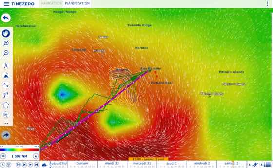 Réflexion faite ce ne serait pas une bonne idée de sarrêter sur lîle de Rapa ( pourtant cela nous aurai bien plu). dune part le mouillage ny est pas très bon (cest un vrais courant dair qui accélère le vent) et dautre part la dépression risque dy être la plus forte à son passage. Lautre solution est de mettre la gomme pour arriver avant elle et nous mettre à labri dans le mouillage de Rikitéa qui lui, serait très très sûr. Dés que le vent molli de trop pour escalader la grosse houle Nous sollicitons le moteur à bas régime pour appuyer les voiles. Visiblement Eole nest pour linstant pas avec nous et il doit être trés contrarié car non seulement il ne souffle pas assez fort mais il change de force et de direction toutes les deux minutes nous obligeant à rester le nez rivé les instruments. Compte tenu de la situation nous essayons de rester autant que faire ce peut sur la route directe, le chemin le plus cout et sans doute le plus rapide. Nous réglons les voiles et ajustons le cap constamment pour profiter au maximum des conditions du moment. Daprès nos derniers routages, larrivée devrait se faire le weekend prochain avec du vent, si tout se passe bien, et même si nous sommes encore au près à tirer des bords, nous devrions pouvoir arriver les premiers surtout quentre temps les derniers gribs se montrent moins catastrophiques que celui du 26 mars qui illustre cet article. à suivre….