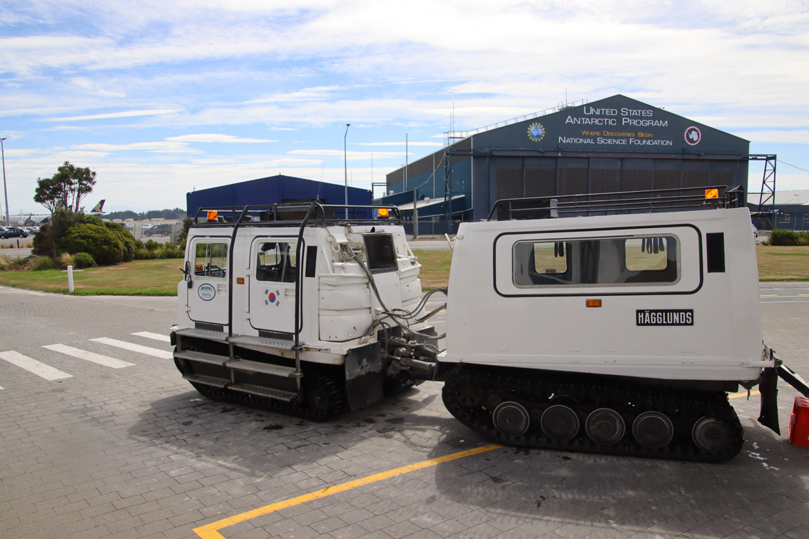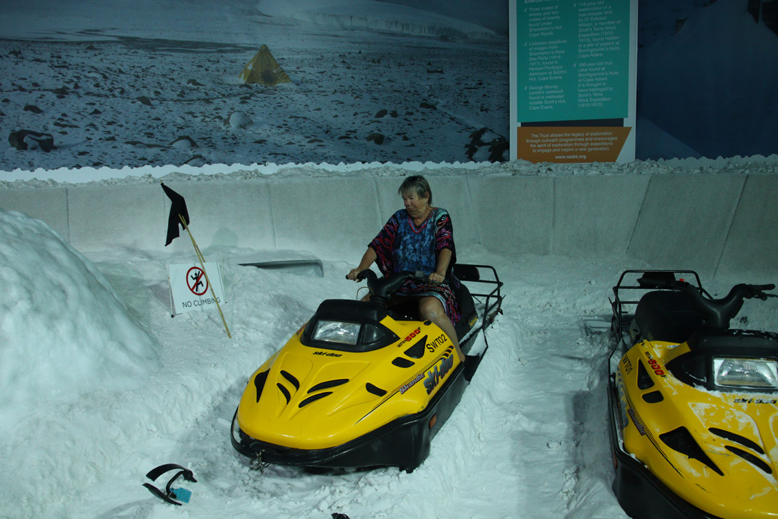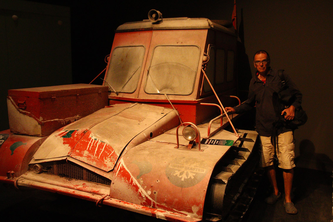 Nous commençons par un petit tour en chenillette Haglund sensé nous montrer comment les scientifiques se déplacent sur les terrains difficiles qui entourent le pôle sud mais qui ne présente pas plus d’intérêt qu’une attraction foraine puisque le tour se fait sur une piste aménagée derrière l’aéroport. On peut aussi se poser la question du bilan carbone d’une telle démonstration reproduite toute les 15’…
