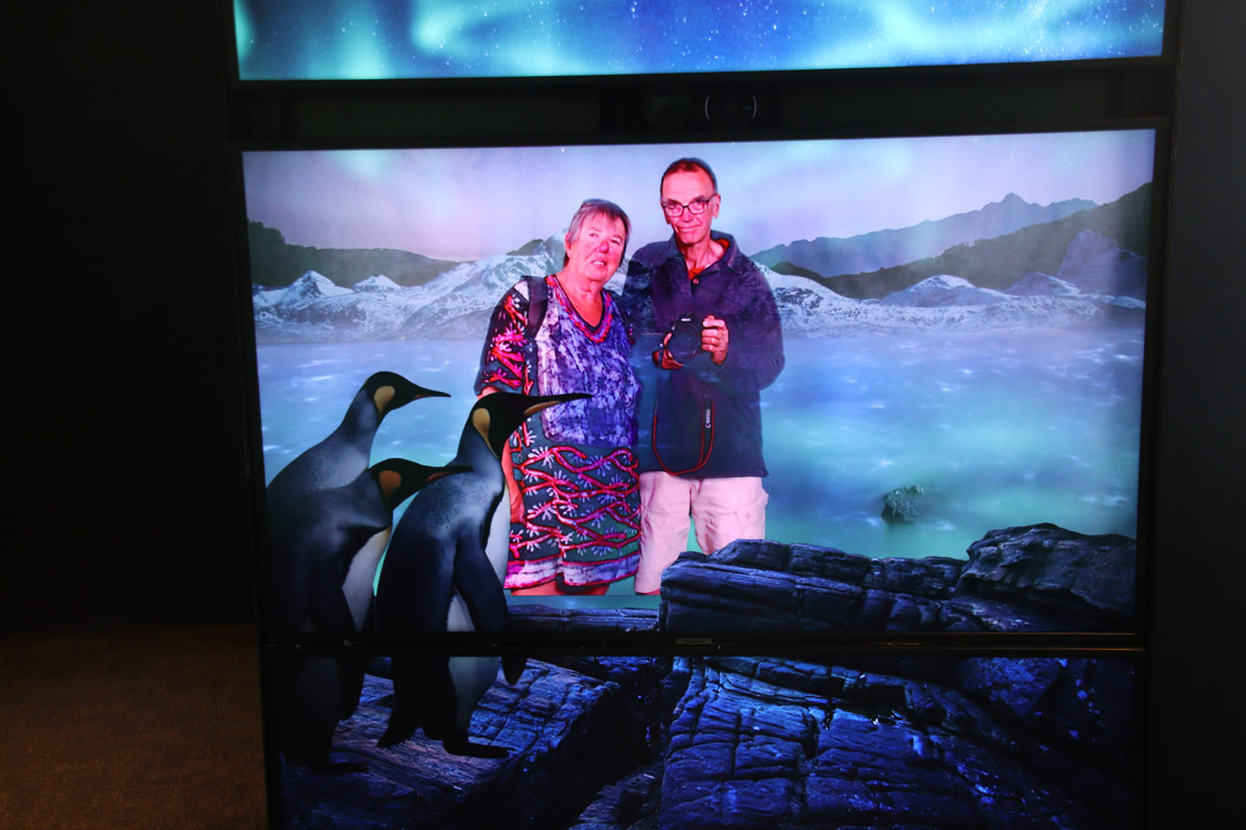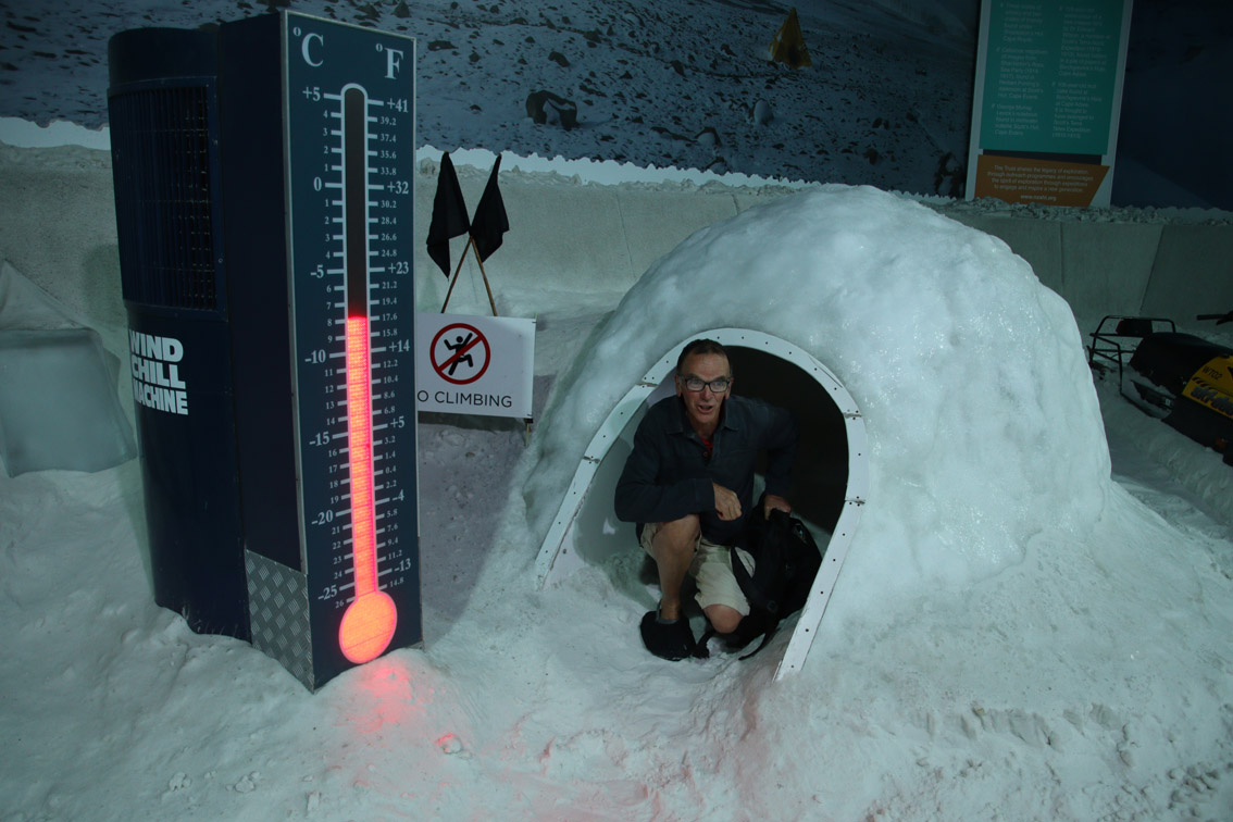 Seconde attraction, le simulateur reproduisant les conditions d’un coup de vent de nuit sur la banquise . C’est une salle aménagée à l’intérieur du musée. Nous sommes, moi en robe d’été et Domi en short et teeshirt. Au bout de quelques minutes nous nous empressons de sortir complètement frigorifiés et très déçu par cette animation aussi . Le film qui suit est en 4 D (3D + la neige et les embruns) et plus intéressant , les vue de l’Antarctique et de son approche par la mer sont magnifiques. Le deuxième film est une animation un peu débile d’un pingouin sur une piste de bobsleigh dont le seul but est de promouvoir un jeux vidéo en vente à la boutique de souvenirs . Bof…