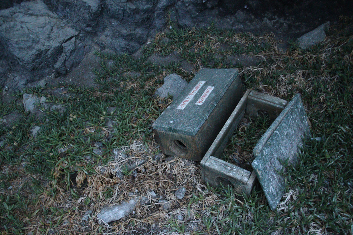 Nous nous dissimulons dans les rochers pour attendre que la nuit soit complétement tombée et assister au retour des parents. Mais notre attente sera vaine. Personne ne viendra cette nuit. Bizarre… En explorant les rochers autours des nids on trouve pas mal de crottes d’opossums qui semblent assez récentes. Nous espérons que les petits étaient déjà en mesure de prendre la mer avant que ces prédateurs ne vienne perturber cette colonie .