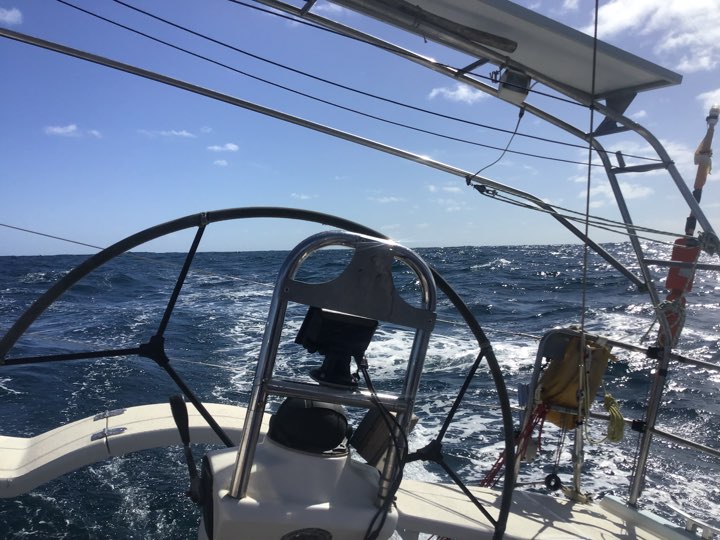 Pas de mont Cook se détachant sur l’horizon pour un dernier clin d’oeil. Il est à peine 17 heure et la côte à déjà disparue dans les nuages de pluie. Le vent tourne au sud comme prévu en se renforçant aplatissant la houle du nord mais s’est seulement pour y mélanger la sienne. Après un mois à terre nos estomacs sont un peu à la peine pour s.accommoder au mouvements désordonnés de Rêve à Deux. Heureusement il y a les albatros qui nous accompagnent rasant la crête des vagues de leur envergure majestueuse. On arrive tout de même à préparer notre repas du soir saucisses broccolis quel’on mange avec appétit. A la tombée de la nuit le vent monte encore 27 nds avec rafales à 32: 2 ris dans la GV et trinquette à’lavant. Pas très confortable mais çà avance. On retrouve notre rythme de quarts flexible et la nuit puis la matinée se passent sans incident à part un peu de kelp dans l’hydro et le joint de la pompe de toilettes vite réparés. Pour les première 24 heures, nous avons parcouru 154 milles. C’est toujours çà de pris. Pour nous récompenser la grisaille fait place à un beau ciel bleu et le vent descend d’un cran ce qui nous permet de renvoyer de la toile. Par contre on est presque au prés ce qui n’est pas très confortable mais il va bien falloir s’y habituer, on en a encore pour 2700 milles….