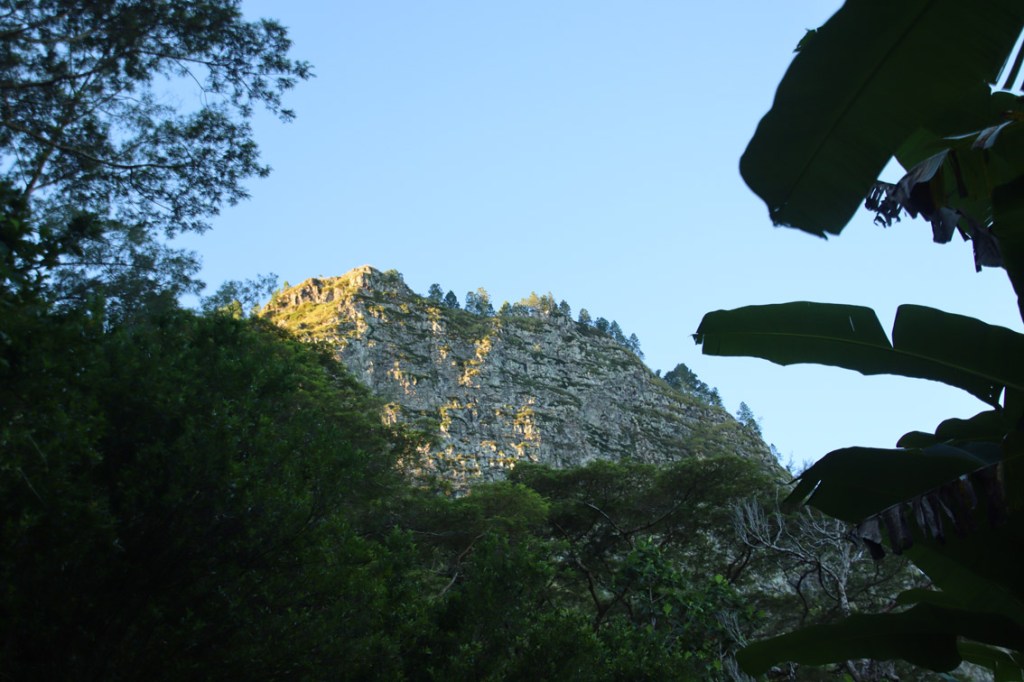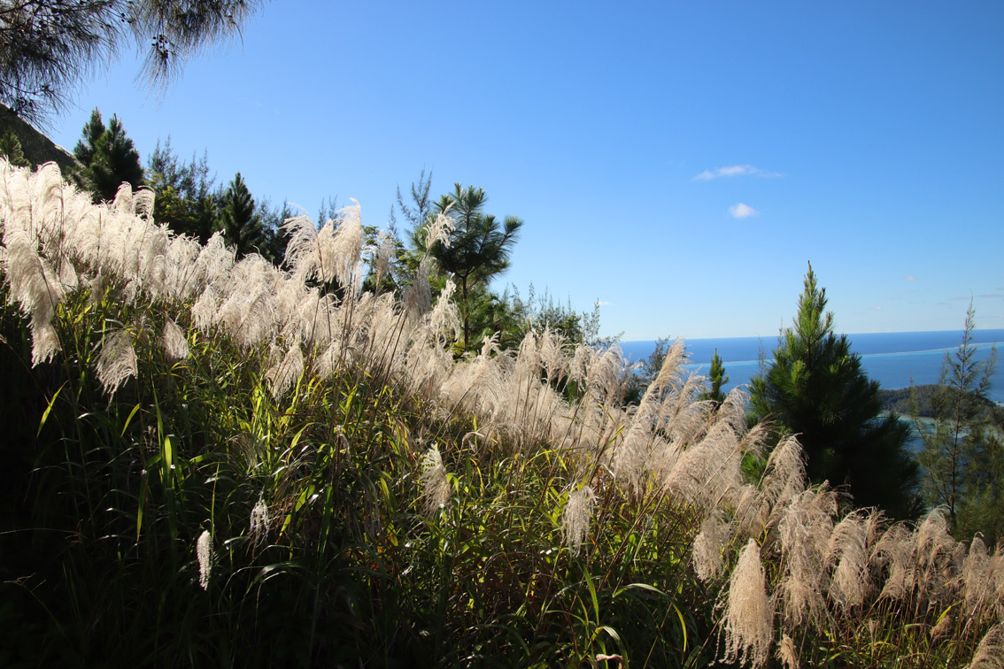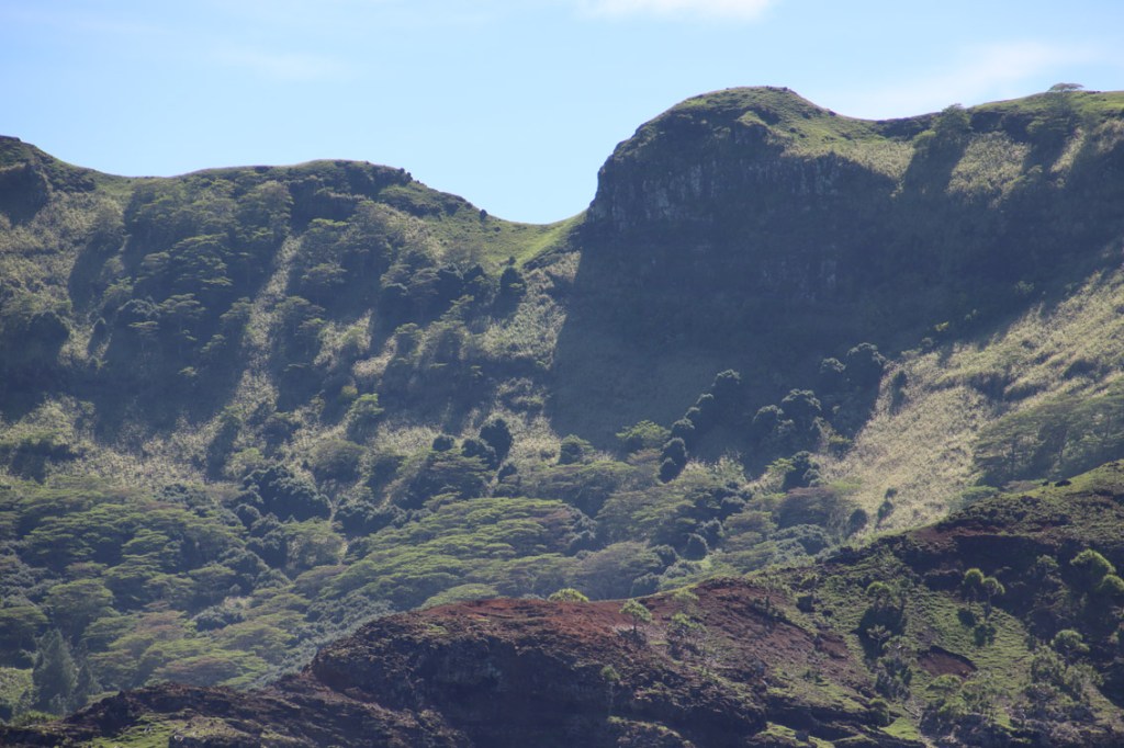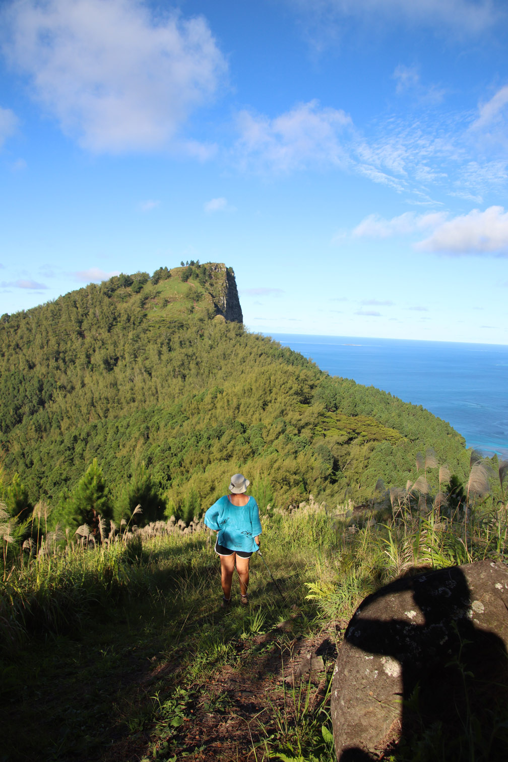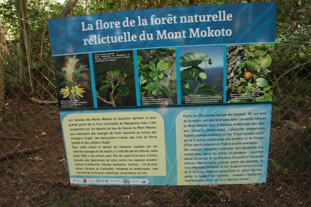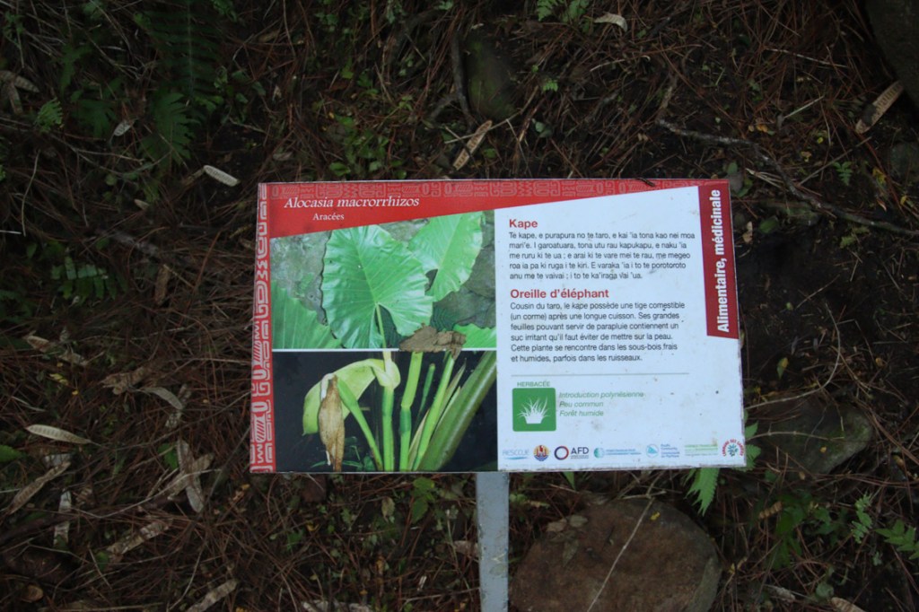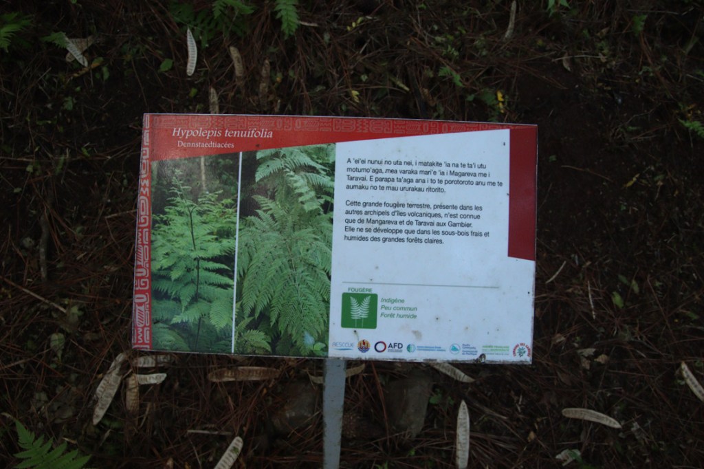 Ce sentier commence juste de l’autre côte du col qui surplombe Rikitea. Par chance un pick-up s’arrête dès la sortie du village nous emmène directement à l’entrée du sentier: tant mieux la montée par la route n’est pas la partie la plus agréable. Le sentier qui démarre au bord de la route sur les contrefort de la face sud du mont passe devant les ruines d’un Marae , à travers d’anciens vergers en friches puis une forêt de sapin qui fait place à des roseaux de montagne quand on approche du sommet. La face nord consiste quand à elle en une falaise basaltique verticale. Cette falaise est séparée de sa jumelle du mont Duff par une vallée luxuriante. C’est par là que nous redescendrons.