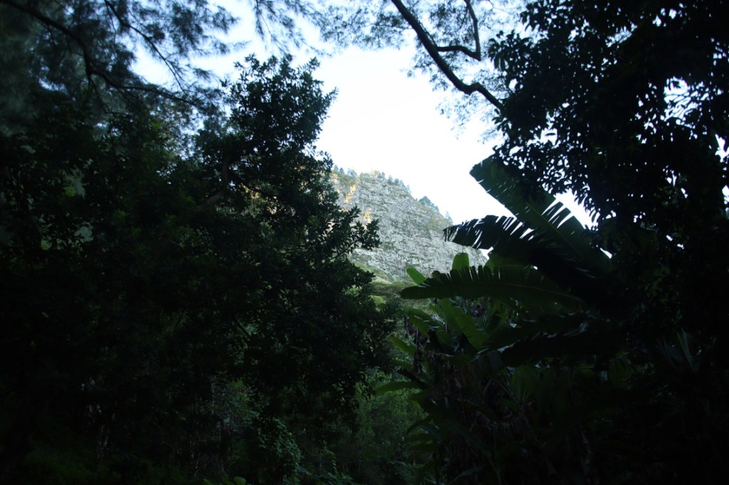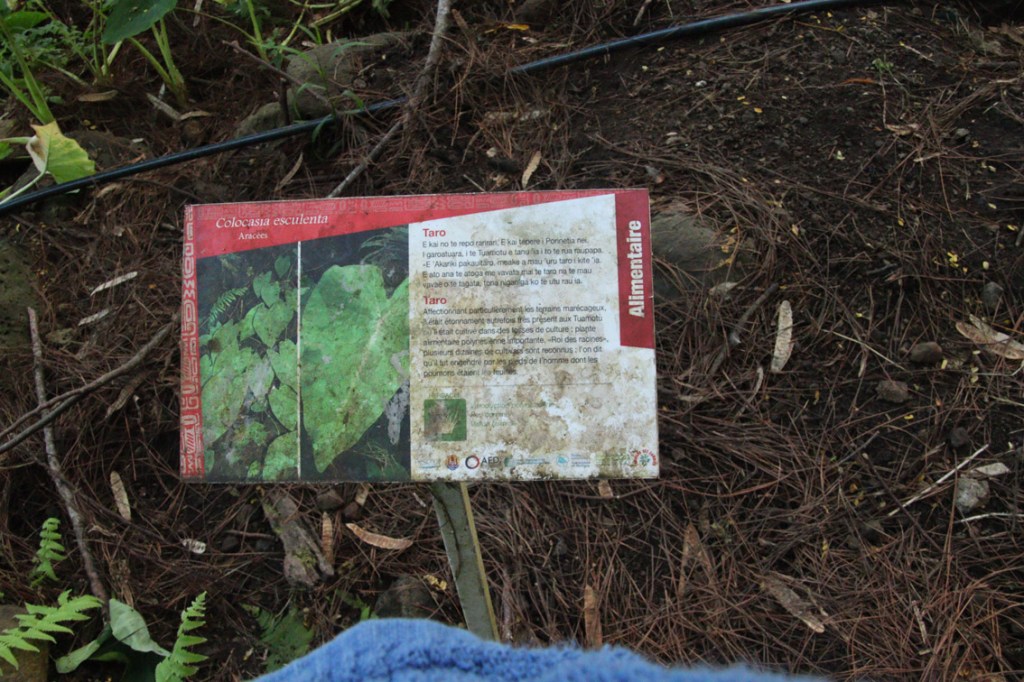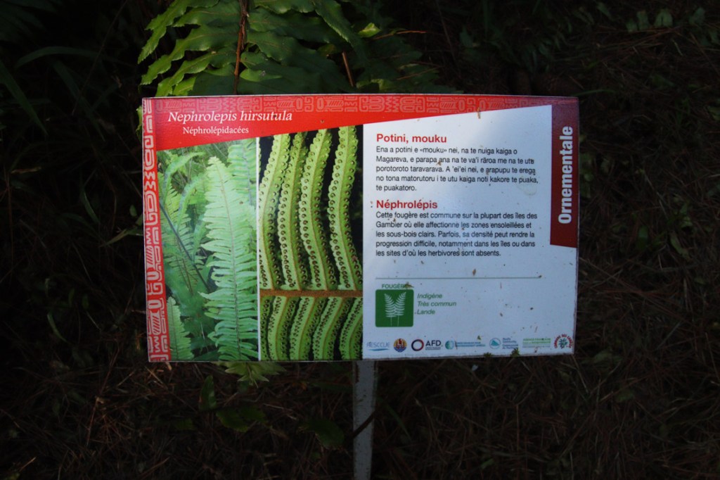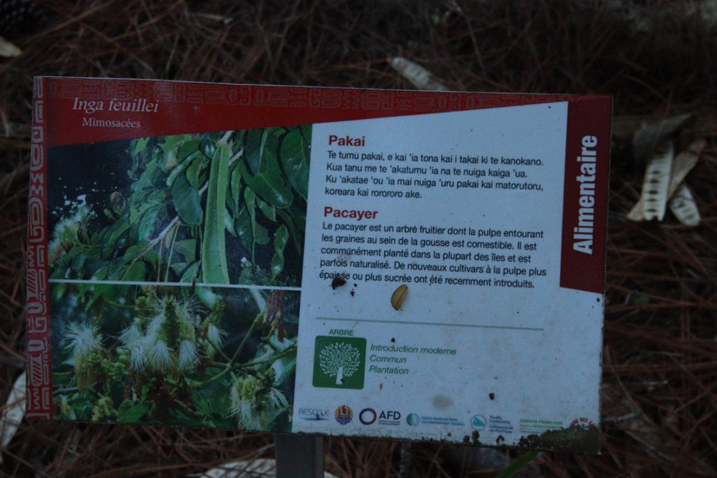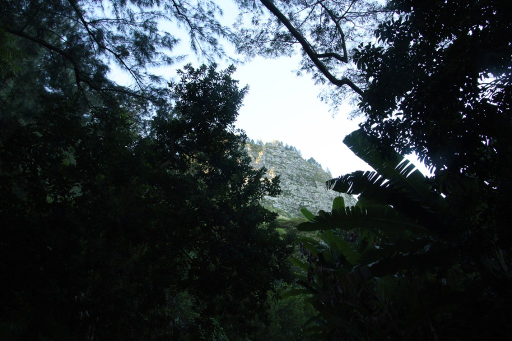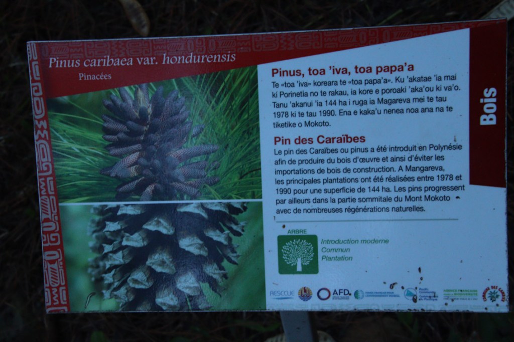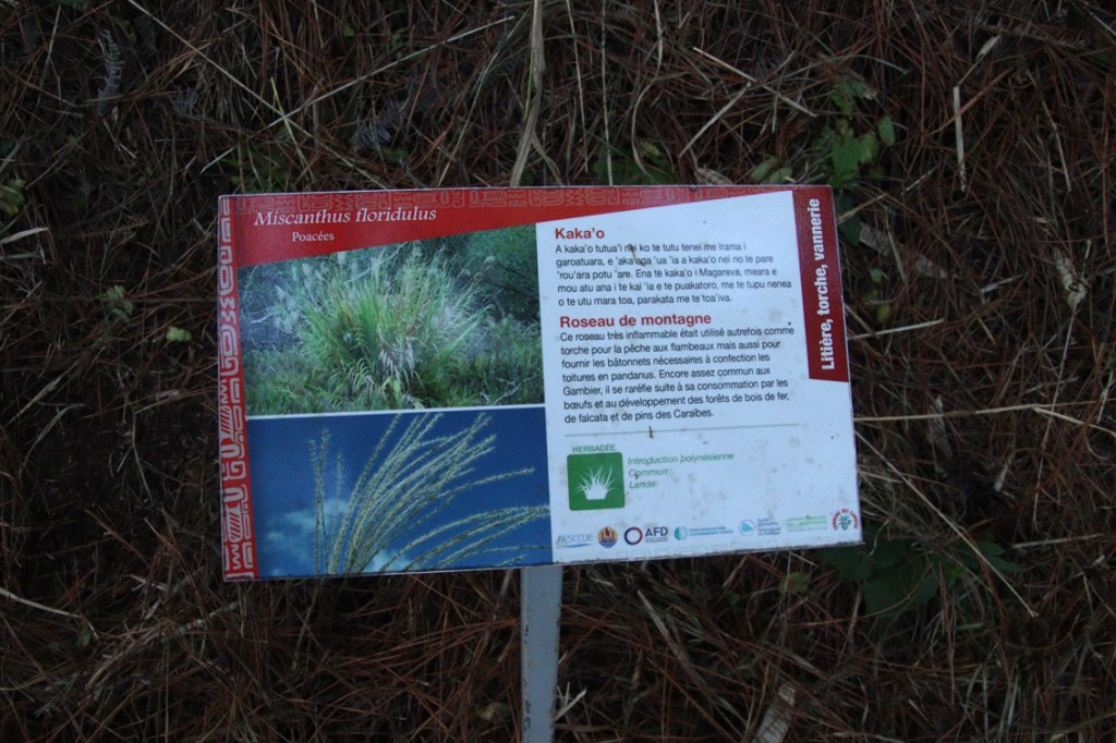 Ce sentier commence juste de l’autre côte du col qui surplombe Rikitea. Par chance un pick-up s’arrête dès la sortie du village nous emmène directement à l’entrée du sentier: tant mieux la montée par la route n’est pas la partie la plus agréable. Le sentier qui démarre au bord de la route sur les contrefort de la face sud du mont passe devant les ruines d’un Marae , à travers d’anciens vergers en friches puis une forêt de sapin qui fait place à des roseaux de montagne quand on approche du sommet. La face nord consiste quand à elle en une falaise basaltique verticale. Cette falaise est séparée de sa jumelle du mont Duff par une vallée luxuriante. C’est par là que nous redescendrons.