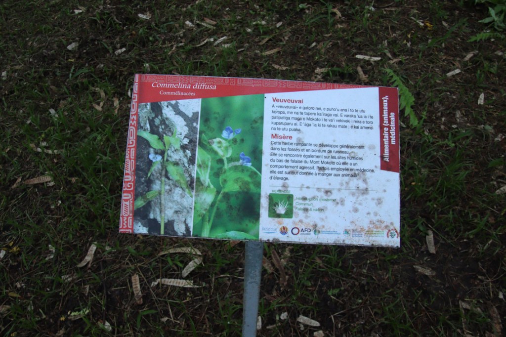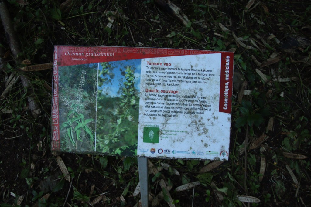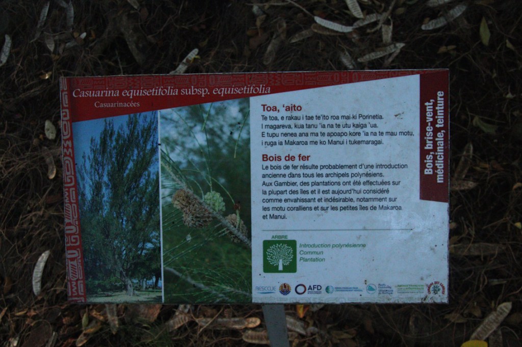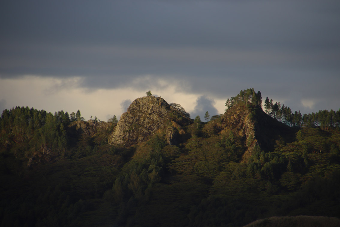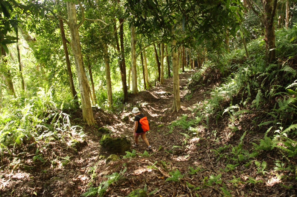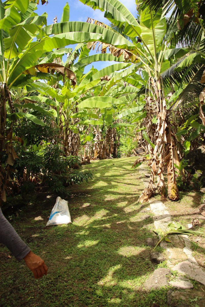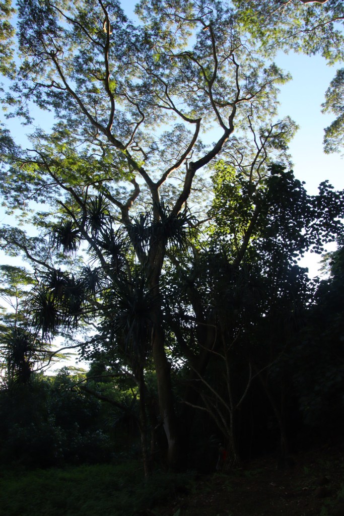 Ce sentier commence juste de l’autre côte du col qui surplombe Rikitea. Par chance un pick-up s’arrête dès la sortie du village nous emmène directement à l’entrée du sentier: tant mieux la montée par la route n’est pas la partie la plus agréable. Le sentier qui démarre au bord de la route sur les contrefort de la face sud du mont passe devant les ruines d’un Marae , à travers d’anciens vergers en friches puis une forêt de sapin qui fait place à des roseaux de montagne quand on approche du sommet. La face nord consiste quand à elle en une falaise basaltique verticale. Cette falaise est séparée de sa jumelle du mont Duff par une vallée luxuriante. C’est par là que nous redescendrons.
