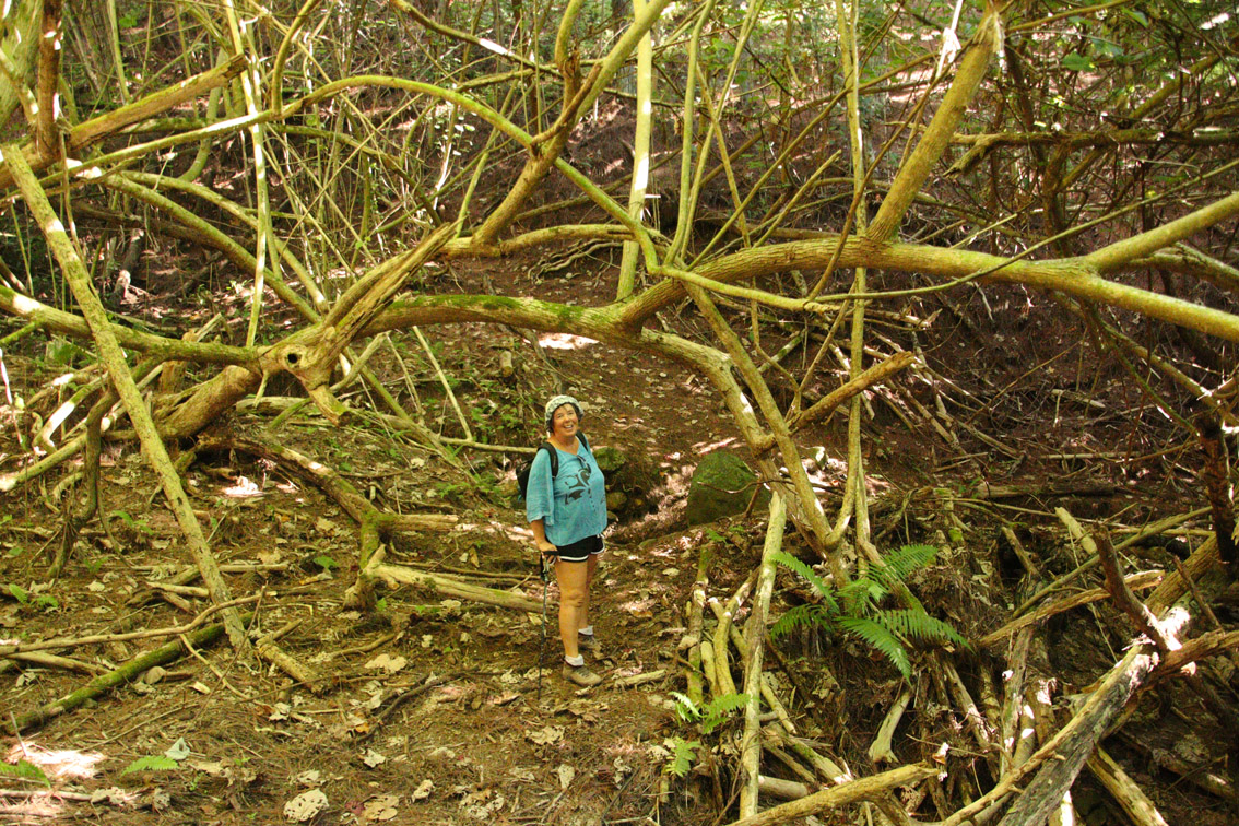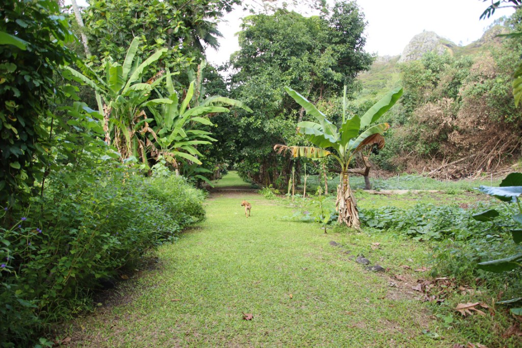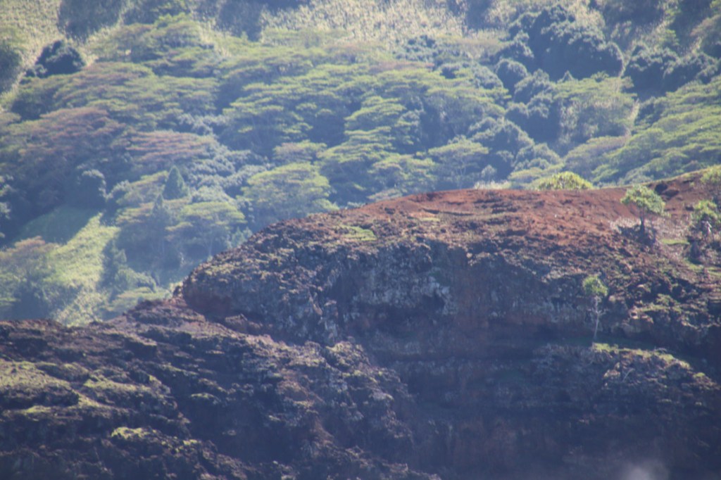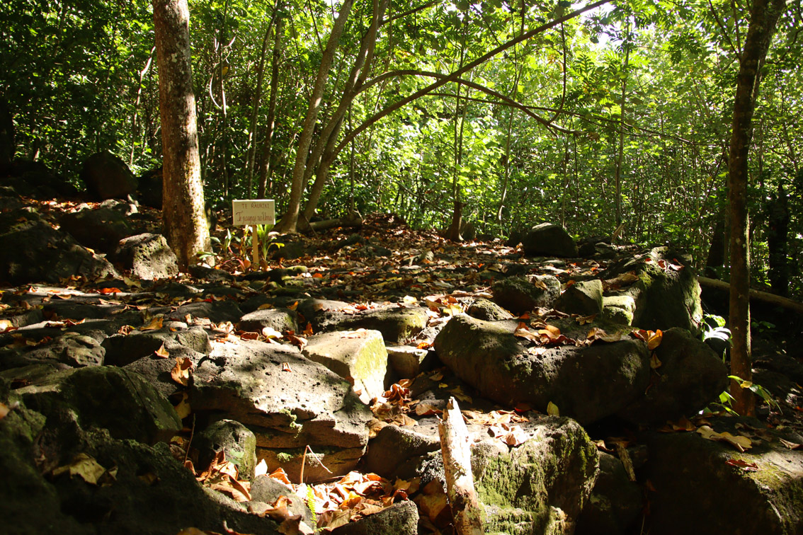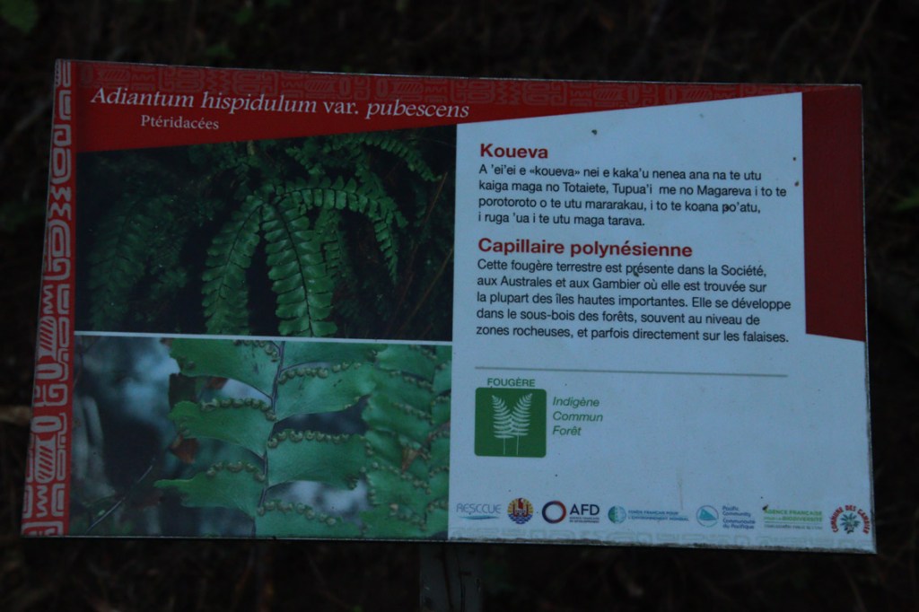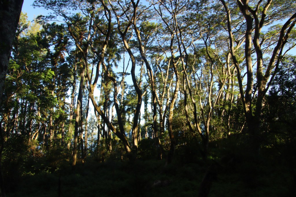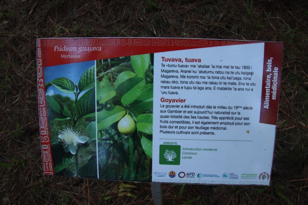 Ce sentier commence juste de l’autre côte du col qui surplombe Rikitea. Par chance un pick-up s’arrête dès la sortie du village nous emmène directement à l’entrée du sentier: tant mieux la montée par la route n’est pas la partie la plus agréable. Le sentier qui démarre au bord de la route sur les contrefort de la face sud du mont passe devant les ruines d’un Marae , à travers d’anciens vergers en friches puis une forêt de sapin qui fait place à des roseaux de montagne quand on approche du sommet. La face nord consiste quand à elle en une falaise basaltique verticale. Cette falaise est séparée de sa jumelle du mont Duff par une vallée luxuriante. C’est par là que nous redescendrons.