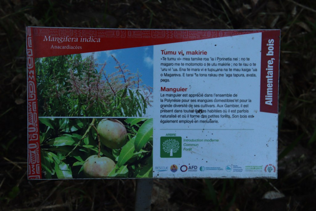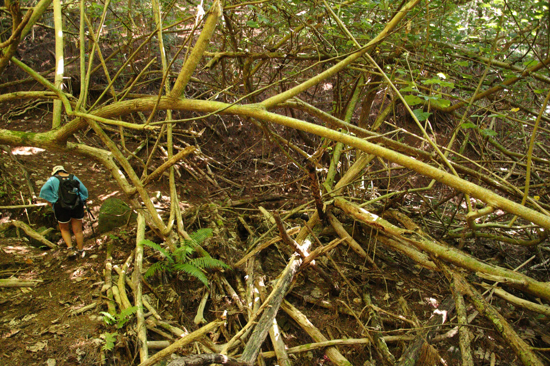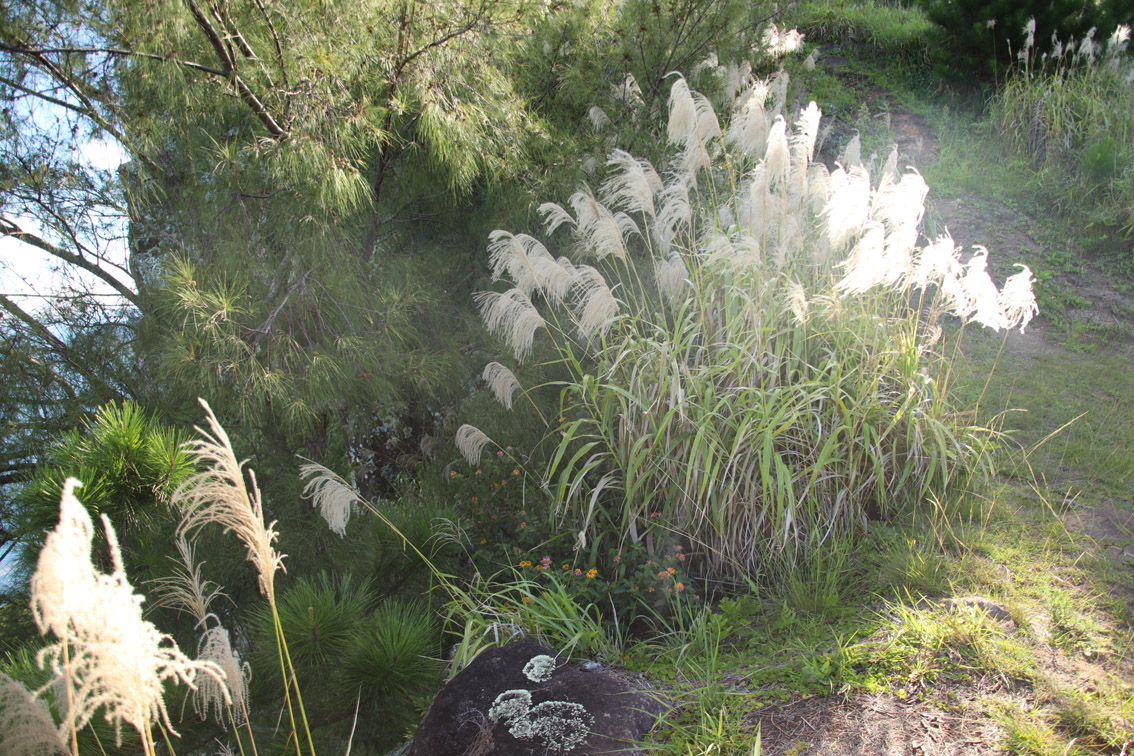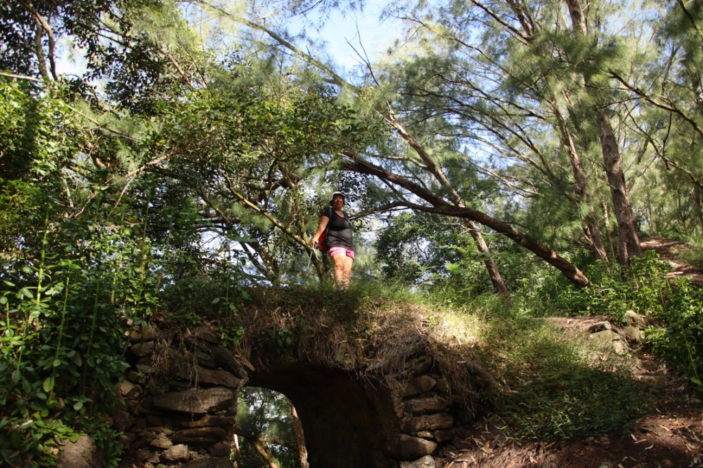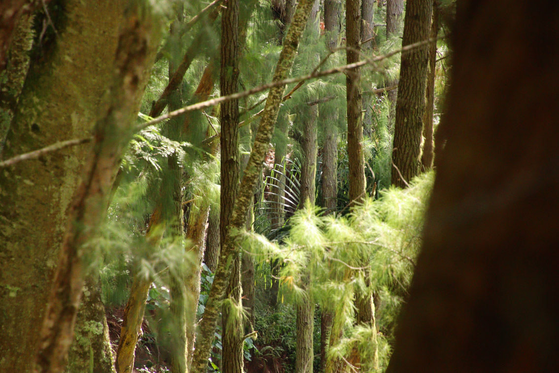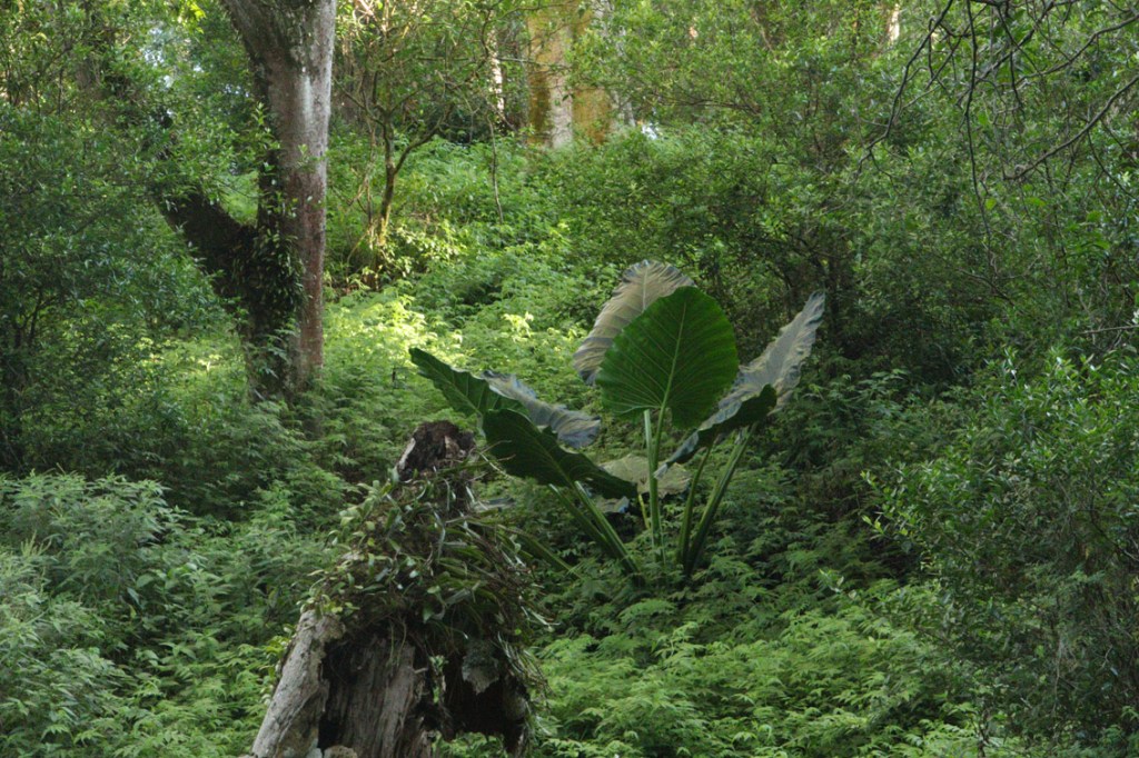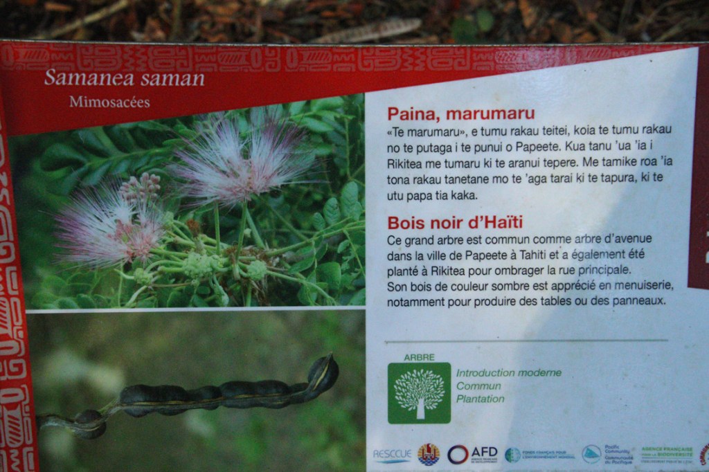 Ce sentier commence juste de l’autre côte du col qui surplombe Rikitea. Par chance un pick-up s’arrête dès la sortie du village nous emmène directement à l’entrée du sentier: tant mieux la montée par la route n’est pas la partie la plus agréable. Le sentier qui démarre au bord de la route sur les contrefort de la face sud du mont passe devant les ruines d’un Marae , à travers d’anciens vergers en friches puis une forêt de sapin qui fait place à des roseaux de montagne quand on approche du sommet. La face nord consiste quand à elle en une falaise basaltique verticale. Cette falaise est séparée de sa jumelle du mont Duff par une vallée luxuriante. C’est par là que nous redescendrons.