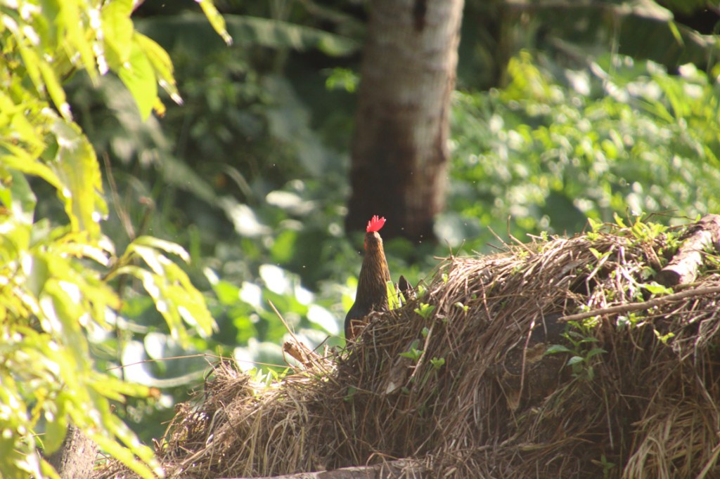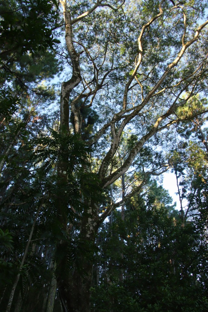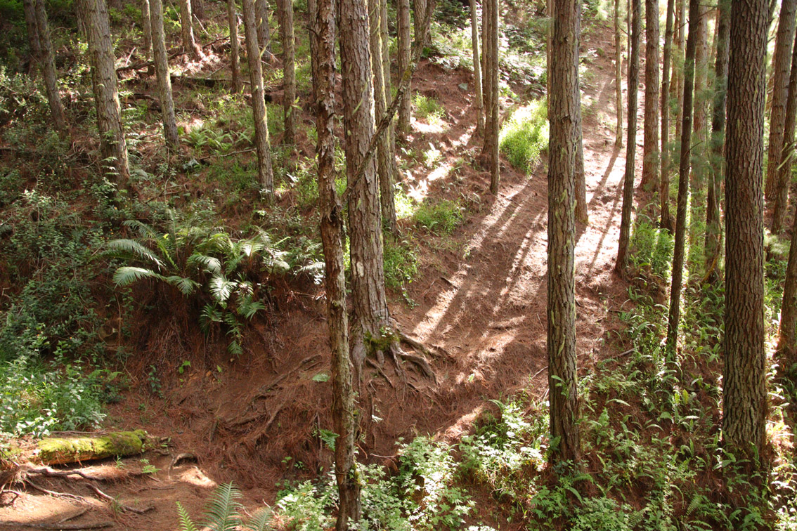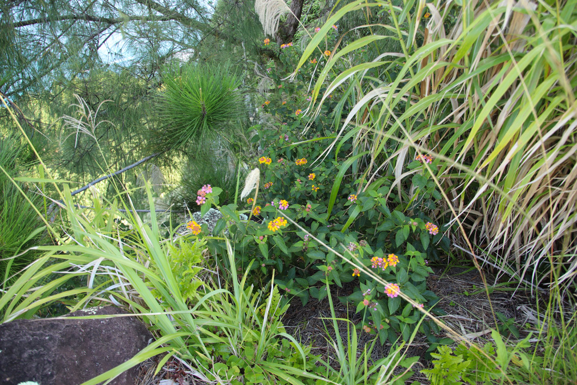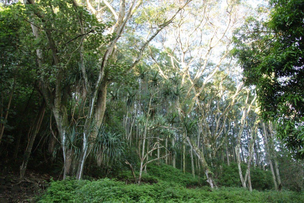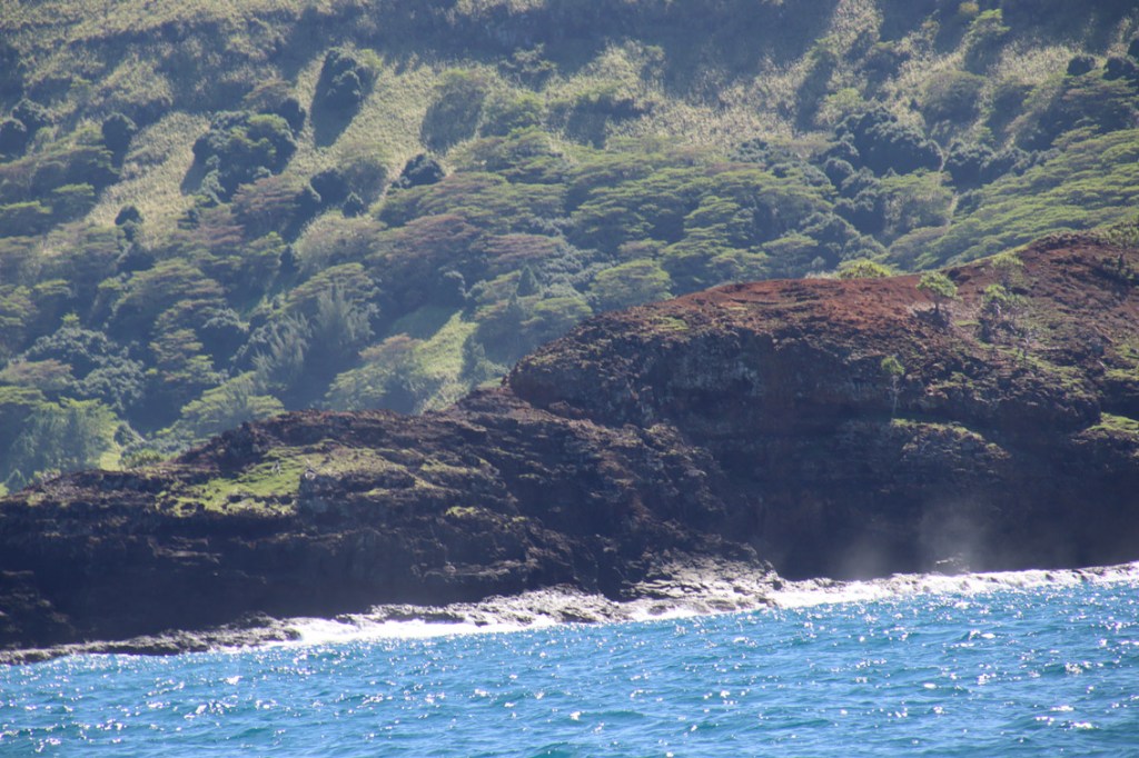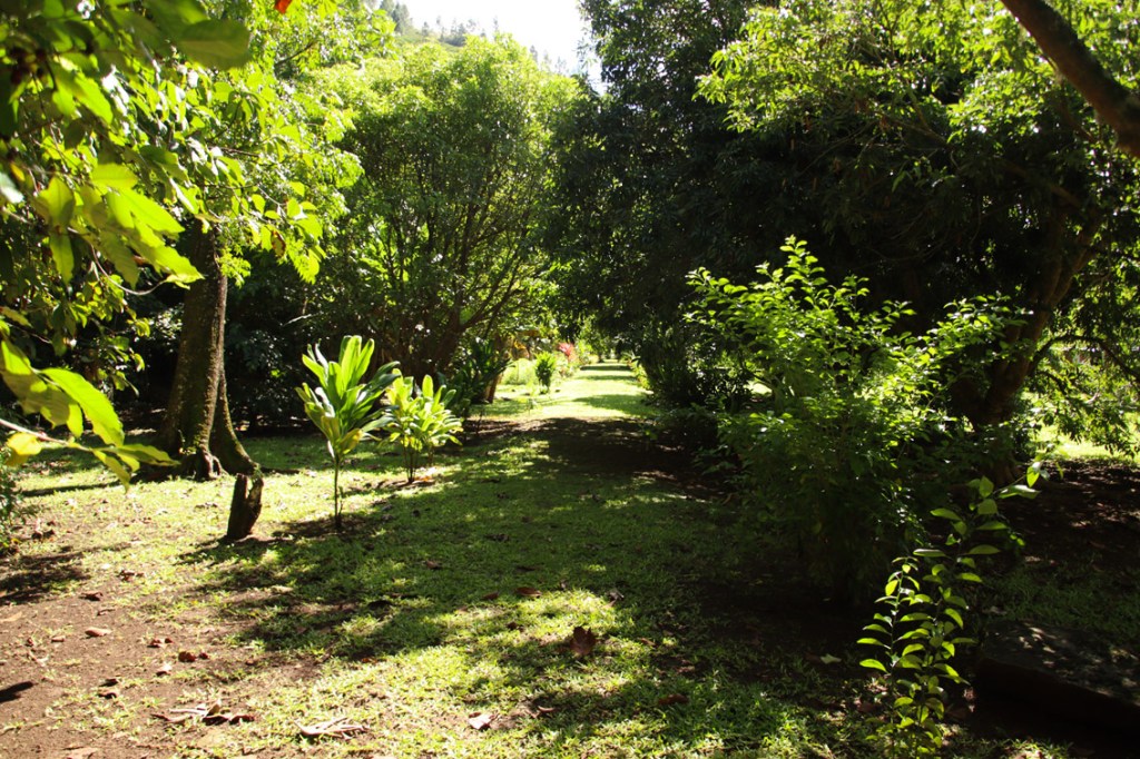 Ce sentier commence juste de l’autre côte du col qui surplombe Rikitea. Par chance un pick-up s’arrête dès la sortie du village nous emmène directement à l’entrée du sentier: tant mieux la montée par la route n’est pas la partie la plus agréable. Le sentier qui démarre au bord de la route sur les contrefort de la face sud du mont passe devant les ruines d’un Marae , à travers d’anciens vergers en friches puis une forêt de sapin qui fait place à des roseaux de montagne quand on approche du sommet. La face nord consiste quand à elle en une falaise basaltique verticale. Cette falaise est séparée de sa jumelle du mont Duff par une vallée luxuriante. C’est par là que nous redescendrons.