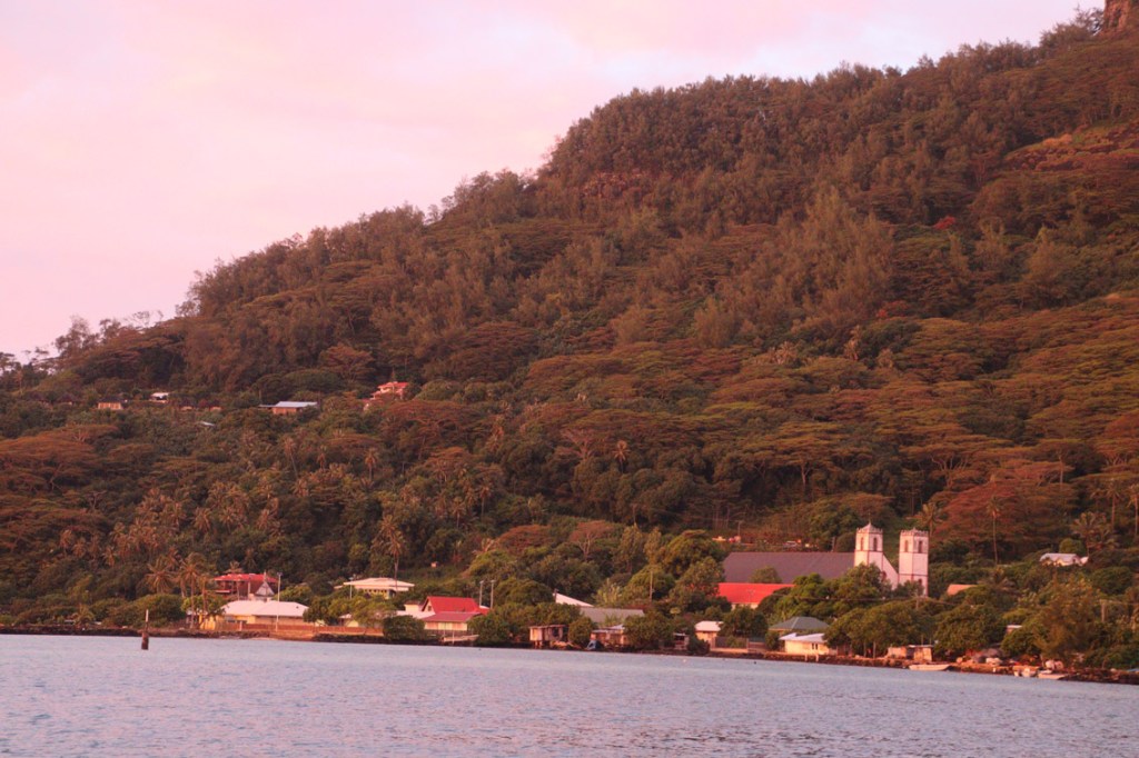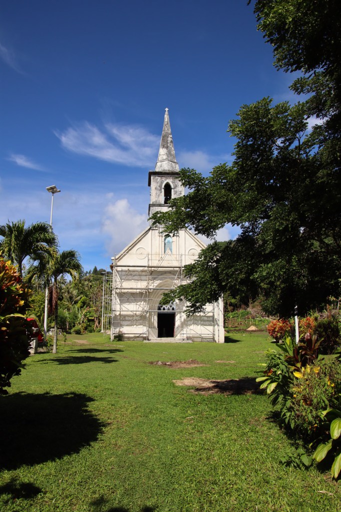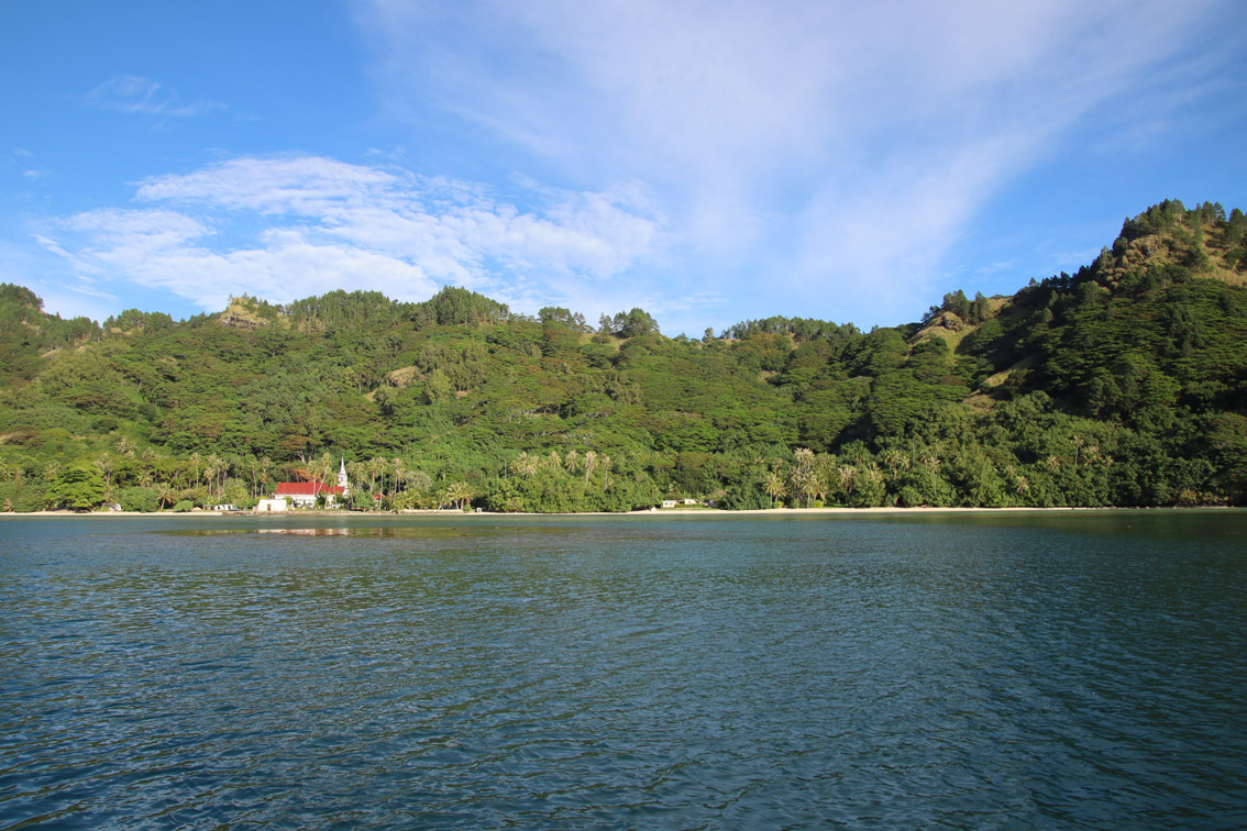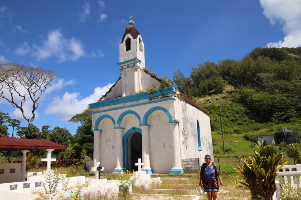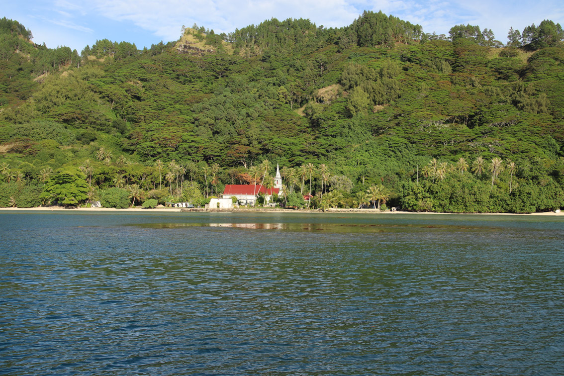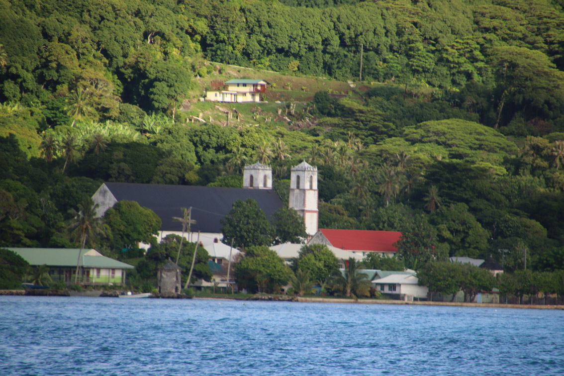 Taravaï située au Sud ouest de Mangareva est par sa taille la deuxième île de l’archipel de Gambier. Nous commençons par en faire le tour complet pour voir si l’un des mouillages côté barrière extérieure serait praticable mais la grosse houle de sud ouest qui sévit au large parvient à rentrer nous nous rabattons donc sur le mouillage devant l’église ou sont déjà plusieurs bateaux sans doute venus pour le traditionnel barbecue dominical organisé par Hervé.