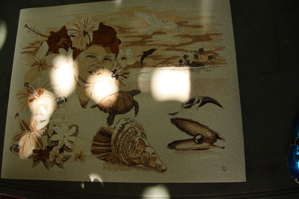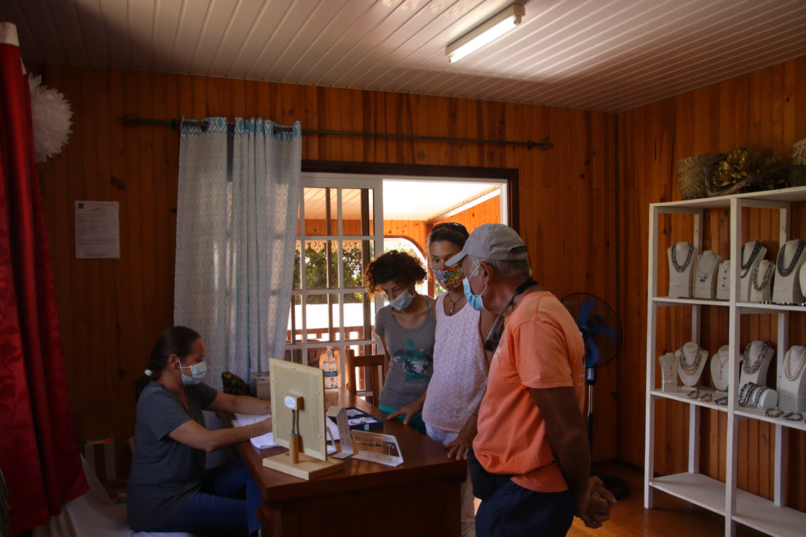 La perliculture est l’activité principale de l’île ainsi que sa ressource quasi-unique (pas ou peu de poisson, pas de coprah, plus de cafè ni de bois, fruits et légumes dans les jardins privés seulement). Les Gambier fournissent la plus importante quantité de perles en Polynésie. Geneviève nous fait découvrir l’une des artistes qui les mettent en valeur. Avec Brigitte et Daniel nous sommes émerveillés.