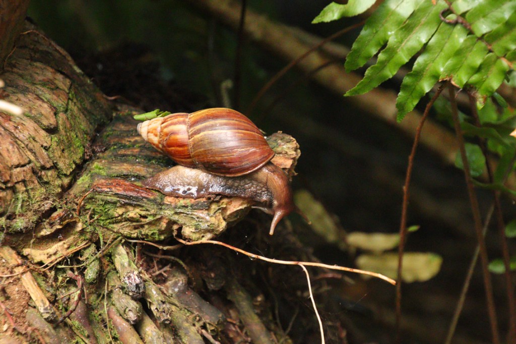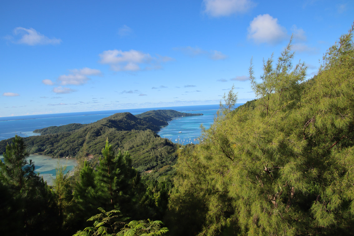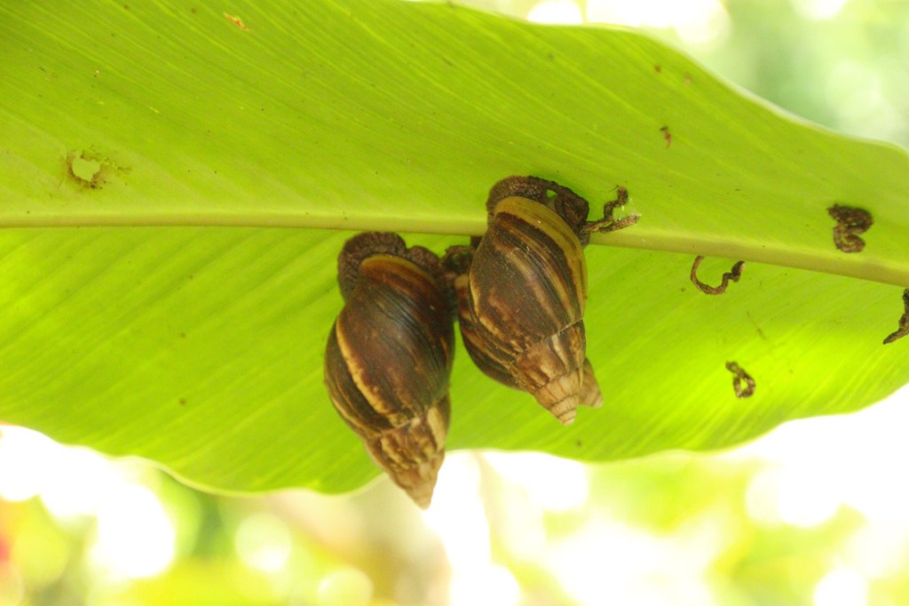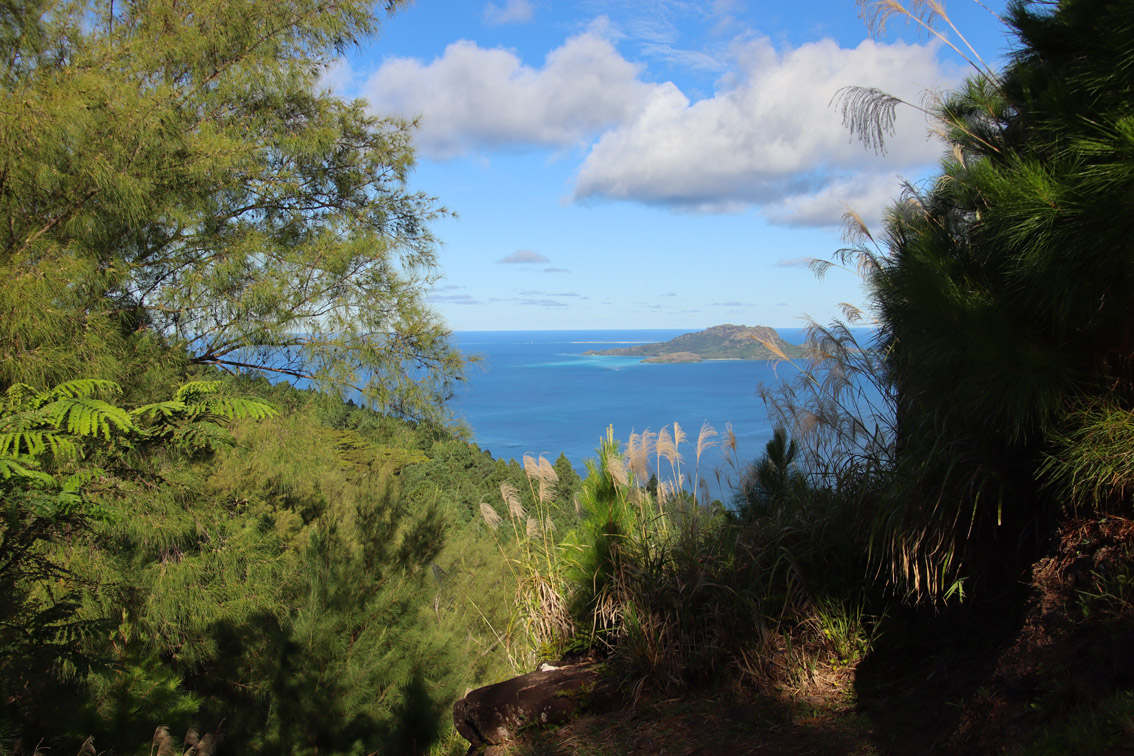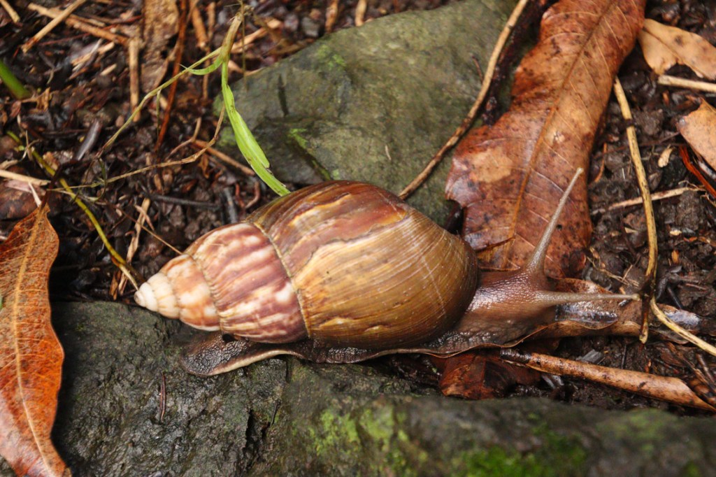 Pour passer de l’autre côté de l’île ,on prend le chemin qui grimpe à travers la forêt. Il a plu ce matin et les escargots sont de sortie. Ceci sont énormes et toxiques et surtout un fléaux redoutable pour les jardins et les cultures. Une fois sur les crêtes, on est récompensé par une vue superbe sur le mouillage.