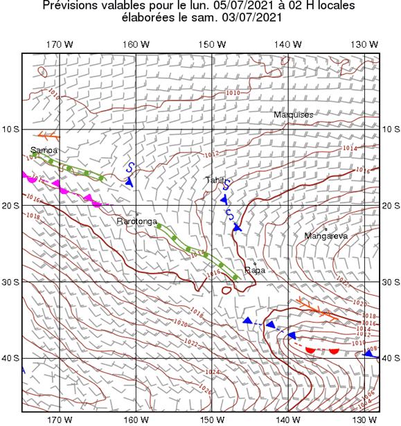 Depuis Tahiti nous naviguons tribord amure ( nous avons toujours reçu le vent du côté droit du bateau) mais d’ici 24 à 48 heures, il va falloir empanner pour plonger vers notre destination. Nous serons en principe assez nord pour éviter le gros de la zone de convergence et la partie la plus active du front. Mais choisir l’instant idéal pour ce changement de cap ne sera pas chose facile. Trop tôt, on risque de retomber dans la zone perturbée et d’avoir un angle trop ouvert par rapport au vent, défavorable s’il est faible, trop tard on fait trop de route inutilement et on risque de se retrouver à un angle trop serré, inconfortable si le vent est fort. Je pense qu’on va encore passer pas mal de temps sur les gribs et les cartes météo dans les heures qui viennent…