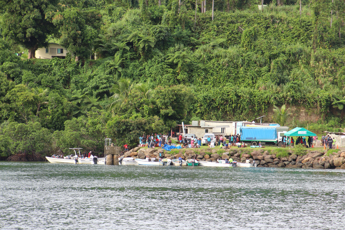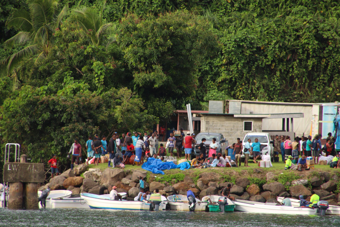 A midi nous comprenons pourquoi il y avait tant d’activités sur la baie : le bateau de ravitaillement enfin vient de s’amarrer à la jetée qui est entourée de barque venu chercher le matériel, les fournitures ou denrées que les villageois ont commandés. Apparemment la rotation n’est pas très fréquente et à sans doute été fortement perturbée par la pandémie. Avant-hier à Vunisea nous avions constaté que dans les deux super marchés les congélateurs étaient carrément vides.