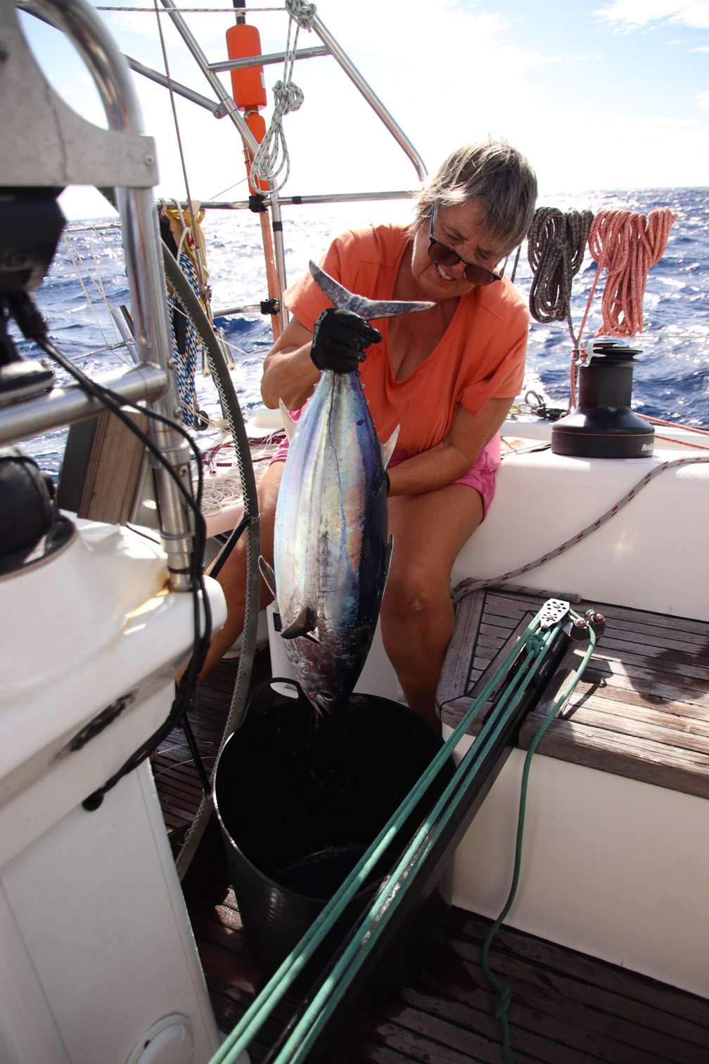 Un peu plus tard dans la journée c’est mon tour d’être réveillée : viens vite on en a pris un autre me dit Anne. Effectivement il y a un poisson au bout de la ligne et çà semble être un gros. Il fait moins de cirque que celui de ce matin. Doucement on remonte la ligne, pas de doute c’est un thon et il est magnifique sans doute le plus gros que nous ayons pêché ! A peine remonté, on le vide, le saigne et le débite en filets dont nous mettons une partie sous vide pour pouvoir les garder quelque jours.