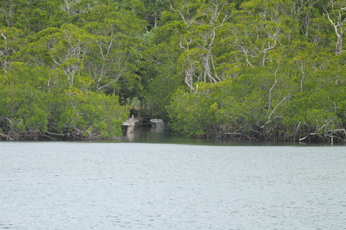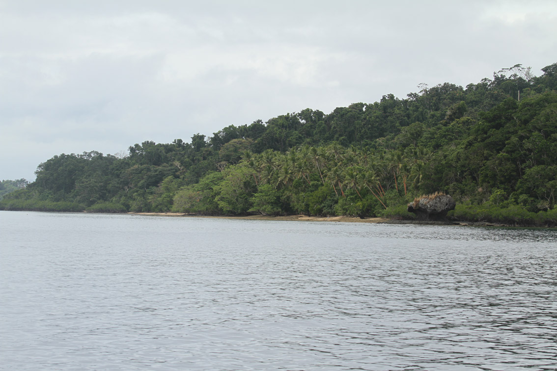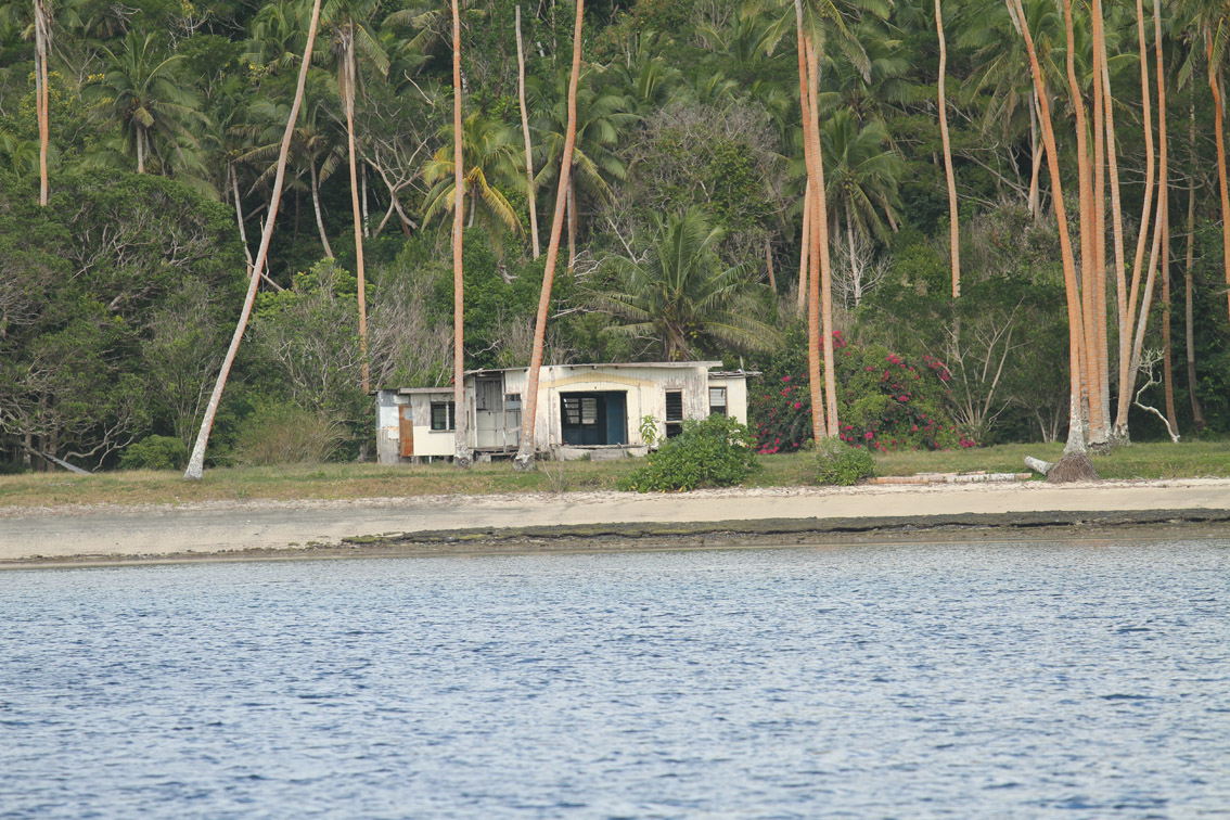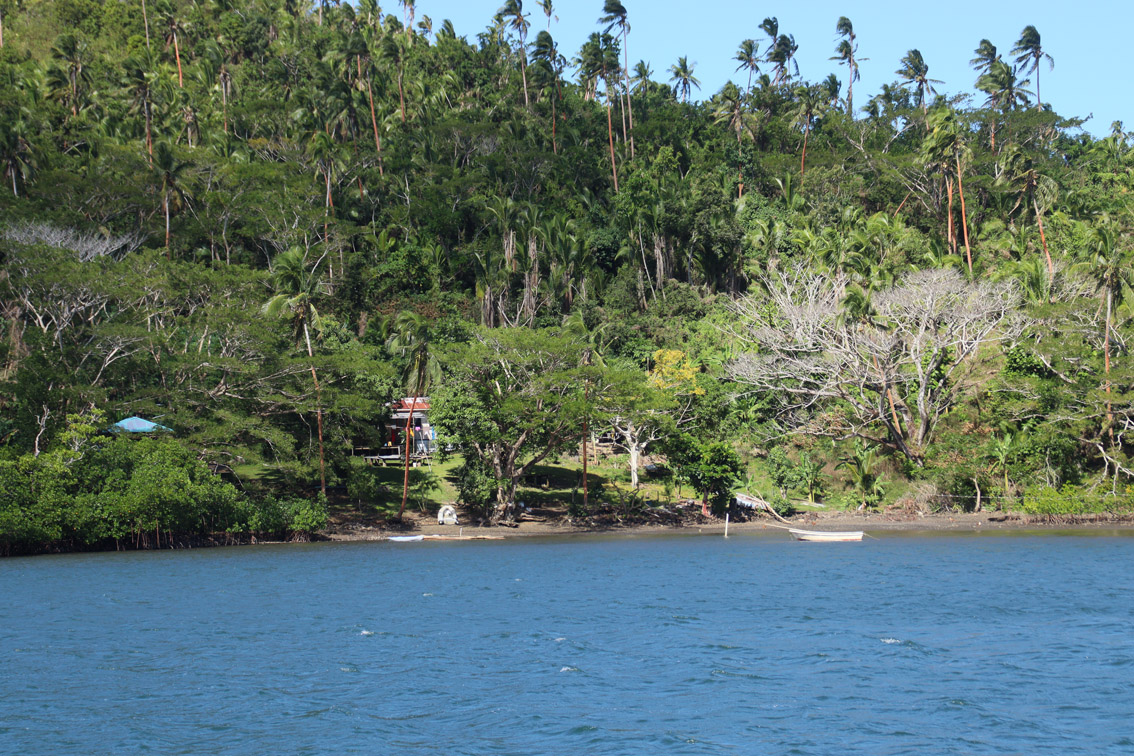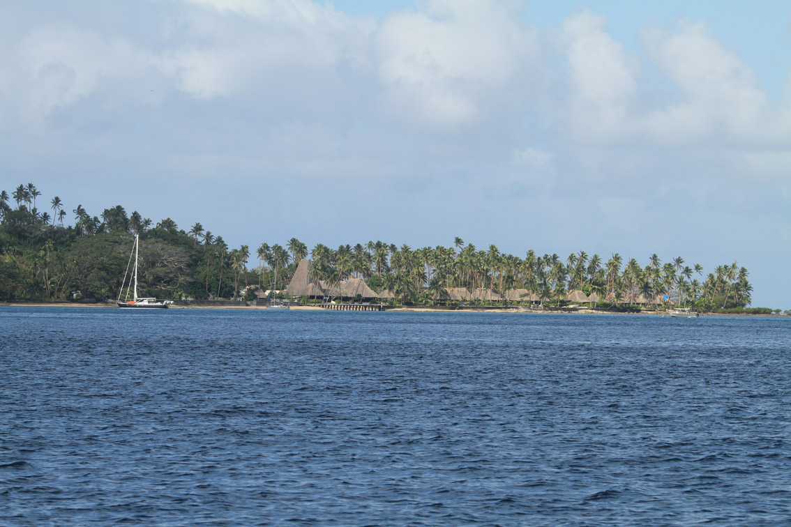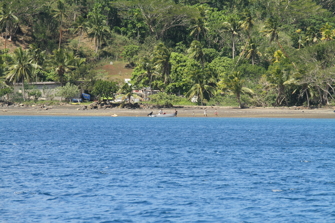 Vendredi 20 août, nous quittons Nasau pour faire le tour de l’île Kioa. Le guide électronique dont nous venons de faire l’acquisition (Sail Fiji Cruising Guide pour iPad) indique 2 bons mouillages dans la grande baie qui découpe la côte Nord Ouest de l’île. L’un est très mal abrité et l’autre, annoncé dans 12 mètres fond de sables s’avère en fait 23m et plein de coraux morts (peut-être un effet du cyclone). Qu’à cela ne tienne, juste à côté nous trouvons une belle anse, parfaitement calme, bordée d’une mangrove et dont le fond de sable descend gentiment entre 8 et 12 m. En plus l’eau est assez claire ce qui est rare en bordure de mangrove. Nous y resterons 2 nuits et nous y reviendrons.
