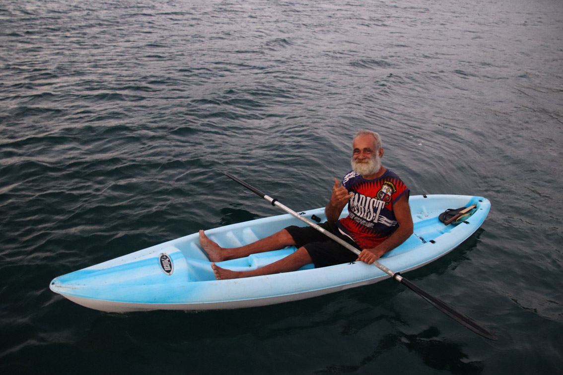 Il y a une jolie maison sur la rive Est. C’est là qu’habitent Edwin et sa petite famille. Il vient en kayak nous faire un brin de causette.