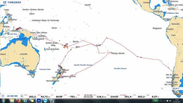 Avec ces quelques dizaines de milles qui nous reste avant l’arrivée à Sorong, s’achèvera notre périple dans la Pacifique Sud. Nous l’aurons parcouru de long en large (comme en témoigne notre trace sur la carte ci-dessous) amassé tant de souvenir merveilleux de paysages extraordinaires et de rencontres inoubliables. Quel sera notre prochain océan? L’Indien? Le Pacifique Nord? L’avenir le dira. Pour l’instant on va déjà entrer en Indonésie et profiter de Rajah Ampat pour quelques semaines…