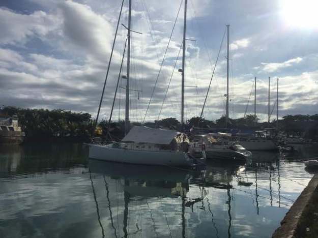 Le terme marina est un bien grand mot, en fait un bassin rectangulaire, abritant quelques vieilles épaves, entouré de ce qui a dû être un hotel/resort de luxe mais dont une moitié seulement est encore en service et l’autre se délabre rapidement. Il y a tout de même 6 voiliers amarrés là dont quatre sont occupés. Loin de la brise du large, la température (34°C) devient écrasante. Sans rien faire on transpire en permanence nous obligeant à boire des litres d’eau pour compenser et éviter la déshydratation.