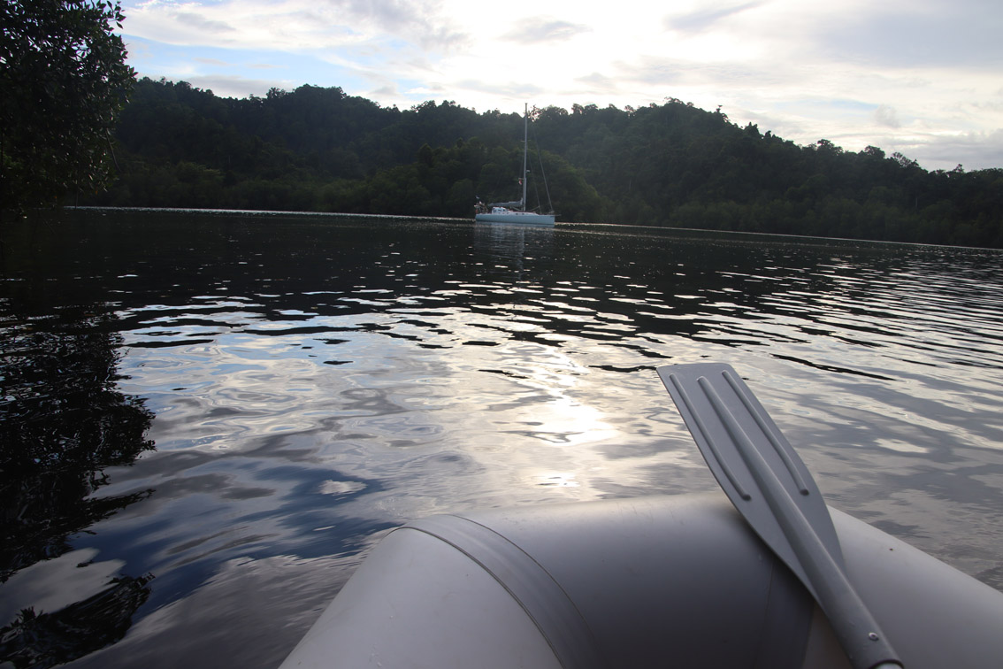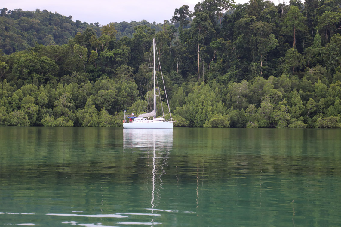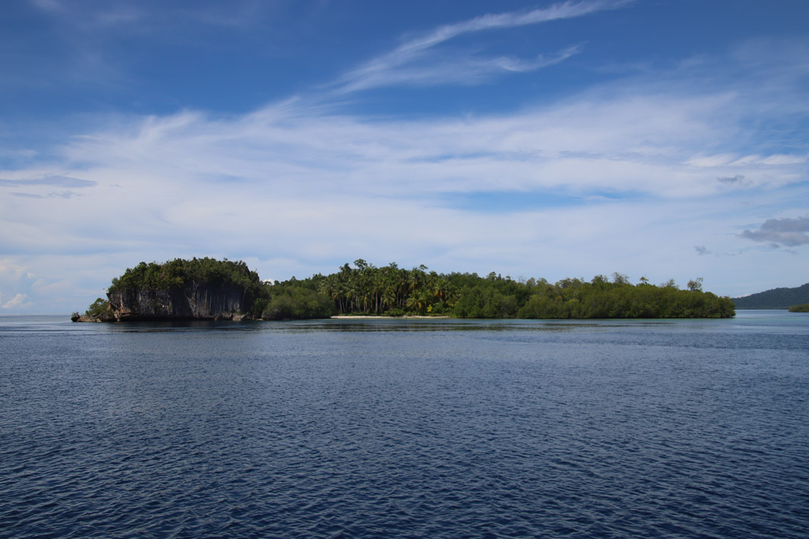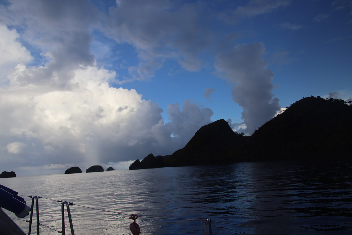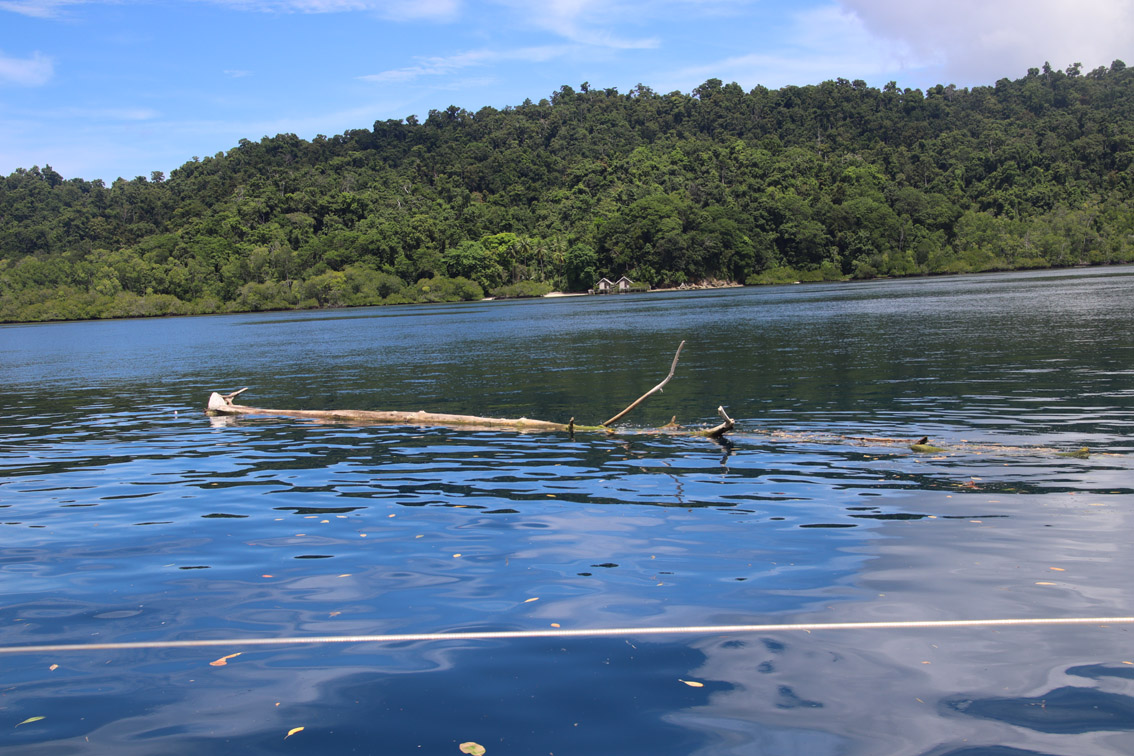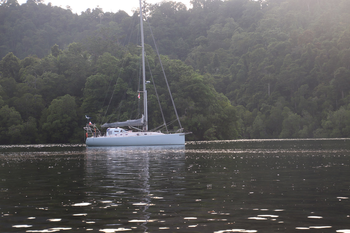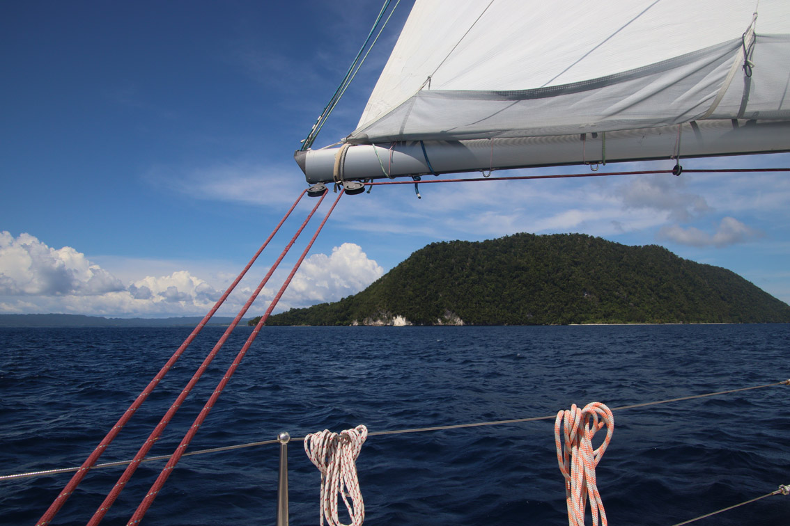 Le vent nous abandonne à mi-parcours et la dernière dizaine de milles se fait au moteur sur une mer parfaitement lisse. Nous jetons notre dévolu sur Mariabio, une petite baie d’aspect tranquille et bien protégée au fond de la grande baie entourant la petite île d’ Ayemi sur la côte est de Batanta. C’est un très joli endroit, super protégé, entouré de forêt vierge avec une vue sur le large. Les habitations les plus proches sont à plus de deux milles, à part les oiseaux (il y en a beaucoup) on entend pas un bruit et cerises sur le gâteau, l’eau est claire sans aucun déchet plastique visible.