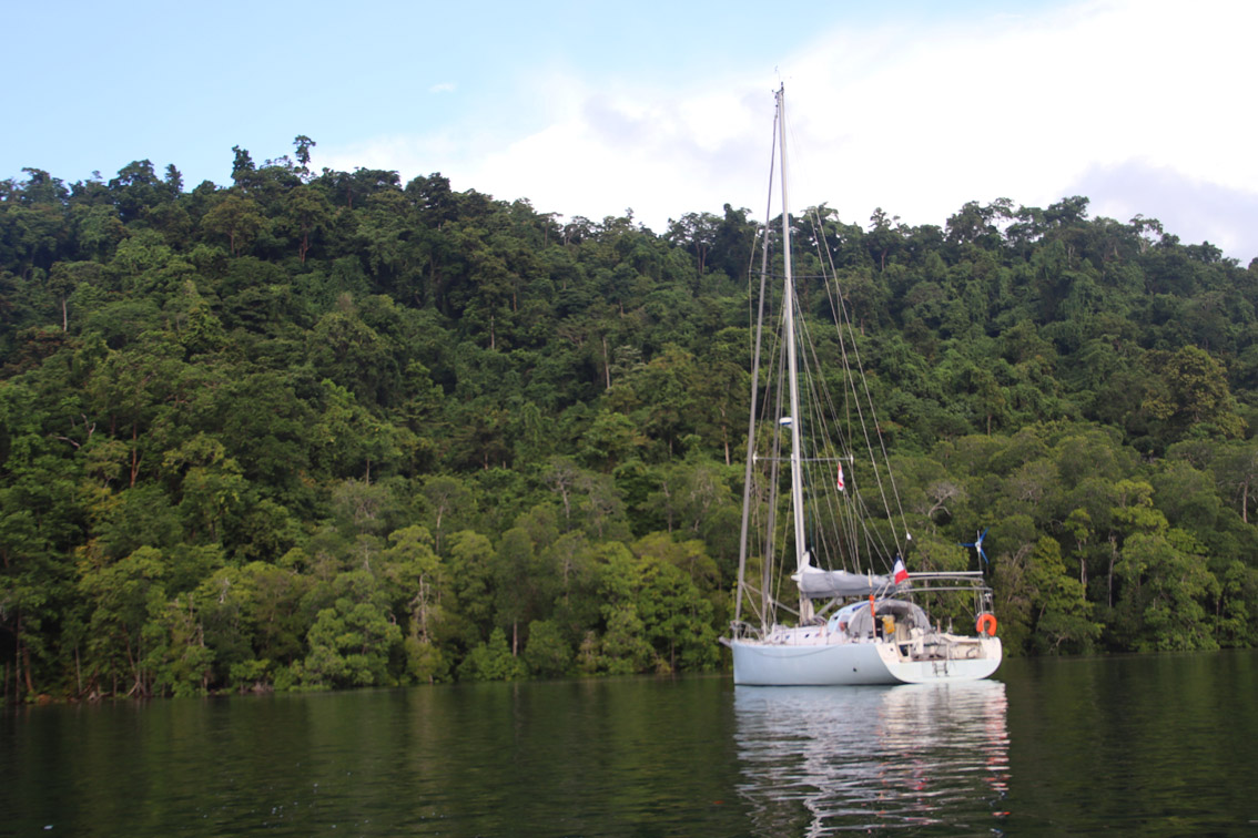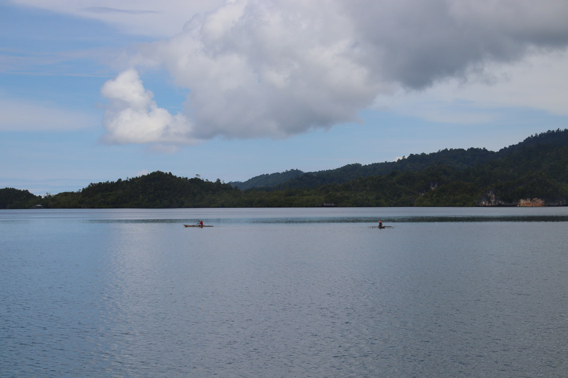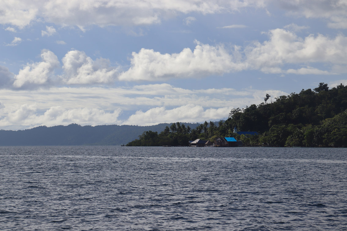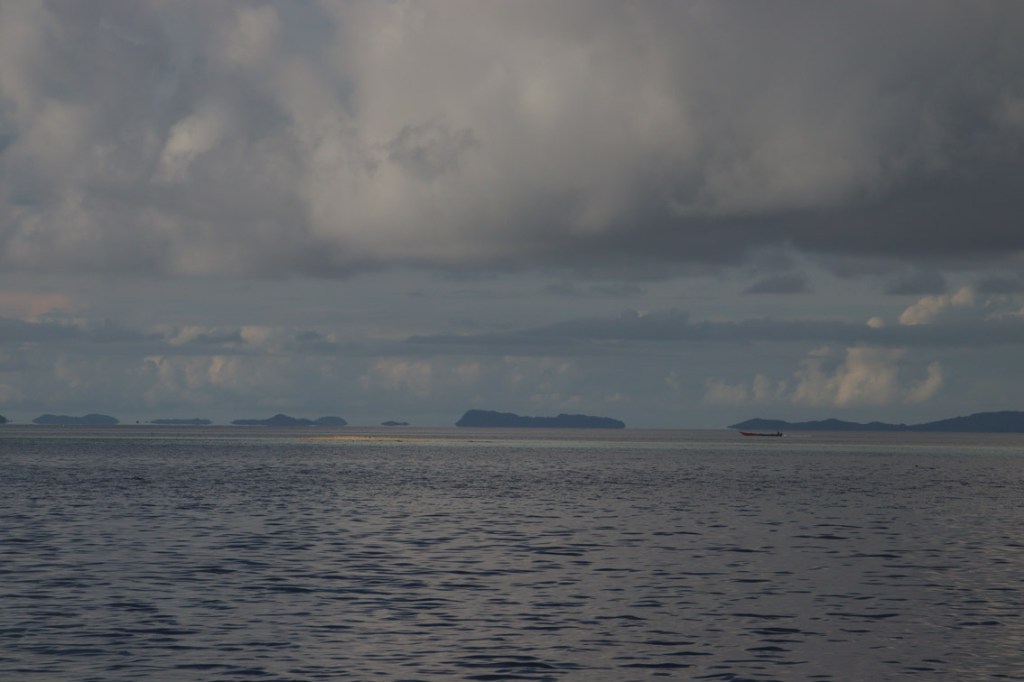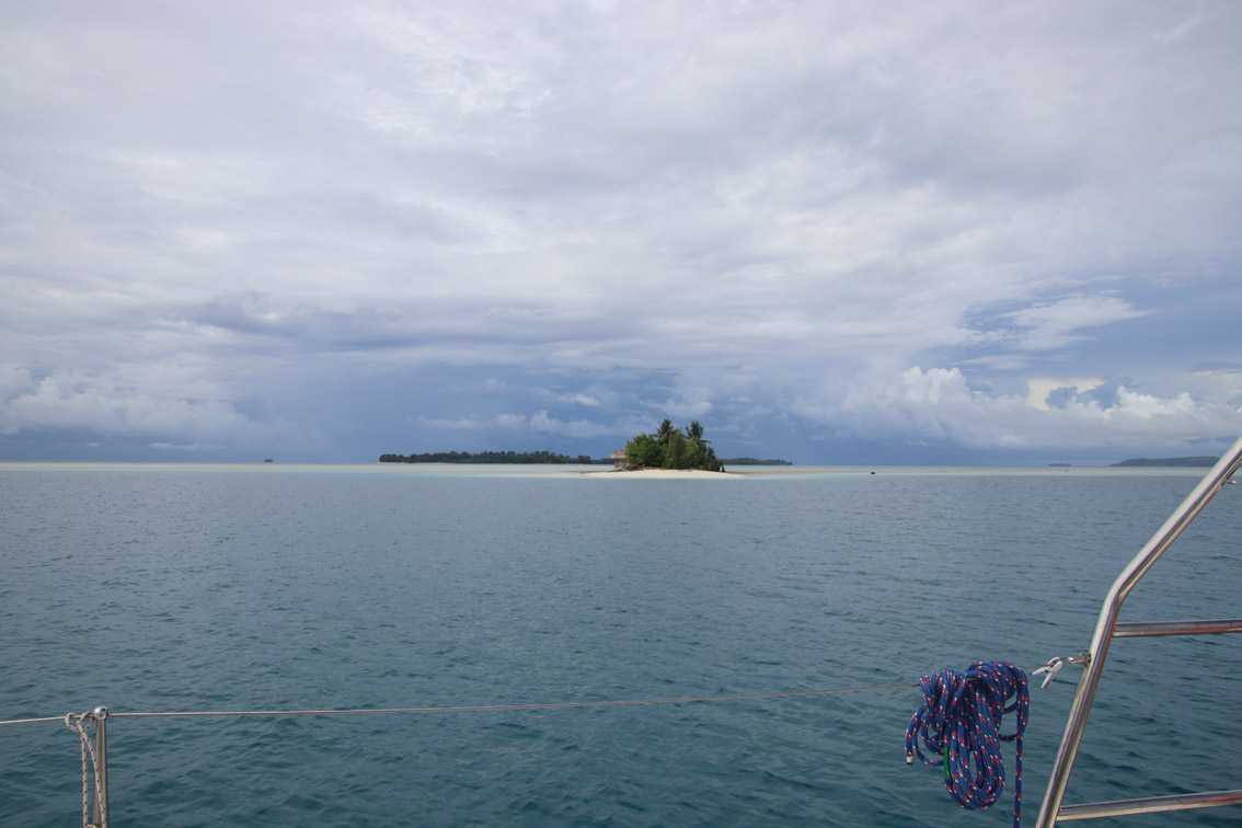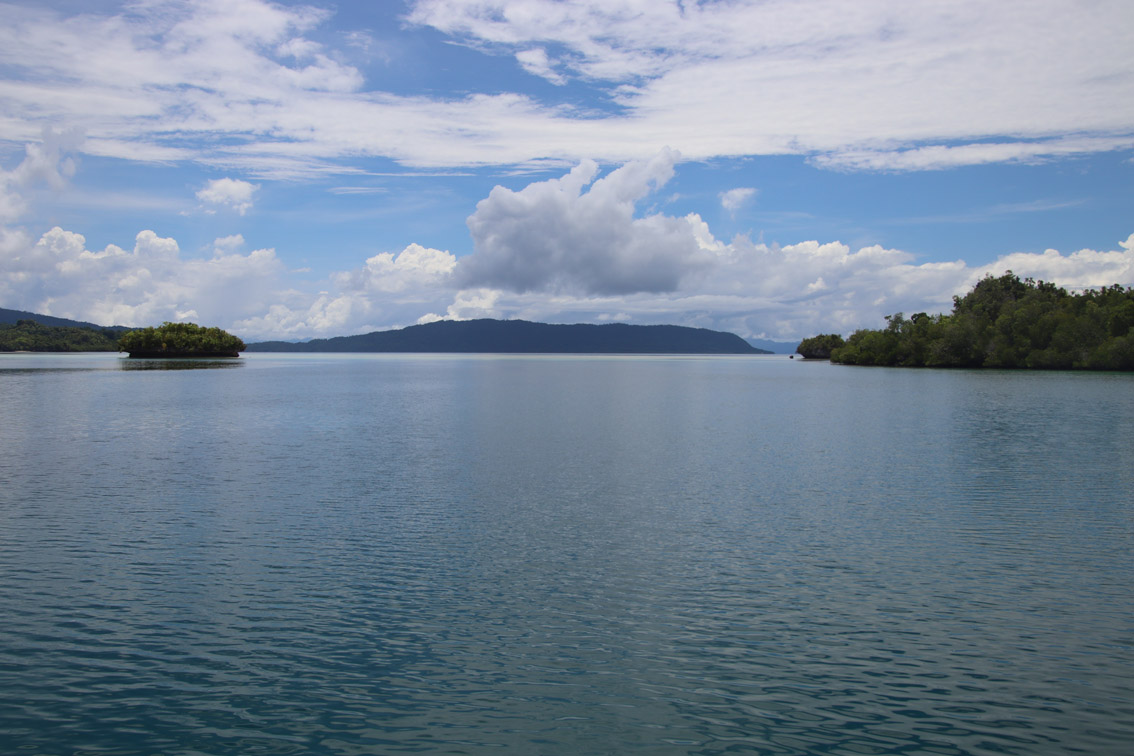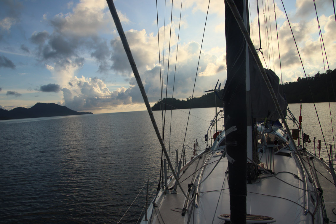 Le vent nous abandonne à mi-parcours et la dernière dizaine de milles se fait au moteur sur une mer parfaitement lisse. Nous jetons notre dévolu sur Mariabio, une petite baie d’aspect tranquille et bien protégée au fond de la grande baie entourant la petite île d’ Ayemi sur la côte est de Batanta. C’est un très joli endroit, super protégé, entouré de forêt vierge avec une vue sur le large. Les habitations les plus proches sont à plus de deux milles, à part les oiseaux (il y en a beaucoup) on entend pas un bruit et cerises sur le gâteau, l’eau est claire sans aucun déchet plastique visible.