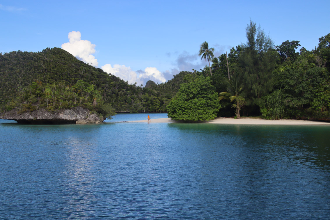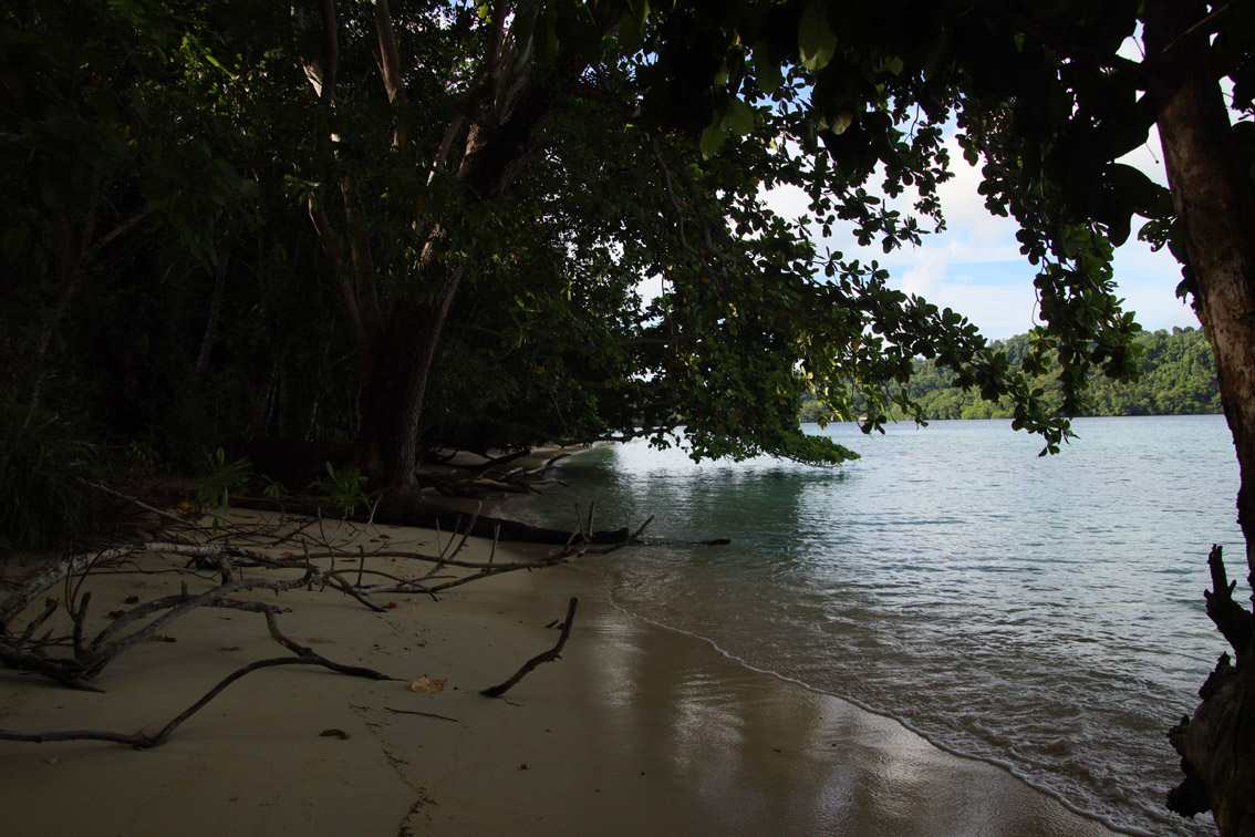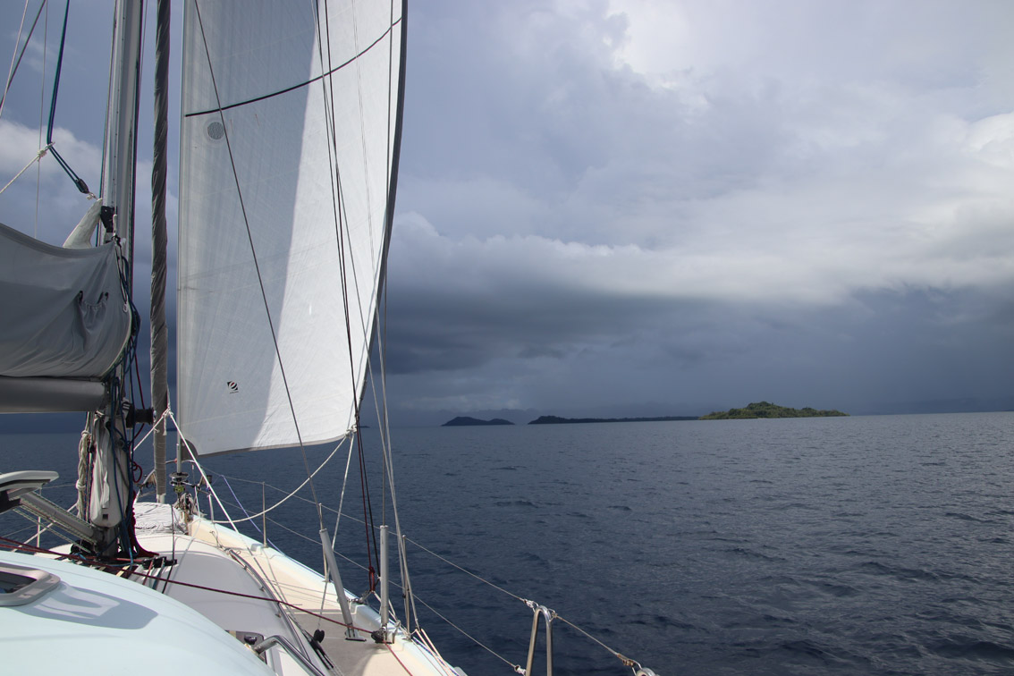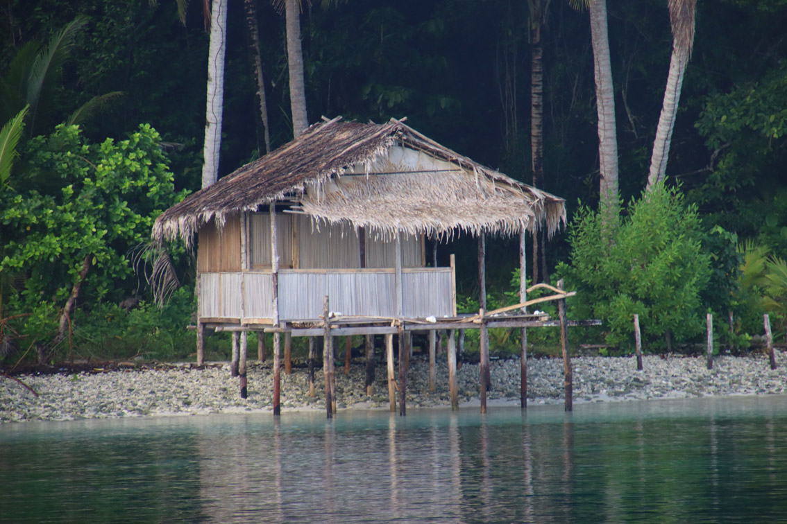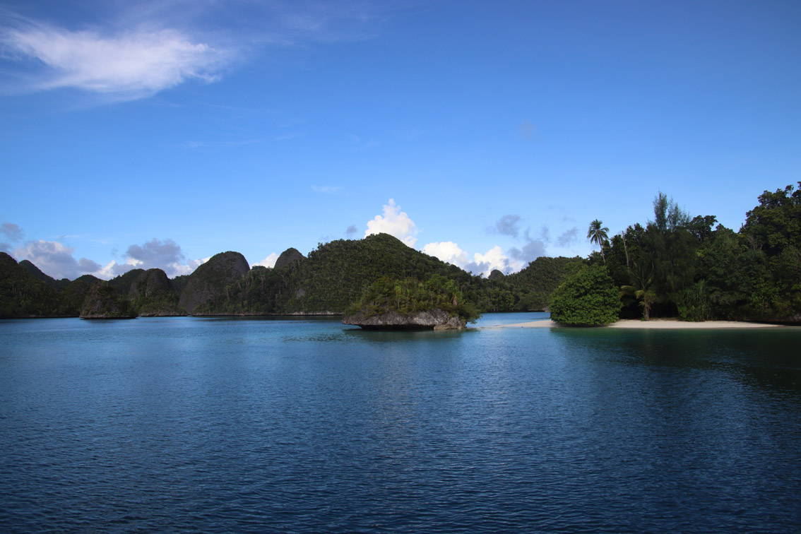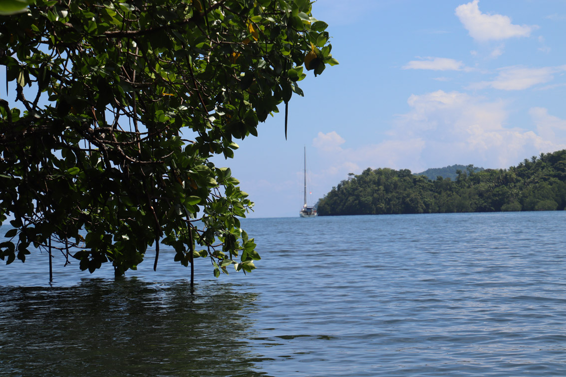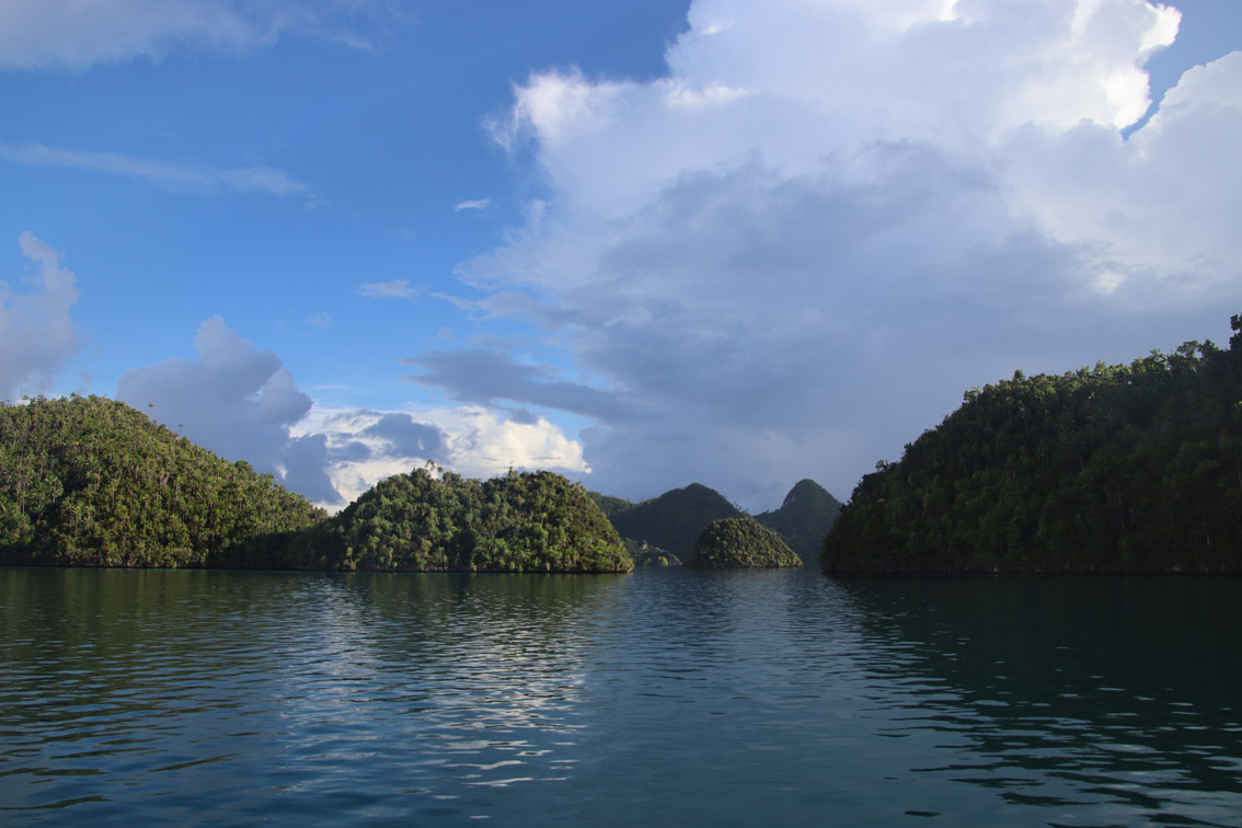 Le vent nous abandonne à mi-parcours et la dernière dizaine de milles se fait au moteur sur une mer parfaitement lisse. Nous jetons notre dévolu sur Mariabio, une petite baie d’aspect tranquille et bien protégée au fond de la grande baie entourant la petite île d’ Ayemi sur la côte est de Batanta. C’est un très joli endroit, super protégé, entouré de forêt vierge avec une vue sur le large. Les habitations les plus proches sont à plus de deux milles, à part les oiseaux (il y en a beaucoup) on entend pas un bruit et cerises sur le gâteau, l’eau est claire sans aucun déchet plastique visible.