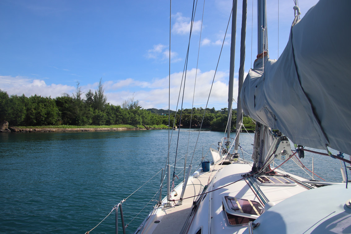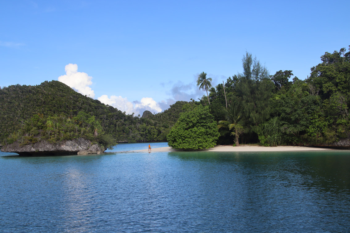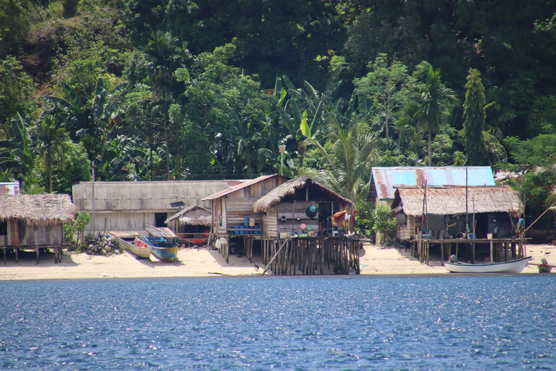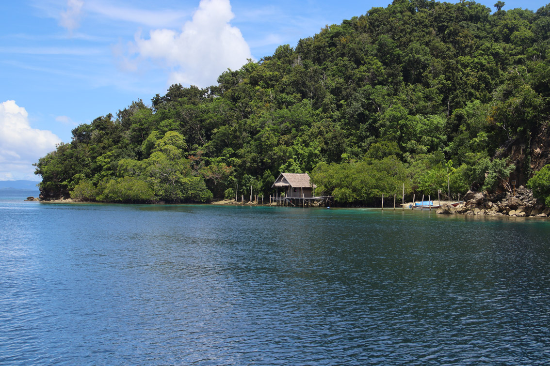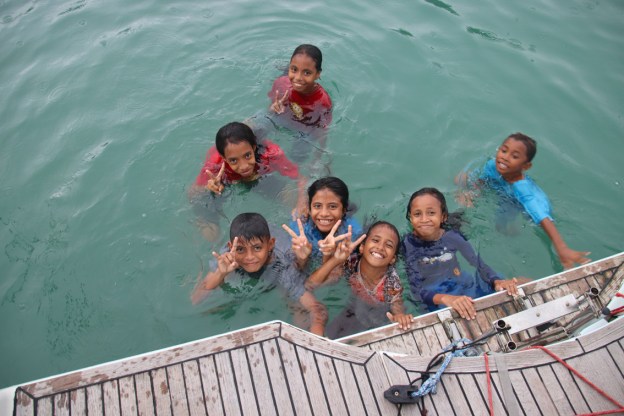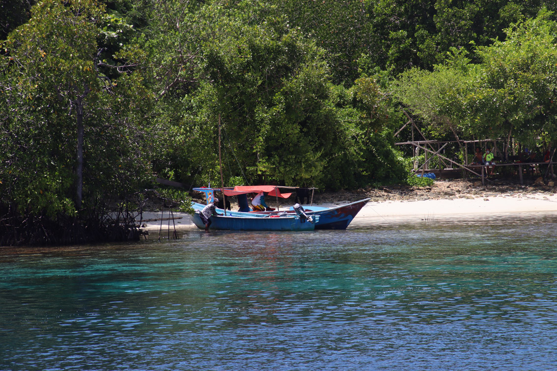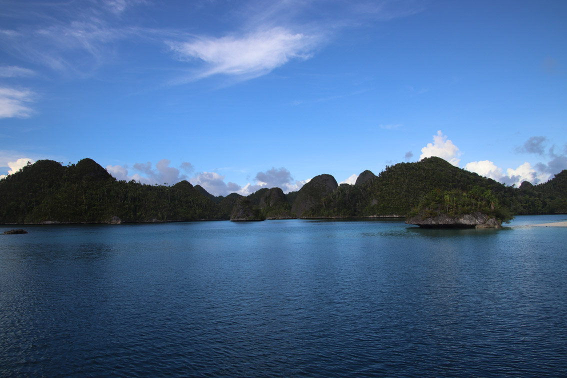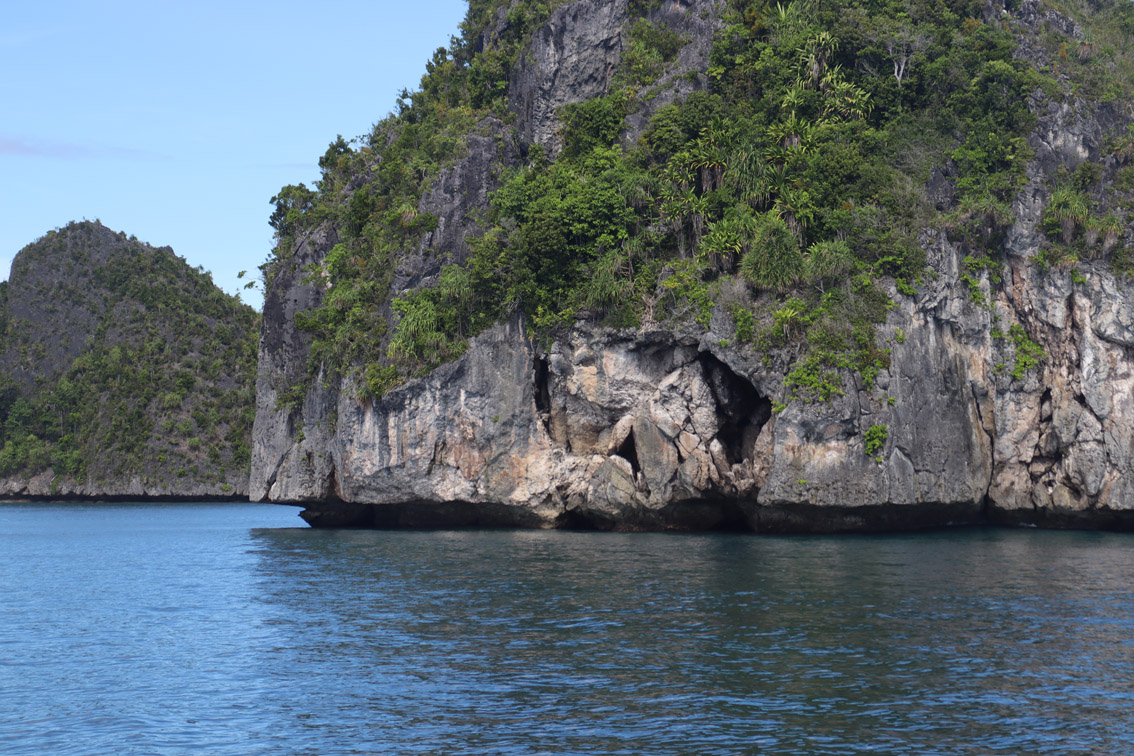 Le vent nous abandonne à mi-parcours et la dernière dizaine de milles se fait au moteur sur une mer parfaitement lisse. Nous jetons notre dévolu sur Mariabio, une petite baie d’aspect tranquille et bien protégée au fond de la grande baie entourant la petite île d’ Ayemi sur la côte est de Batanta. C’est un très joli endroit, super protégé, entouré de forêt vierge avec une vue sur le large. Les habitations les plus proches sont à plus de deux milles, à part les oiseaux (il y en a beaucoup) on entend pas un bruit et cerises sur le gâteau, l’eau est claire sans aucun déchet plastique visible.