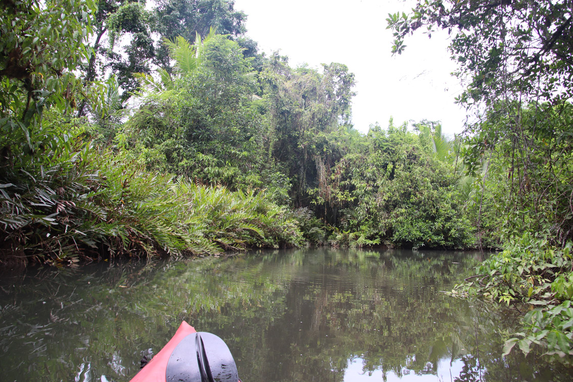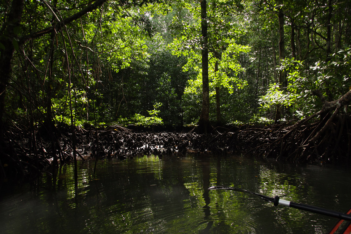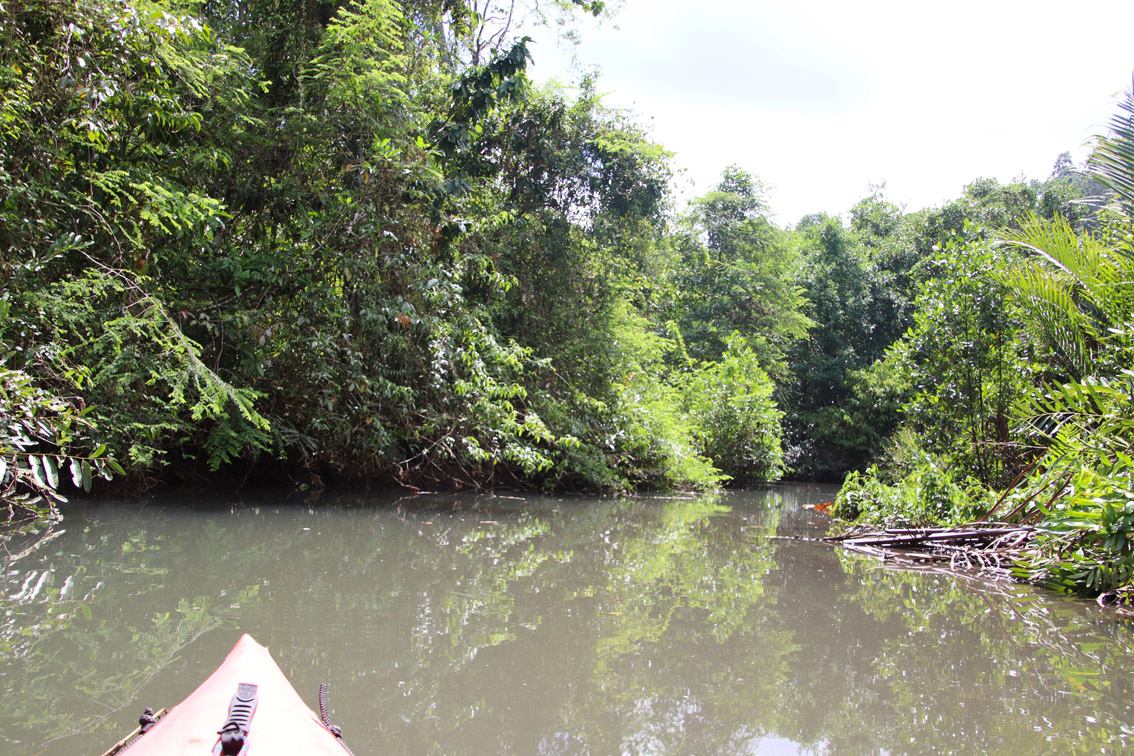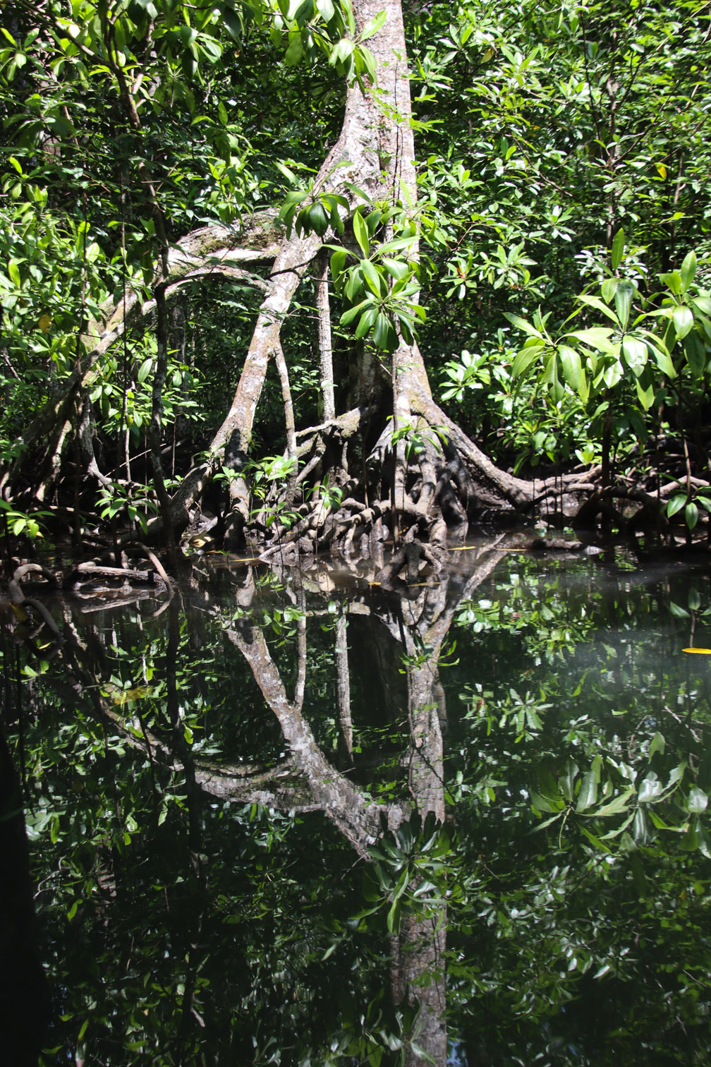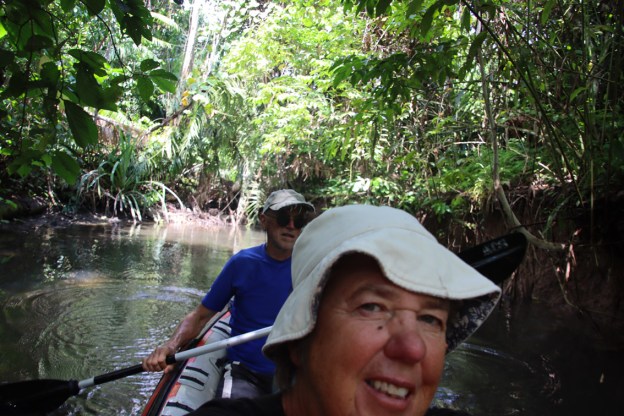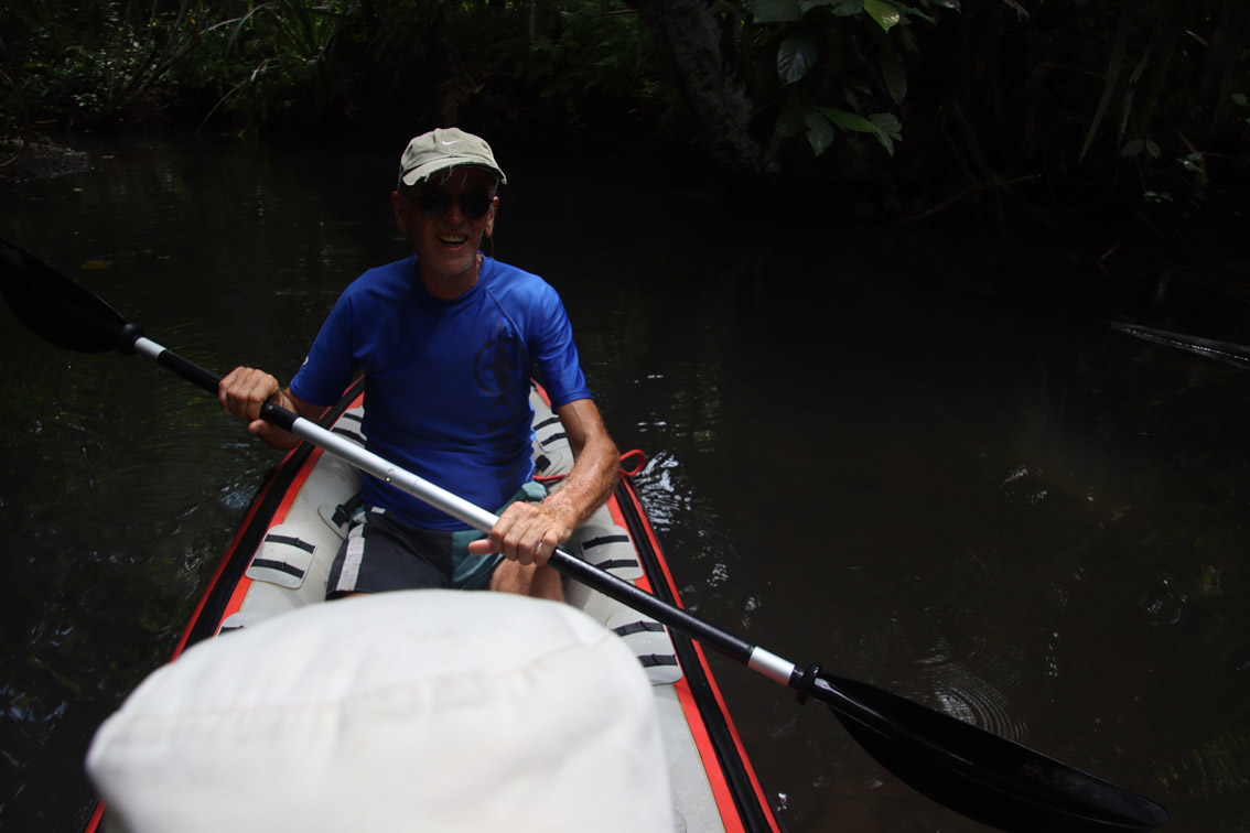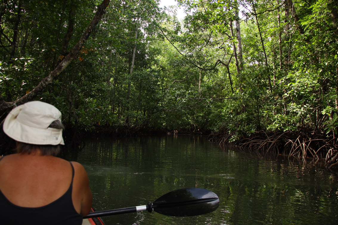 Autre but de promenade en kayak, les magroves qui bordent la baie et surtout la petite rivière qui les traverse et s’enfonce dans la jungle équatoriale. Nous croisons les doigts pour ne pas rencontrer un de ces crocodiles de mer qui sévissent parait-il dans la région et sont réputé pour avoir une bonne taille.