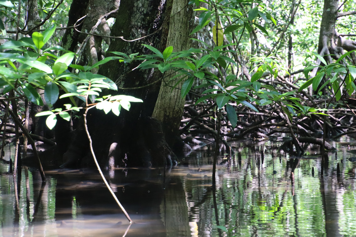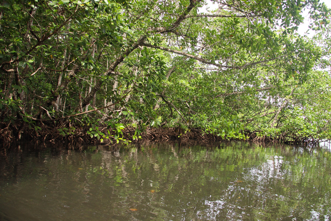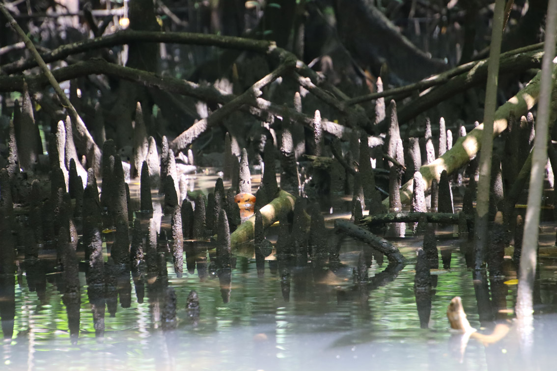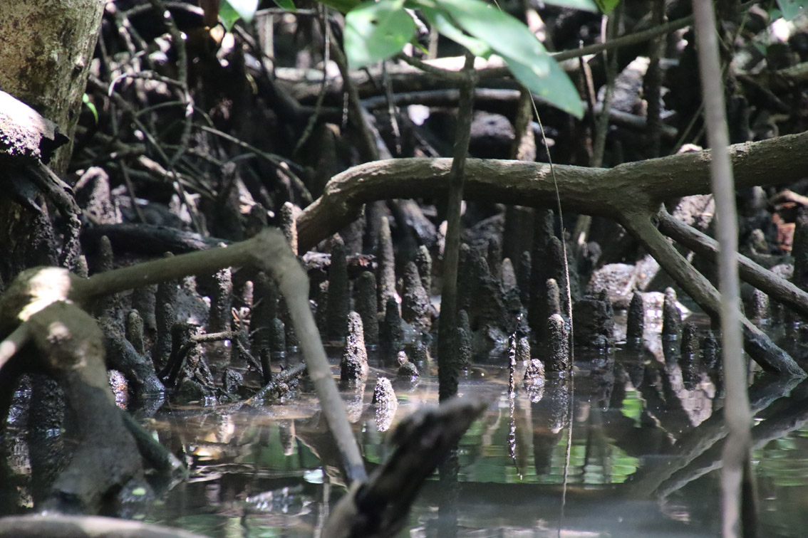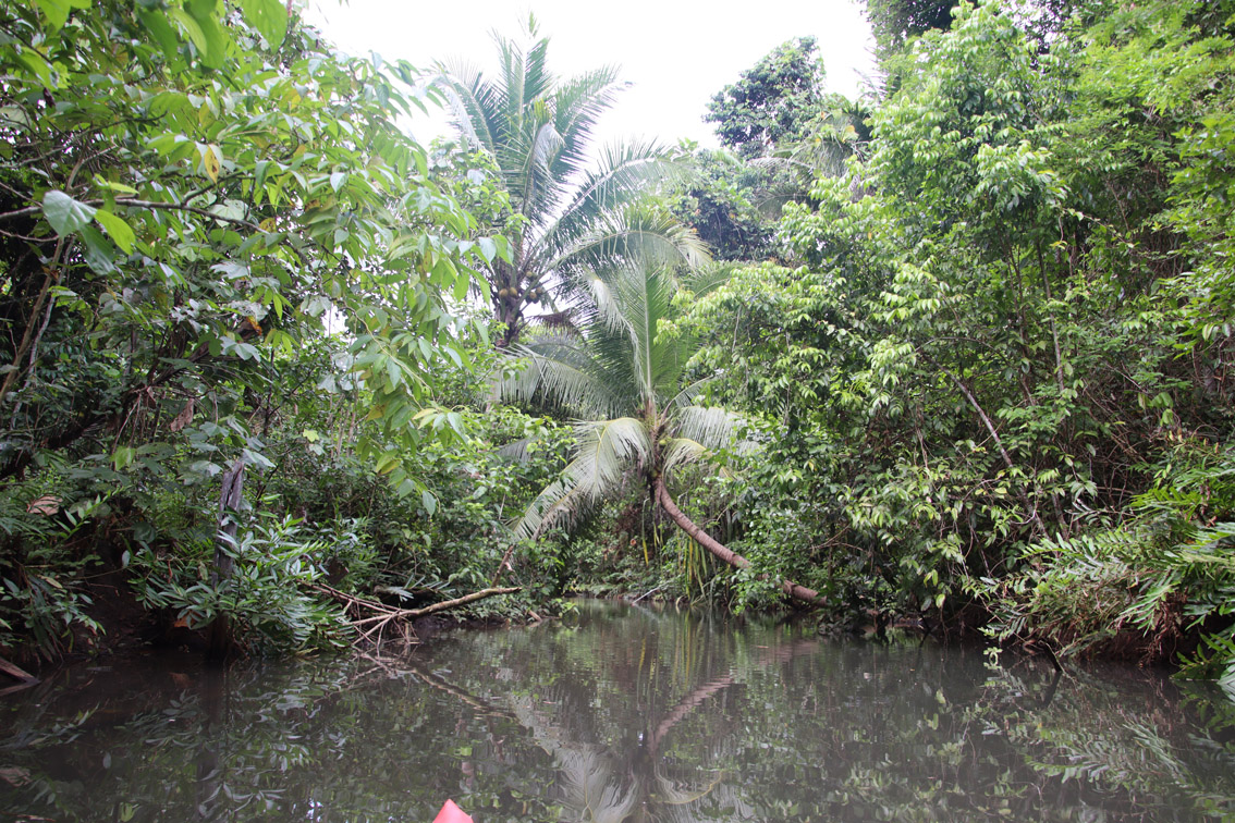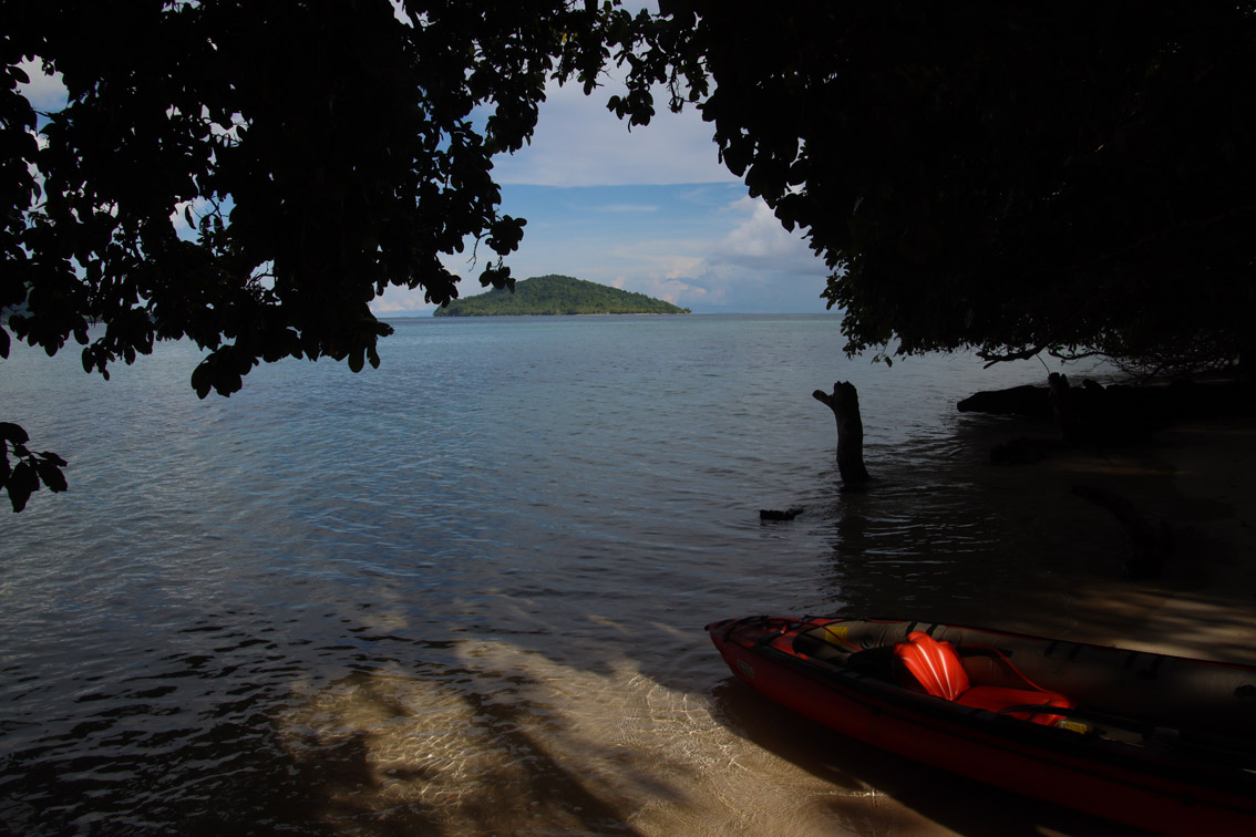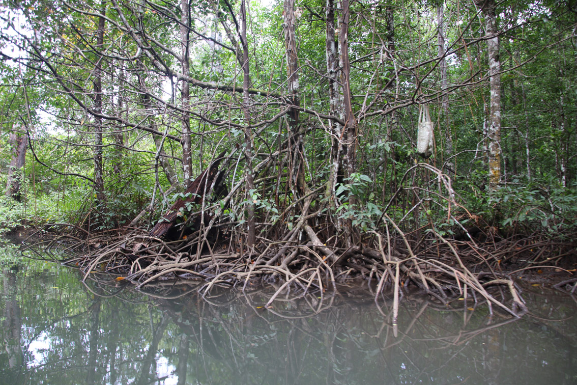 Autre but de promenade en kayak, les magroves qui bordent la baie et surtout la petite rivière qui les traverse et s’enfonce dans la jungle équatoriale. Nous croisons les doigts pour ne pas rencontrer un de ces crocodiles de mer qui sévissent parait-il dans la région et sont réputé pour avoir une bonne taille.