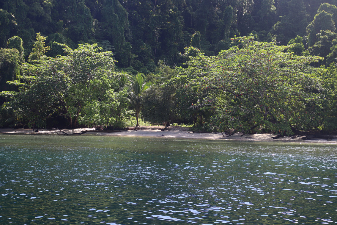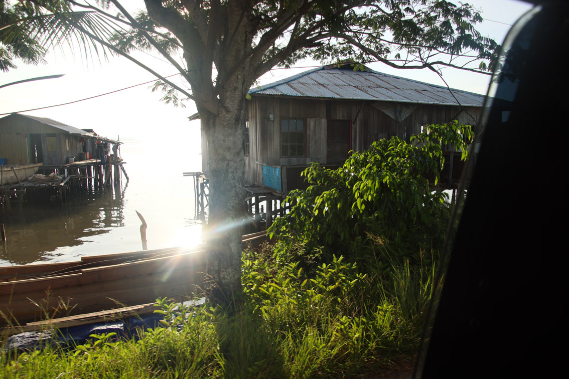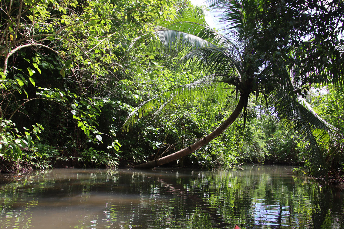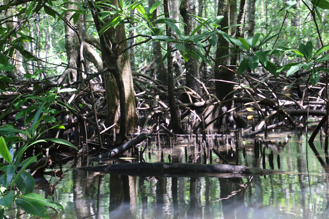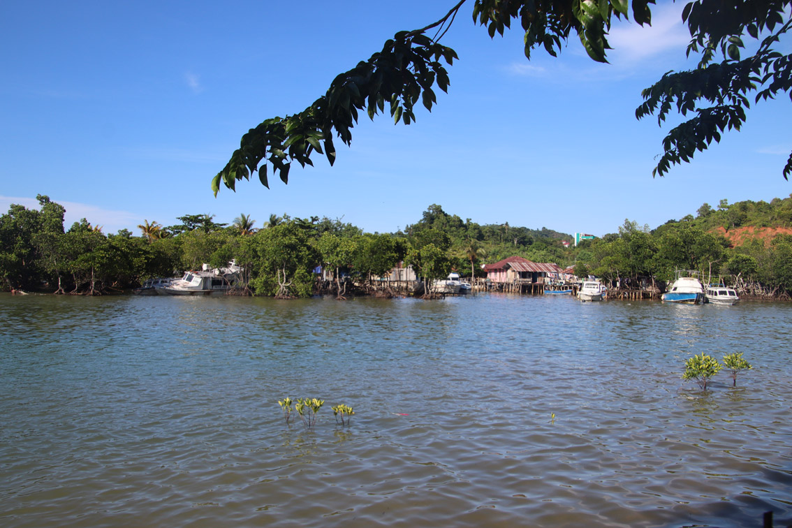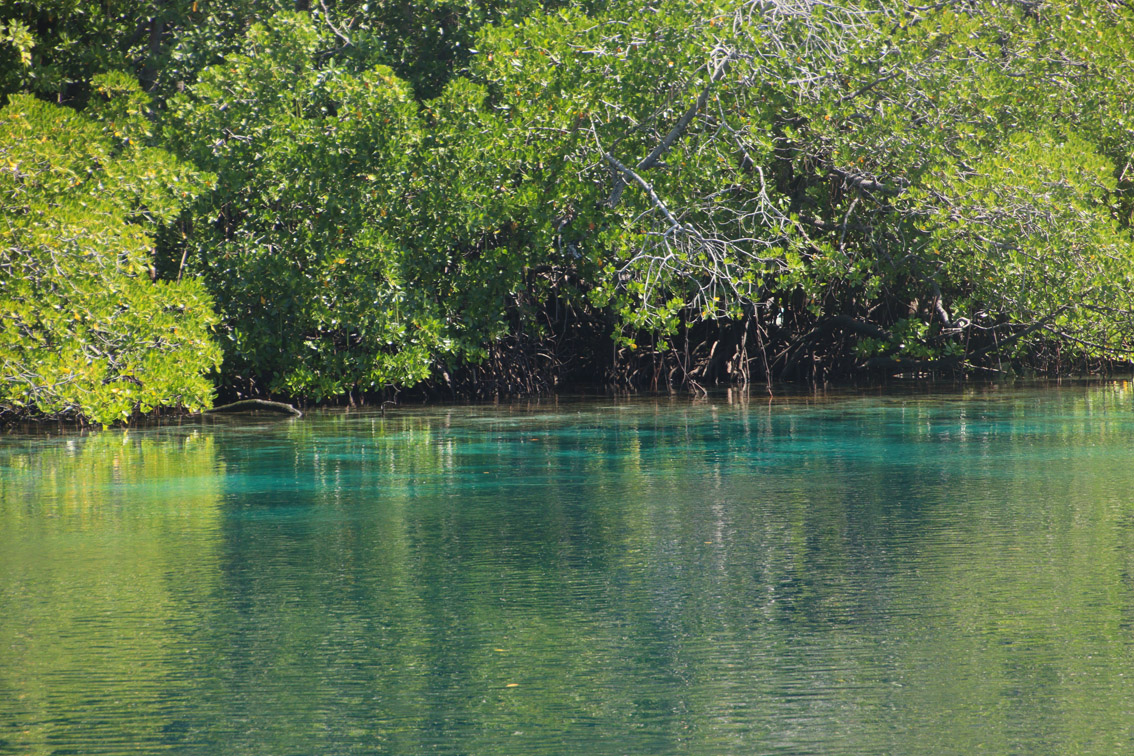 Autre but de promenade en kayak, les magroves qui bordent la baie et surtout la petite rivière qui les traverse et s’enfonce dans la jungle équatoriale. Nous croisons les doigts pour ne pas rencontrer un de ces crocodiles de mer qui sévissent parait-il dans la région et sont réputé pour avoir une bonne taille.