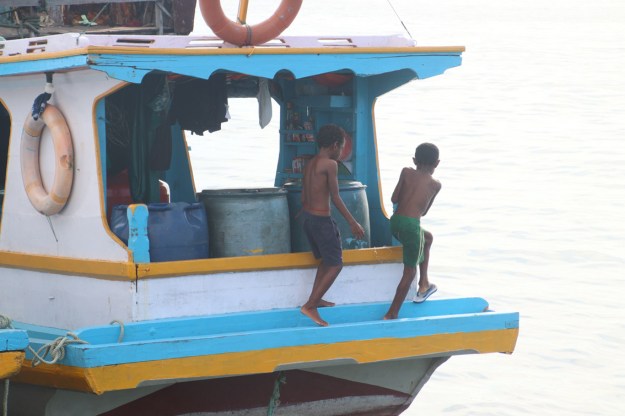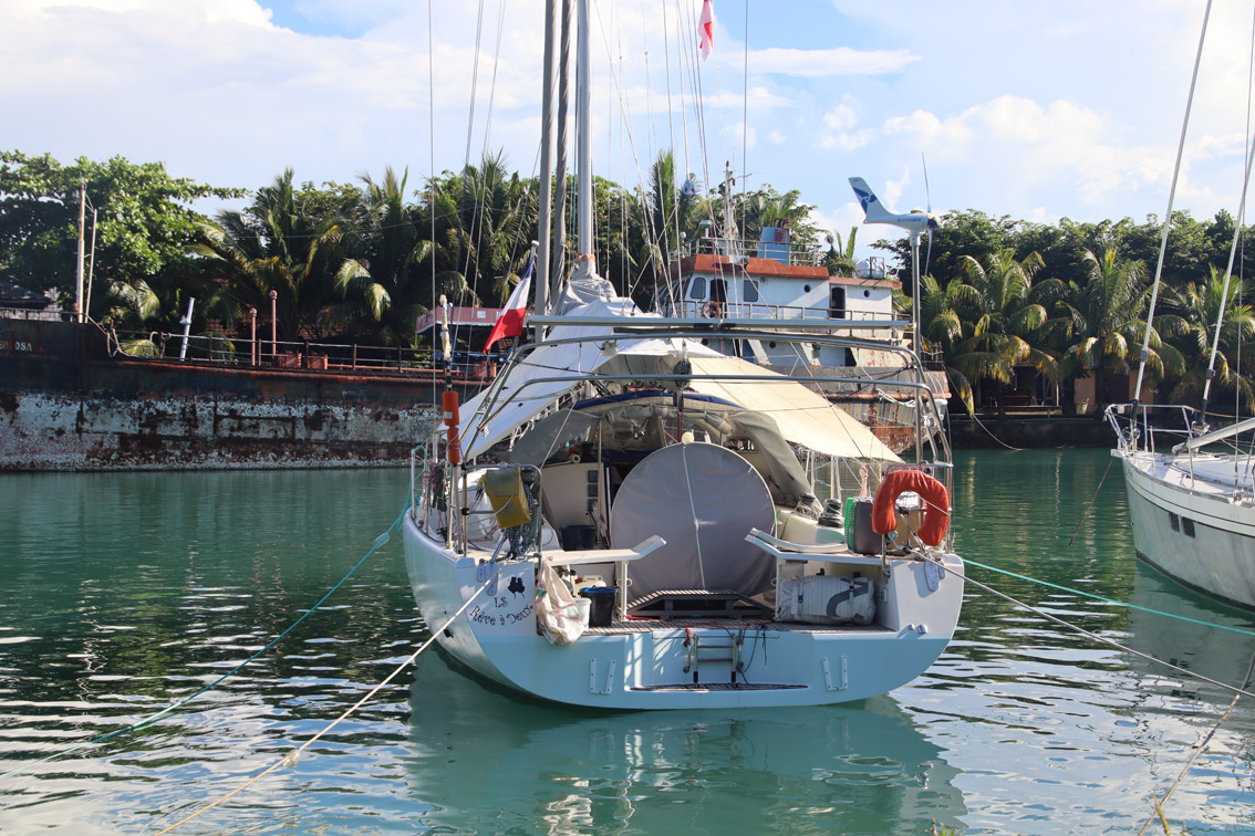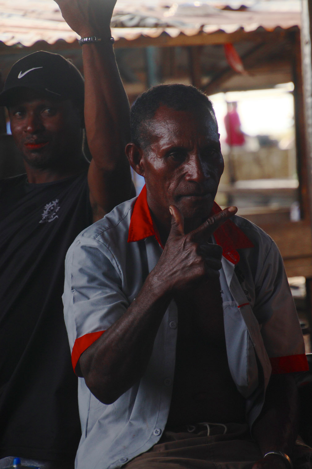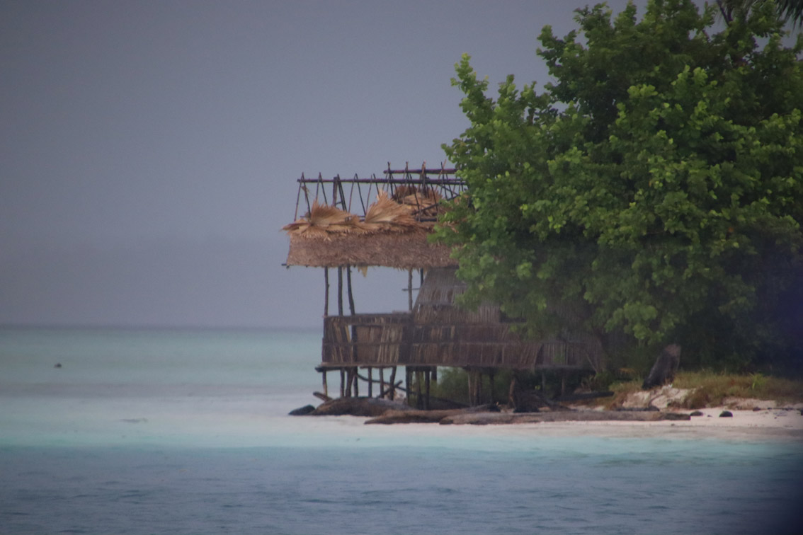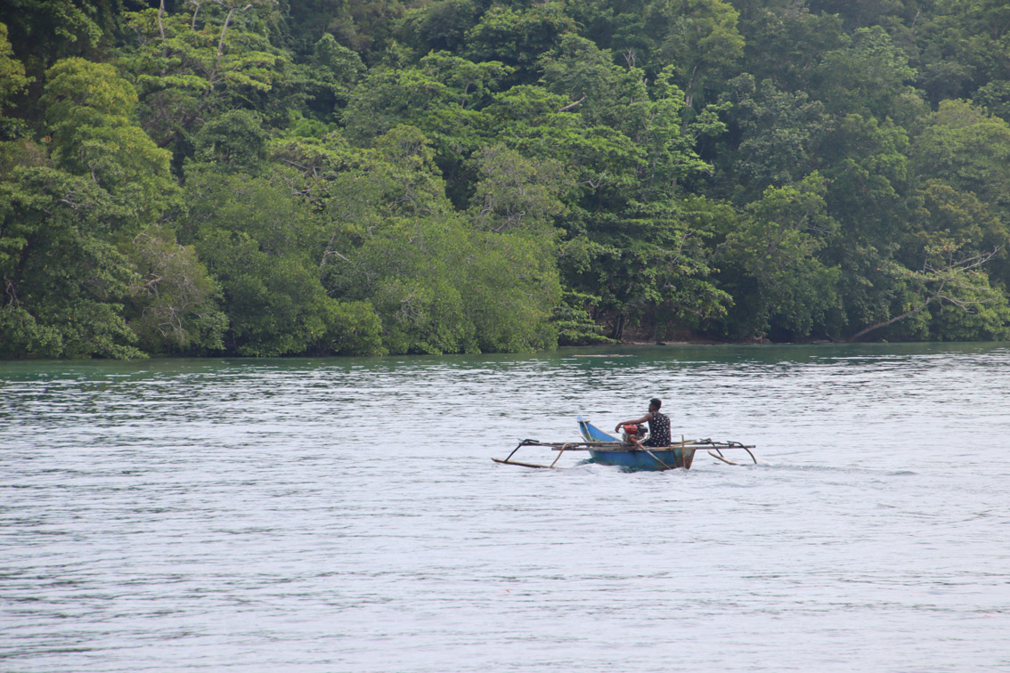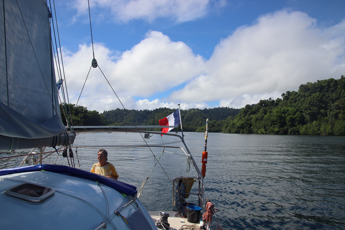 Pendant les douze jours que nous serons là nous ne verrons quasiment pas âme qui vive. Quelques locaux traversent la baie une ou deux fois par semaine pour remonter la petite rivière ou aller travailler sur leur jardin potager (une clairière déboisée de l’autre côté de la baie). Seules 2 pirogues sont venu nous voir: un homme avec son fils et deux jeunes qui voulaient troquer des noix de coco contre des cigarettes ou de la boisson (finalement on leur en a acheté 3) mais la conversation est restée très limité à cause de la barrière de la langue .