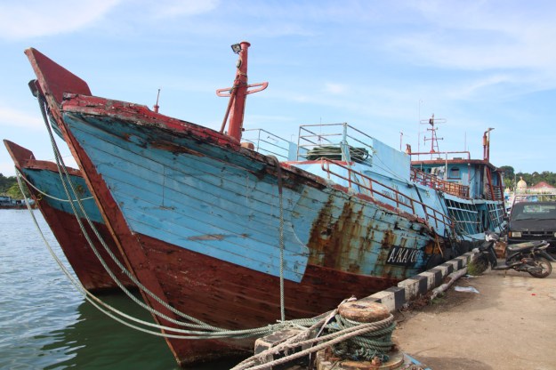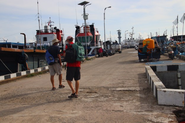 Les cartes de crédits sont arrivées à Sorong au début de la semaine. En allant à la plage Domi à pu téléphoner et à appris que les pièces moteur était en transit à Singapour et pourrait donc être disponibles courant de semaine prochaine. Les fruits et légumes et autres vivres frais sont épuisés et on a commencé à attaquer les conserves. Il serait donc temps de songer à rentrer sur Sorong. On se met d’accord pour un départ dimanche et continuons à nous faire plaisir dans ce petit paradis terrestre croyant disposer encore de plusieurs jours. Mais un matin après le petit déjeuné, en farfouillant dans son ordi Domi s’aperçoit tout d’un coup que nous sommes dimanche et que nous avons déjà passé 2 semaines ici. Pas le temps de se préparer psychologiquement à quitter ce qui restera l’un de nos plus beaux mouillages, c’est le jour prévu, il faut partir. Ni une ni deux nous dégonflons le canoë plions le taud de pluie roulons les tauds de Grand-voile et démarrons le moteur, relevons l’ancre et hissons les voiles pour rentrer vers la civilisation. Heureusement il y a un peu de vent et c’est sous grand spi que nous quittons Batanta.