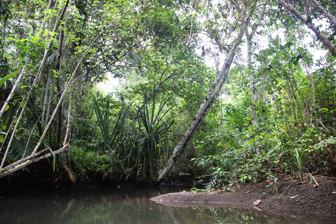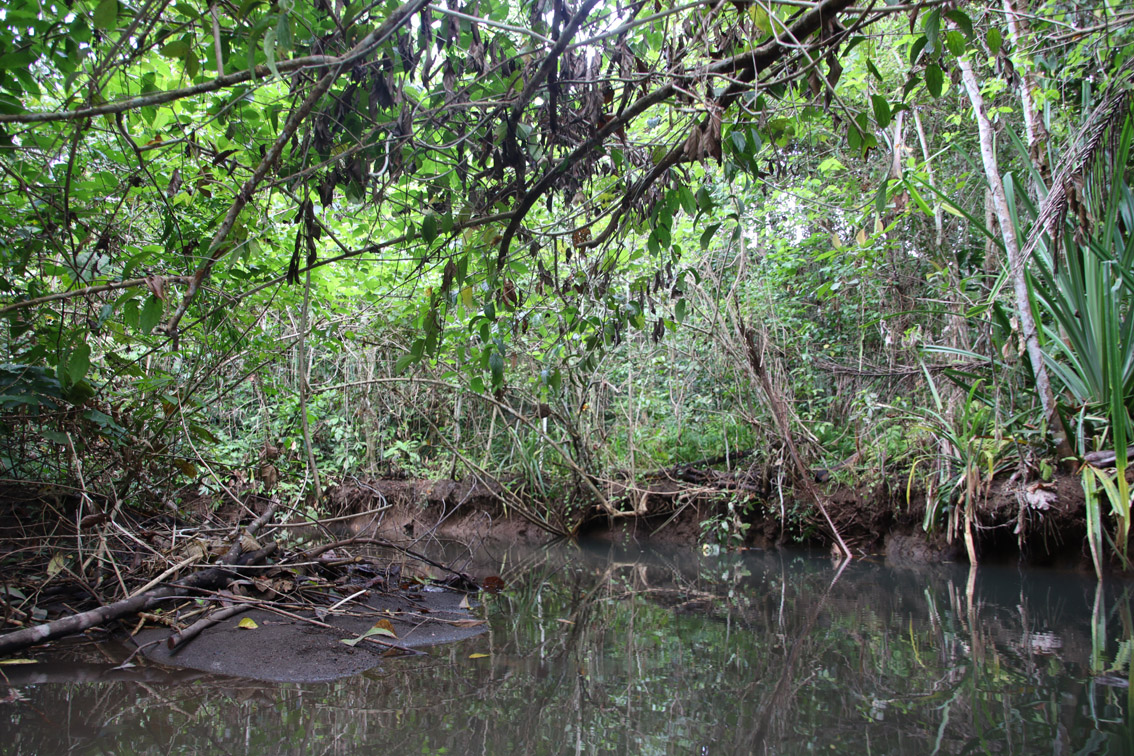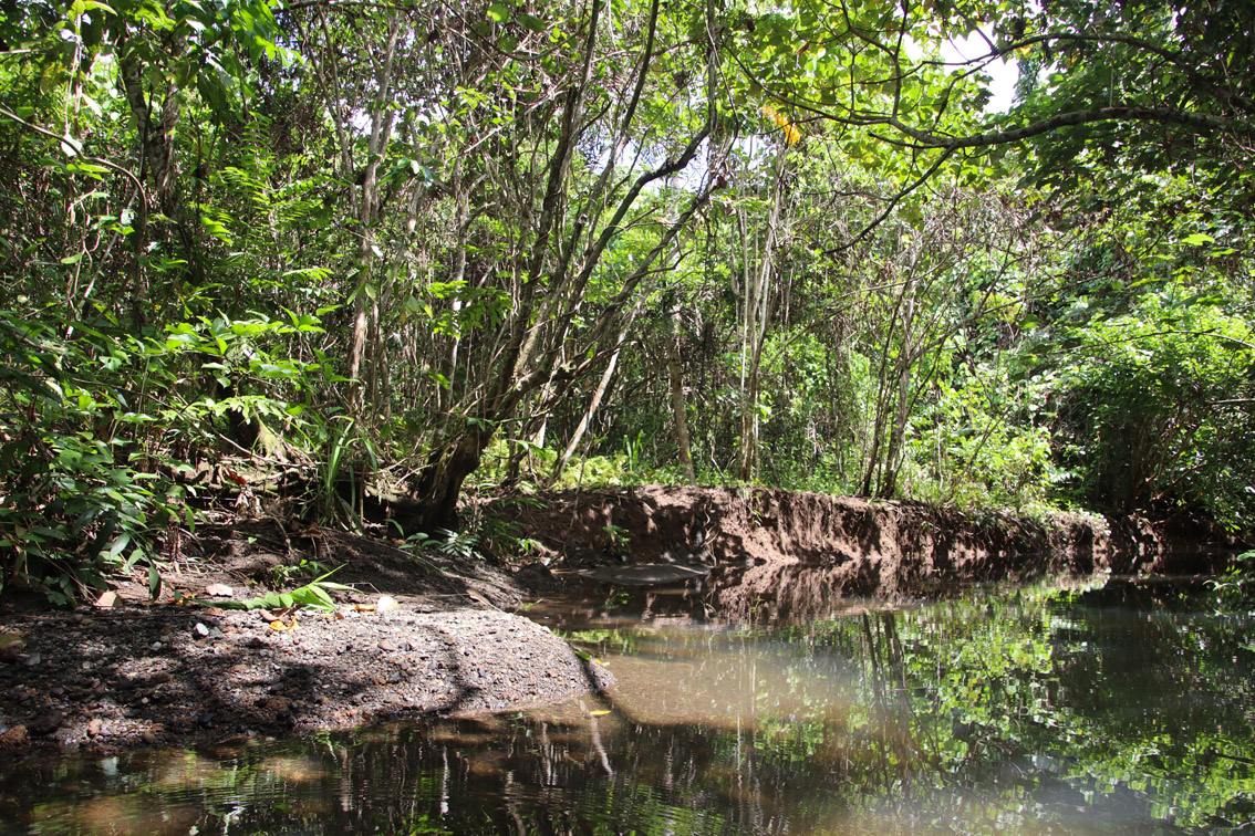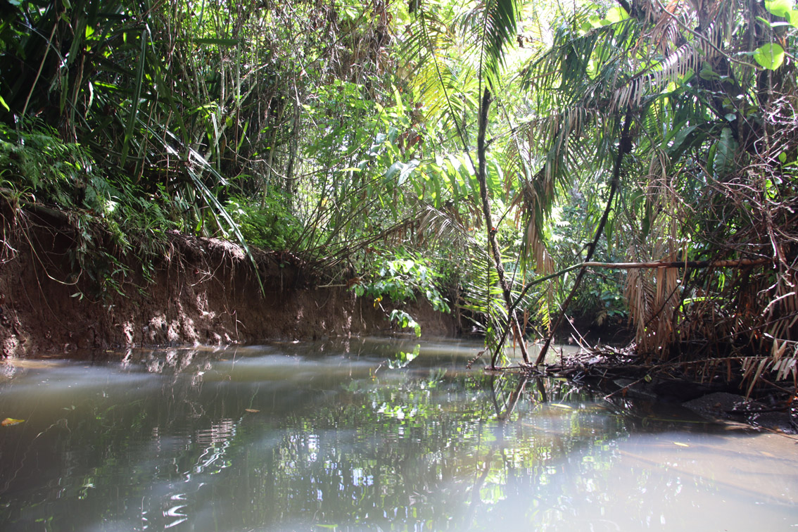 Nous essayons de remonter la rivière jusqu’au pied des collines ou un local nous à fait comprendre qu’on pouvait trouver de l’eau potable. Mais la rivière devient trop peu profonde pour continuer et la jungle qui la borde est tout simplement impraticable.