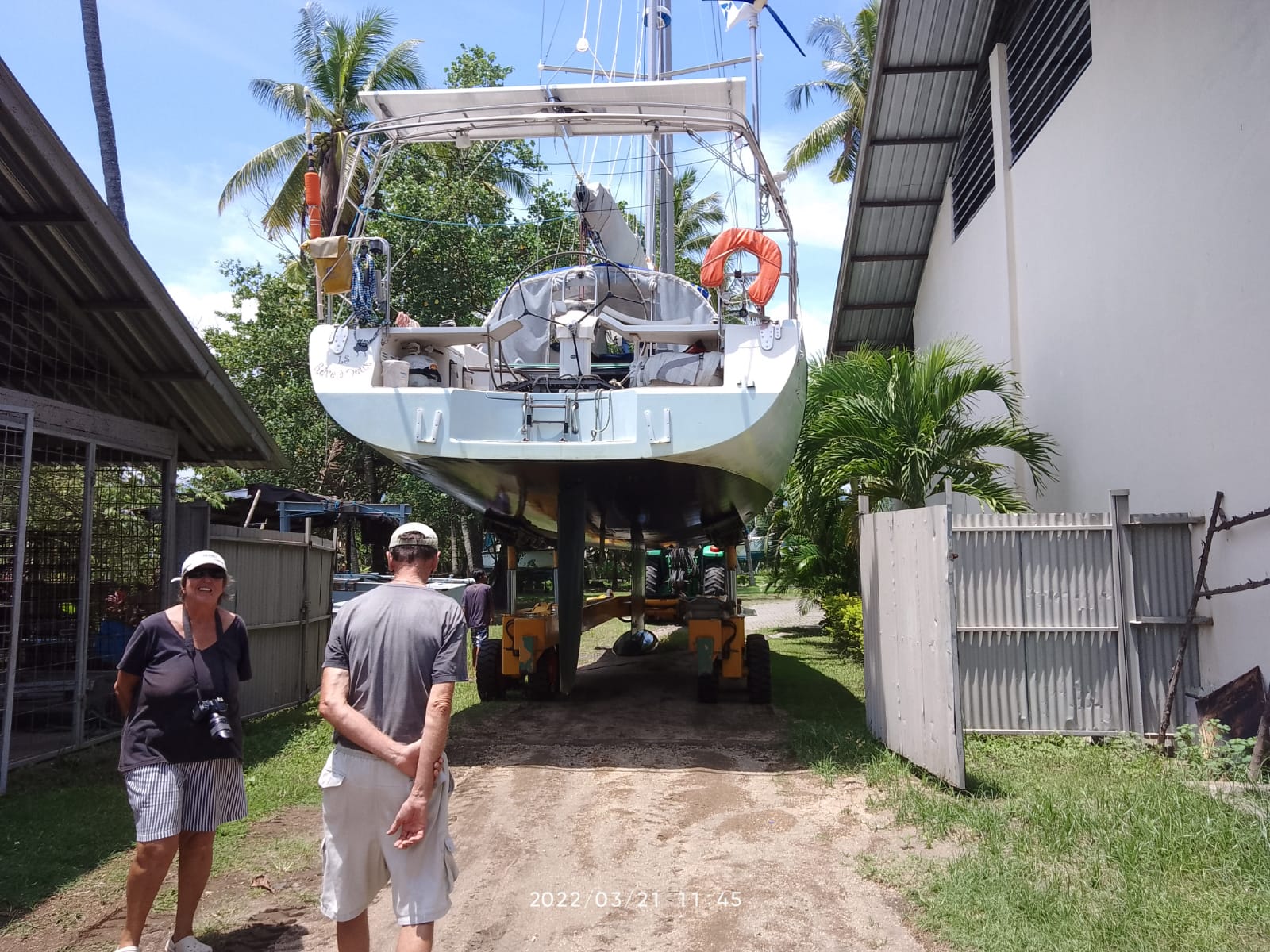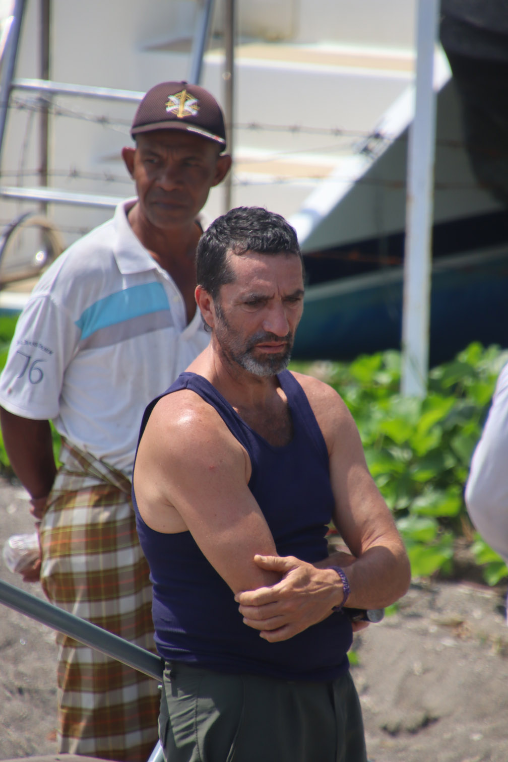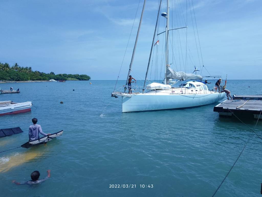 A commencer par notre ami Pablo le navigateur argentin et son OVNI39 Manragore qui est venu dans le pacifique par le passage du Nord-Ouest (en deux tentatives: lors de la première il perdra son bateau broyé par les glaces). Phillipe, l’ornithologue Allemand sur son Parotia un bateau hollandais en acier à toute épreuve. José et Nathalie sur Nomad, partis de La Réunion depuis 10 ans, ils ont fait du convoyage pendant plusieurs années entre la Malaisie et la Thaïlande et quand ils sont repartis c’était pour se retrouver bloqués ici 2 ans par le COVID et ils en ont profité pour remettre leur bateau en état. Ivy, Martin et Mederik venu pour convoyer Soul Sacrifice, le catamaran d’un ami, immobilisé dans le chantier depuis 2 ans, jusqu’en Australie et qui a du être remis en état de fond en comble avant de pouvoir renaviguer. Adam et Emily, les surfeurs californiens venus il y a deux ans à Bali après un tour complet de l’Amérique du Sud en camping car avec leur enfants, sur un coup de tête ils ont acheté un bateau et apprennent à naviguer entre les îles , Ils passent au chantier pour une remise en état express de Wedimynd. Adam et Deborah deux retraités de Norwich (Est de l’Angleterre), qui avait laissé leur bateau à Medana Bay début 2020 pour rentrer en Angleterre, un voyage à l’origine prévu pour quelques semaines et qui c’est transformé en plus de 2 ans en raison de la Covid les contraignant maintenant à une remise en état complète après cette immobilisation prolongée. Plusieurs autres bateaux dont les propriétaires sont revenu récemment sont d’ailleurs dans le même cas voire bien pire.