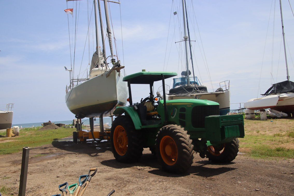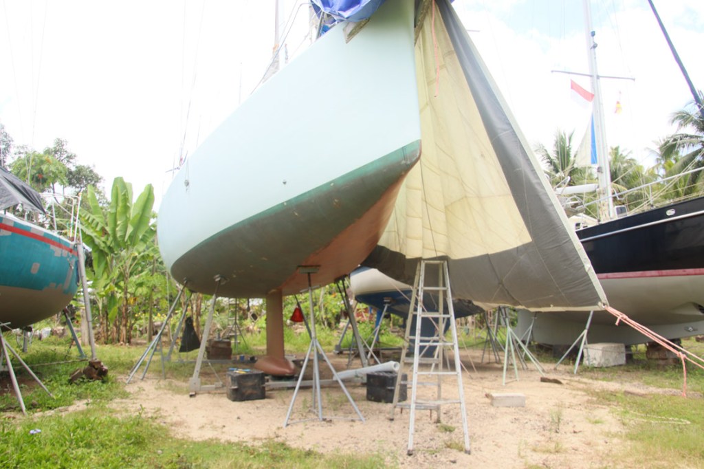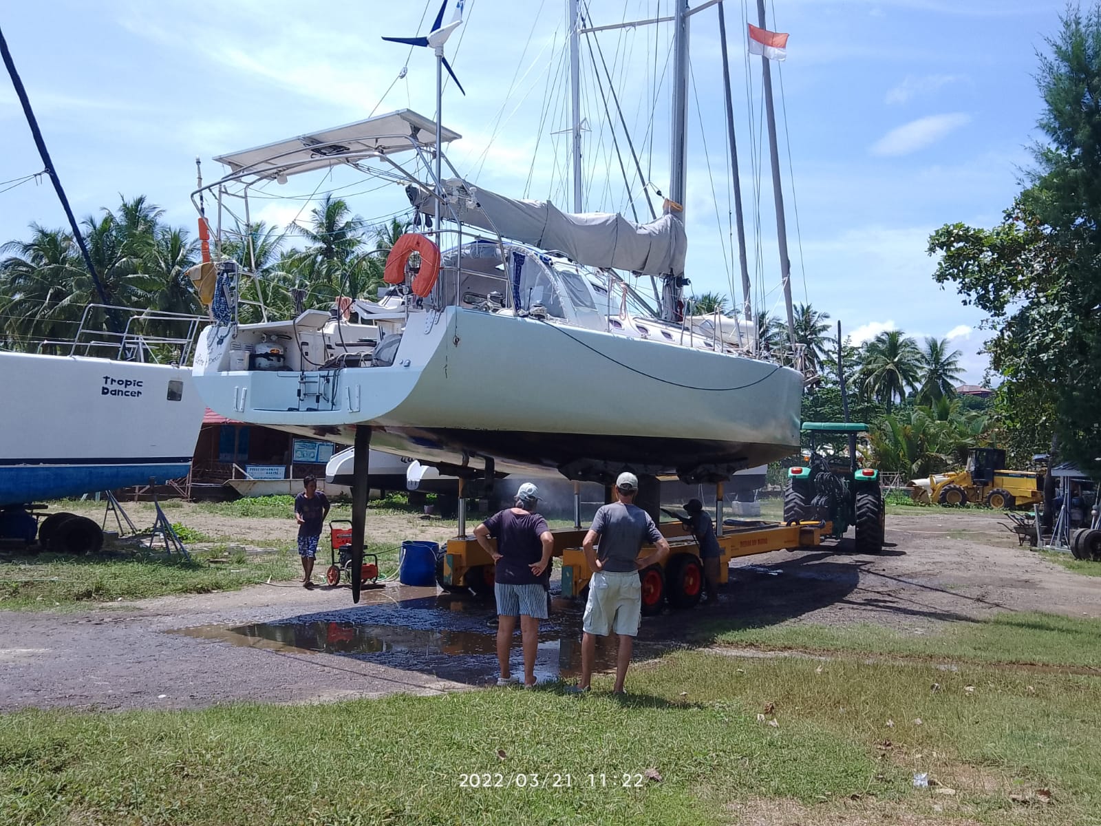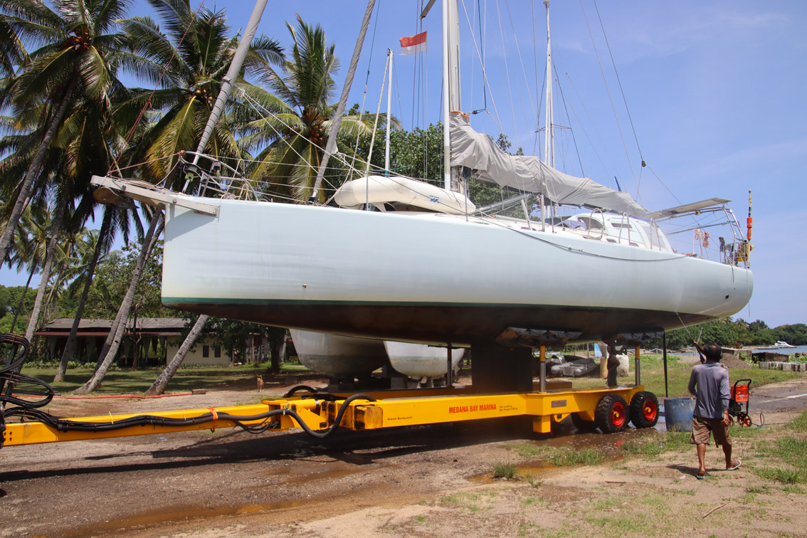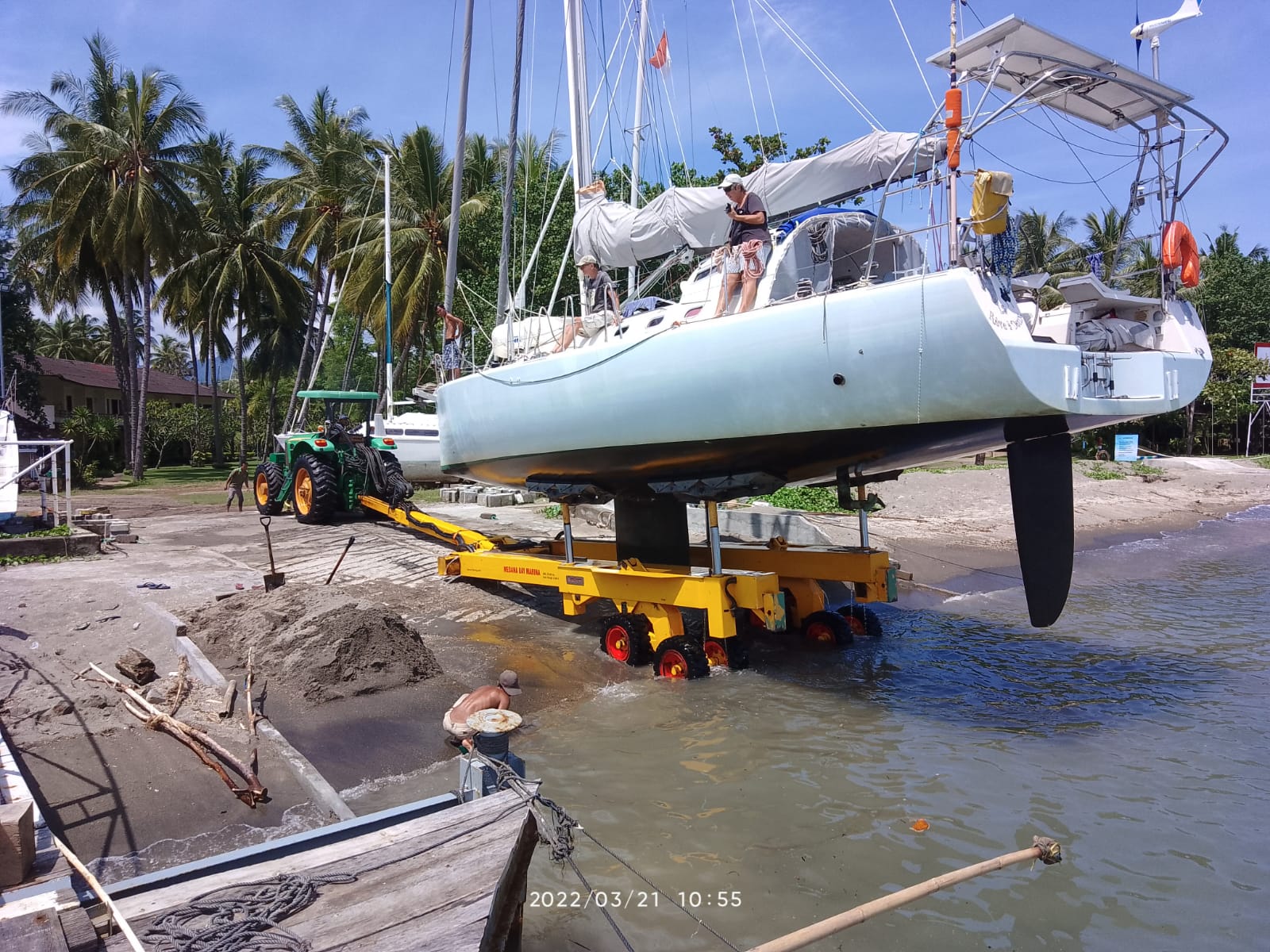 Medana Bay est la seule marina d’Indonésie à pouvoir sortir un bateau avec une quille profonde à bulbe comme le notre . Il sont équipés d’une remorque élévatrice hydraulique (slipway trailer) permettant de sortir n’importe quel type de bateau à partir d’un plan incliné. C’est l’endroit idéal pour ce type de travaux.