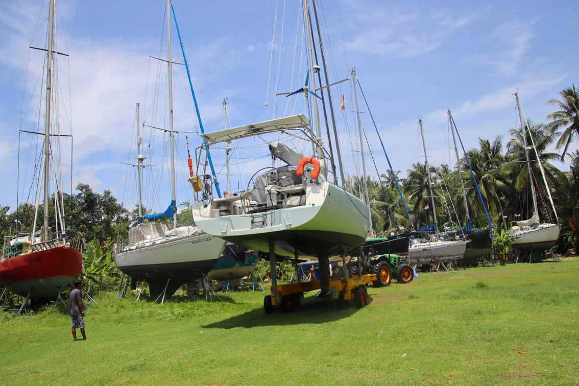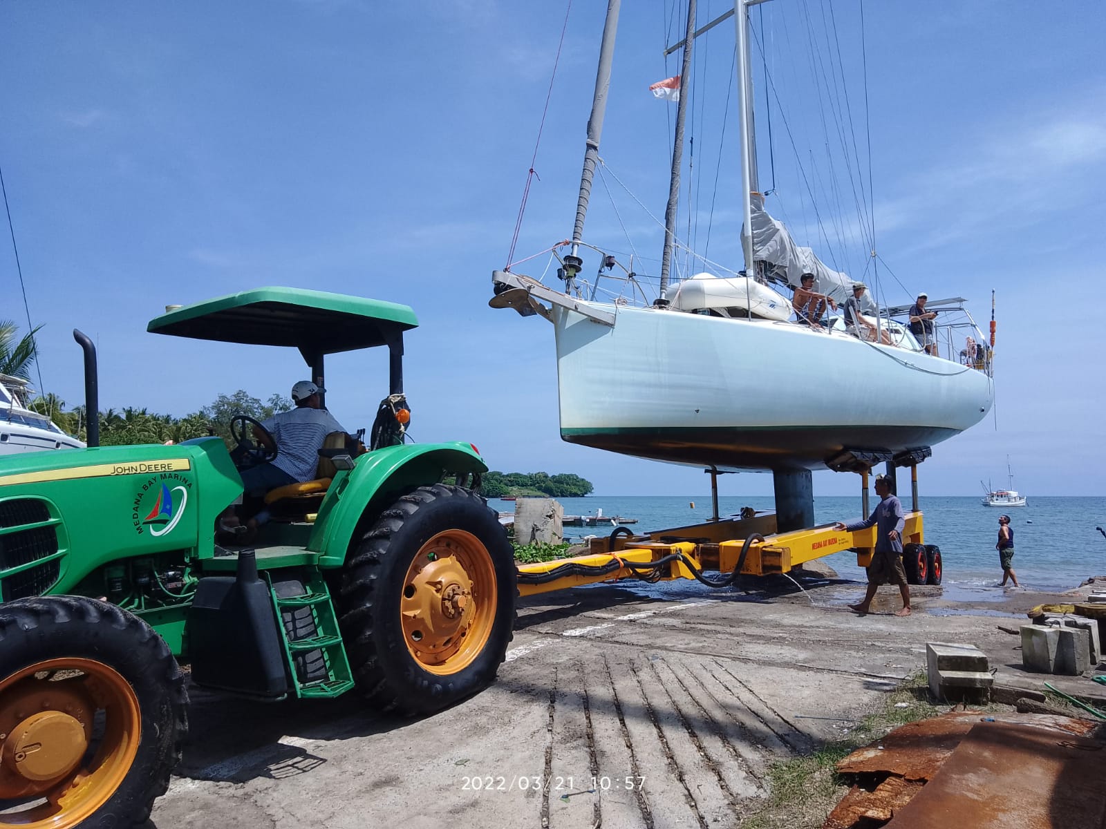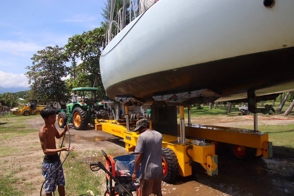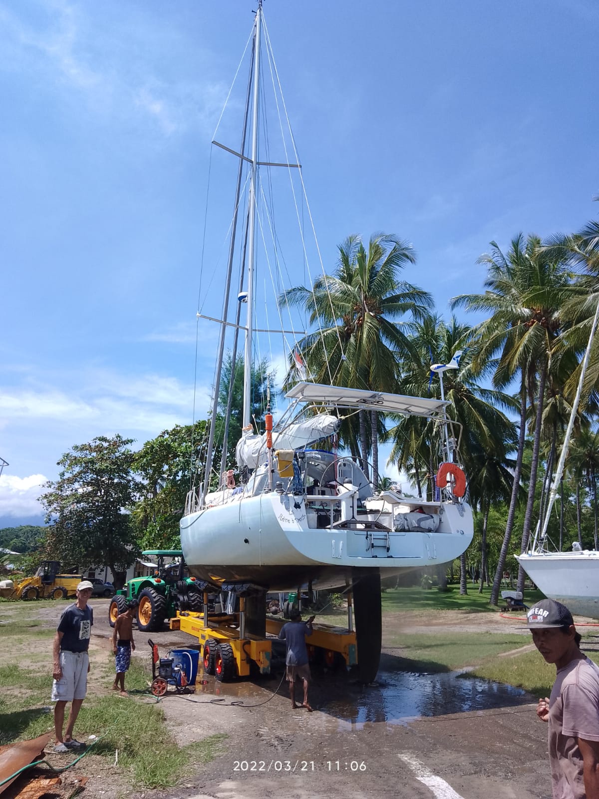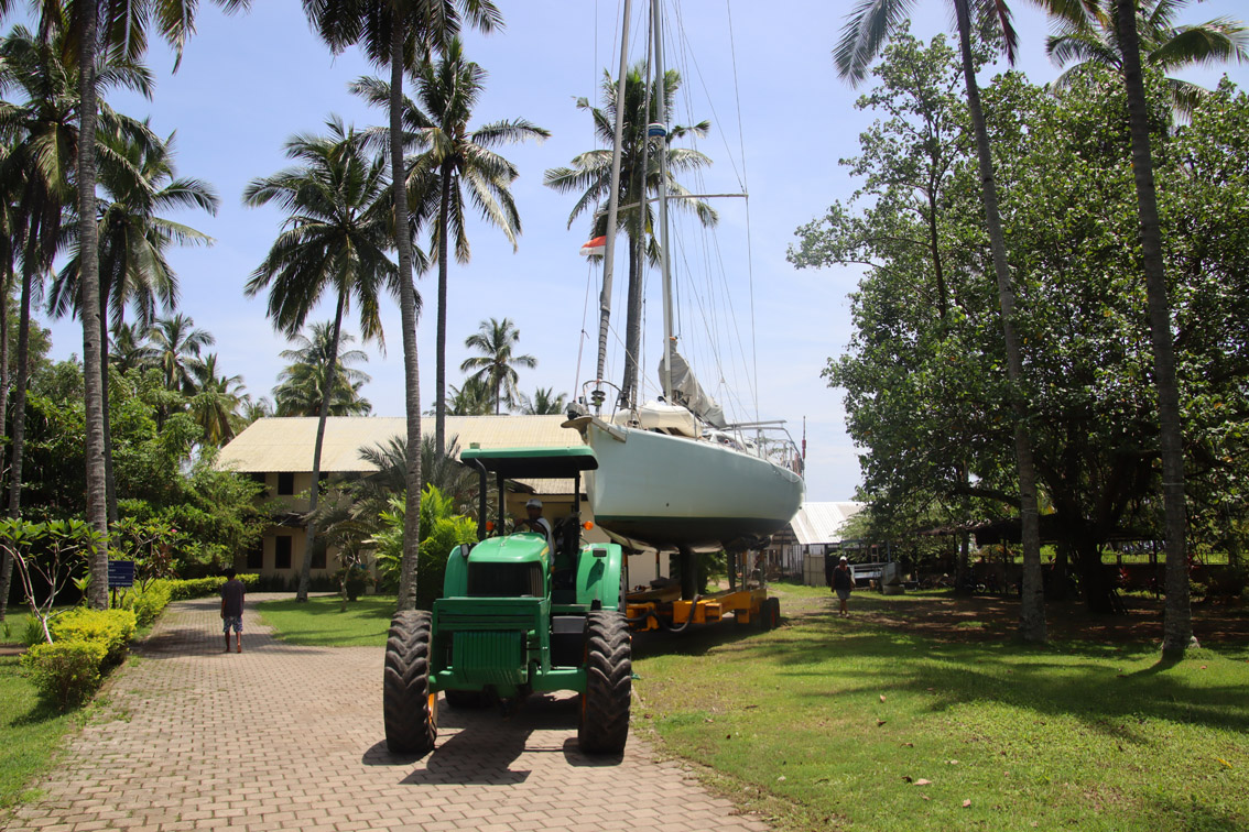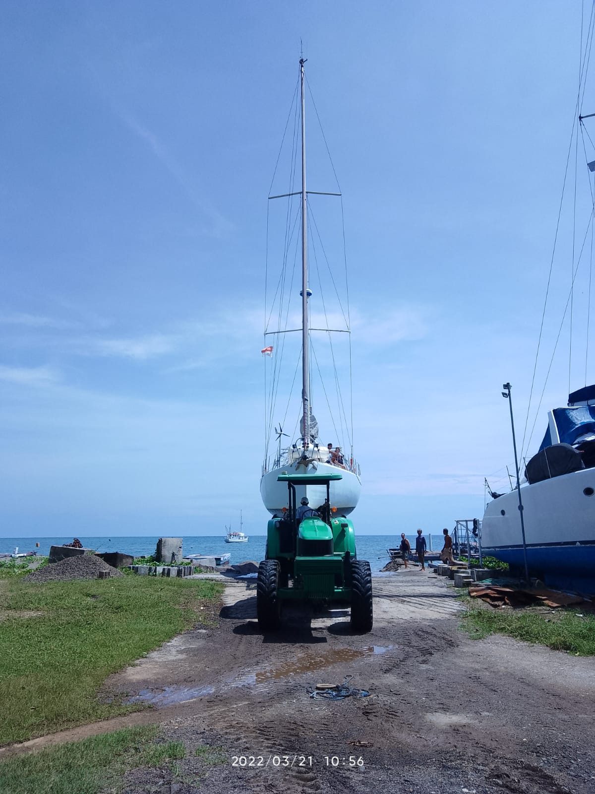 Medana Bay est la seule marina d’Indonésie à pouvoir sortir un bateau avec une quille profonde à bulbe comme le notre . Il sont équipés d’une remorque élévatrice hydraulique (slipway trailer) permettant de sortir n’importe quel type de bateau à partir d’un plan incliné. C’est l’endroit idéal pour ce type de travaux.