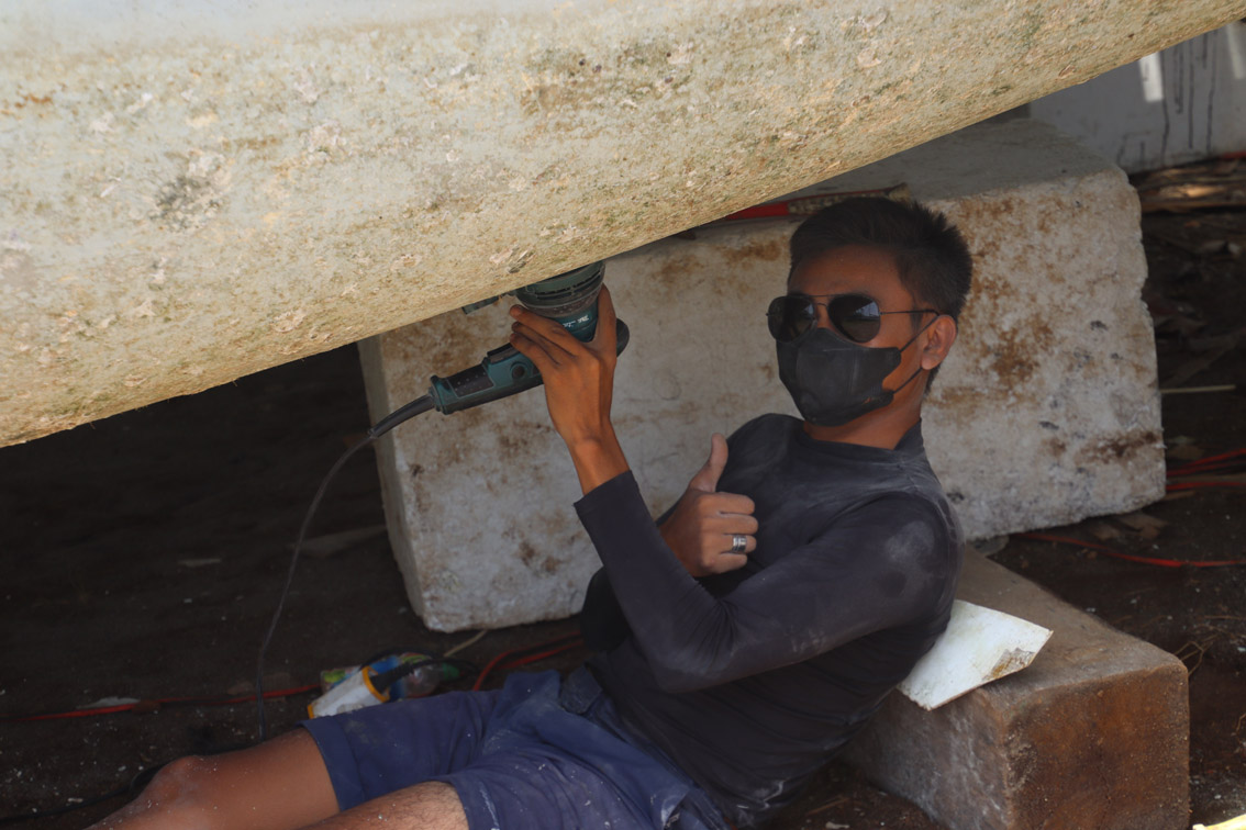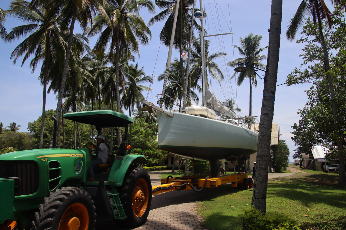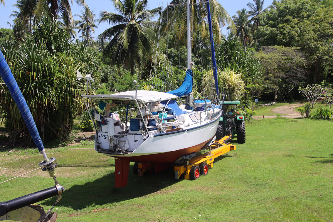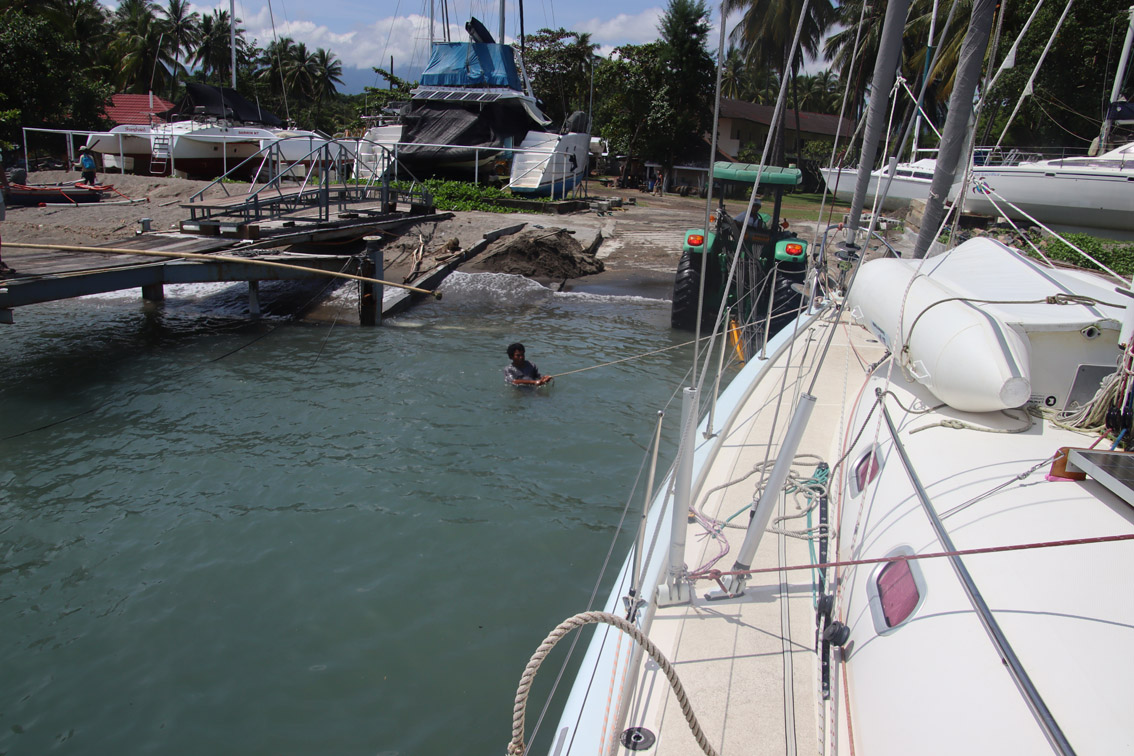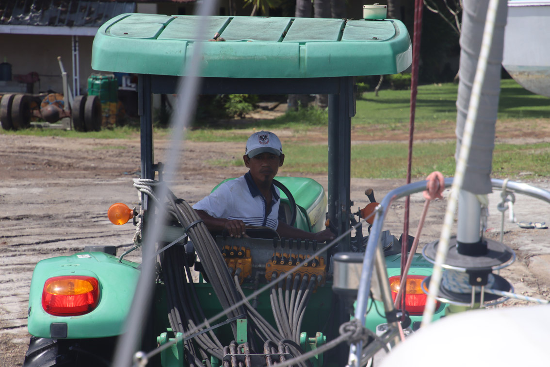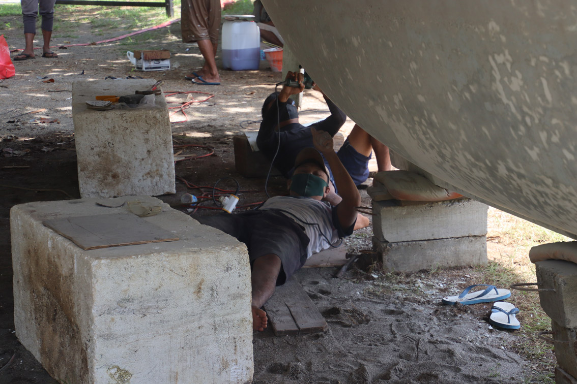 Medana Bay est la seule marina d’Indonésie à pouvoir sortir un bateau avec une quille profonde à bulbe comme le notre . Il sont équipés d’une remorque élévatrice hydraulique (slipway trailer) permettant de sortir n’importe quel type de bateau à partir d’un plan incliné. C’est l’endroit idéal pour ce type de travaux.