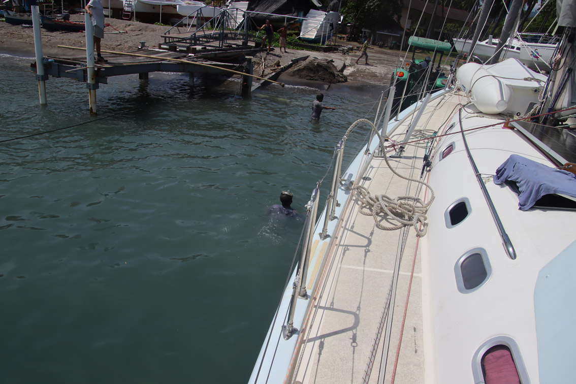 Vous avez peut être l’impression que chaque fois qu’on s’arrête de naviguer quelques semaines c’est pour faire des travaux. C’est tout à fait vrai! Pour des navigations sereines et des traversées sans soucis, un bateau de grand voyage doit être entretenu de façon régulière et approfondie chaque fois que c’est possible et de préférence avant que des problèmes ne surviennent . A titre de comparaison, nous avons parcourus plus de 15 000 milles lors des 12 derniers mois ce qui représente entre 10 et 15 ans d’une navigation estivale semi intensive: il est facile de comprendre les besoins d’entretien et de renouvellement que cela entraine. En Nouvelle Zélande nous avions mis l’accent sur le gréement, les voiles et le pont. Plus récemment à Sorong c’est le moteur et les panneaux solaires qui nous avaient occupés. Cette fois-ci, comme nous nous préparons à la traversée de l’Indien et la remontée sur l’Europe, il est temps de se pencher sur ce qui se passe sous la ligne de flottaison. Après 4 ans de navigation sans chantier important la liste des travaux est longue:
