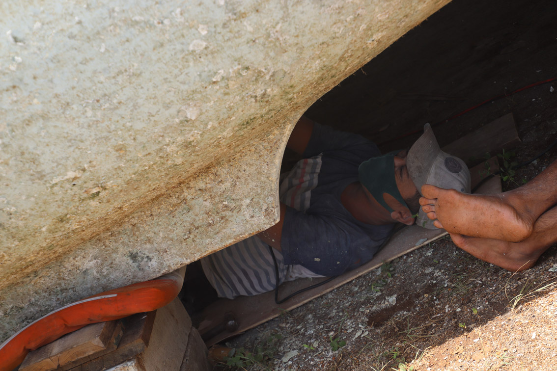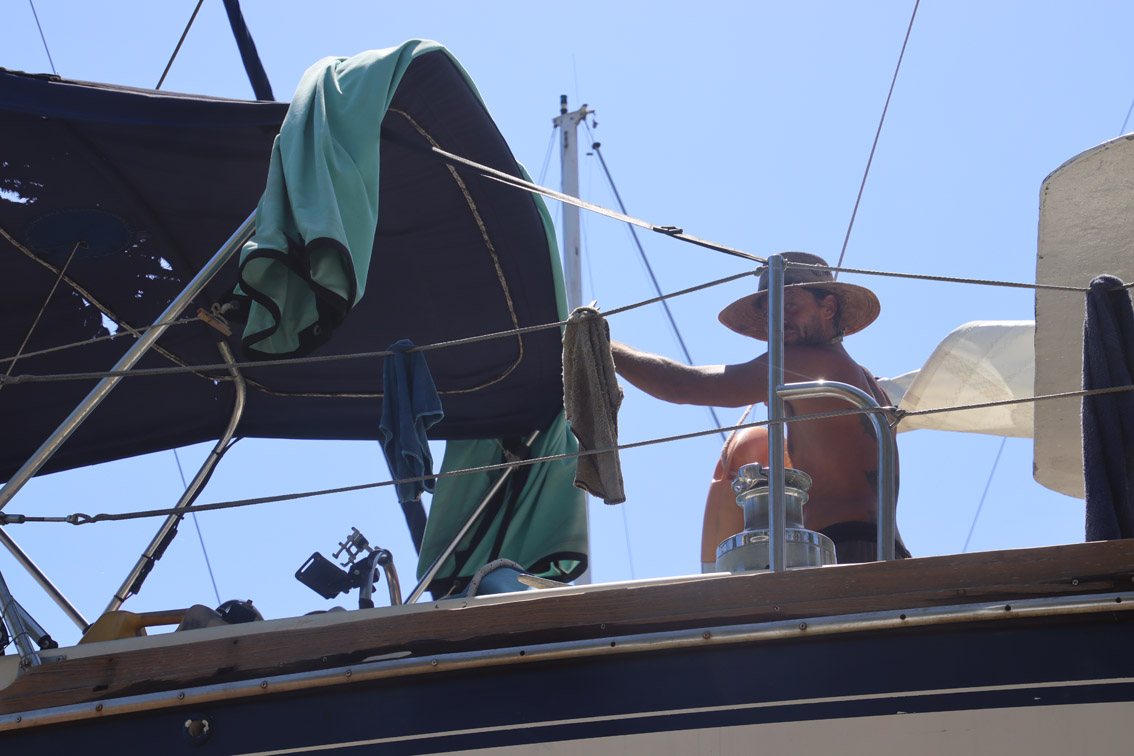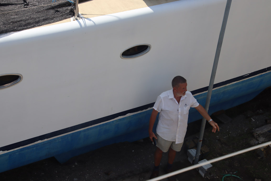 Et les travaux me direz-vous? çà se passe bien merci! Les petites réparations de la quille au mastic et à l’enduit se font sans problème après un bon décapage. Comme la coque est déjà recouverte de CopperCoat et qu’elle est très propre et en bon état on a juste besoin d’un léger ponçage suivit d’un bon lavage pour appliquer les nouvelles couches. Bien sûr c’est un peu compliqué de faire de la résine époxy (la base du Coppercoat) quand il pleut tous les jours, fait 35°C et 99% d’humidité relative.