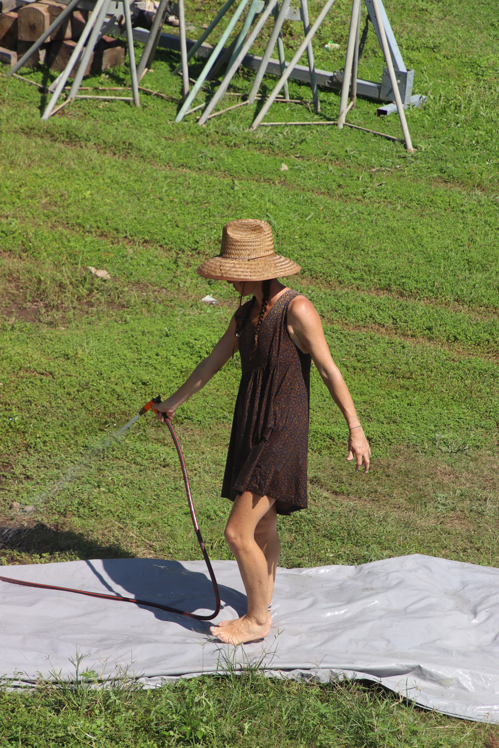 Mais à l’aide d’une voile de rechange et de bâches plastiques achetées chez le quincailler du coin on arrive à se protéger tant bien que mal. Comme il faut appliquer les quatre couches « dans la foulée » et que vu la température la résine prend très très vite on divise la coque en 5 zones de surface à peu près égale que l’on fera à raison d’une par jour avec un intervalle de 2 jours pour laisser la résine polymériser complètement et pouvoir déplacer les bâches. Domi applique le produit au rouleau laqueur et je prépare les mélanges résine + durcisseur + poudre de cuivre à la balance de précision, 100g de résine à la fois pour ne pas en gaspiller si elle prend trop vite. L’embase du sail drive et l’hélice seront traitées de la même manière après un bon décapage et 3 couches de primaire époxy anti corrosion.