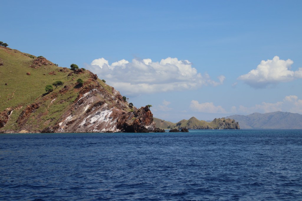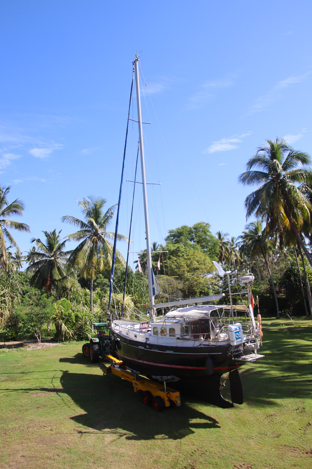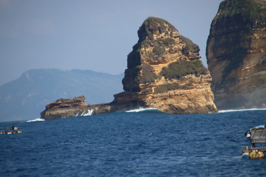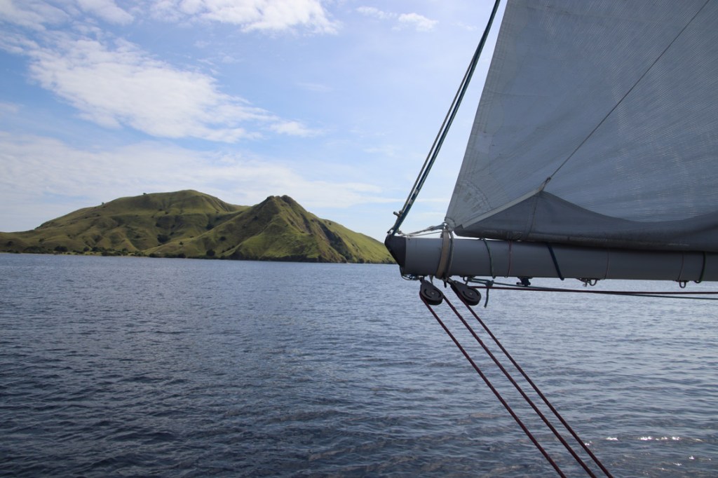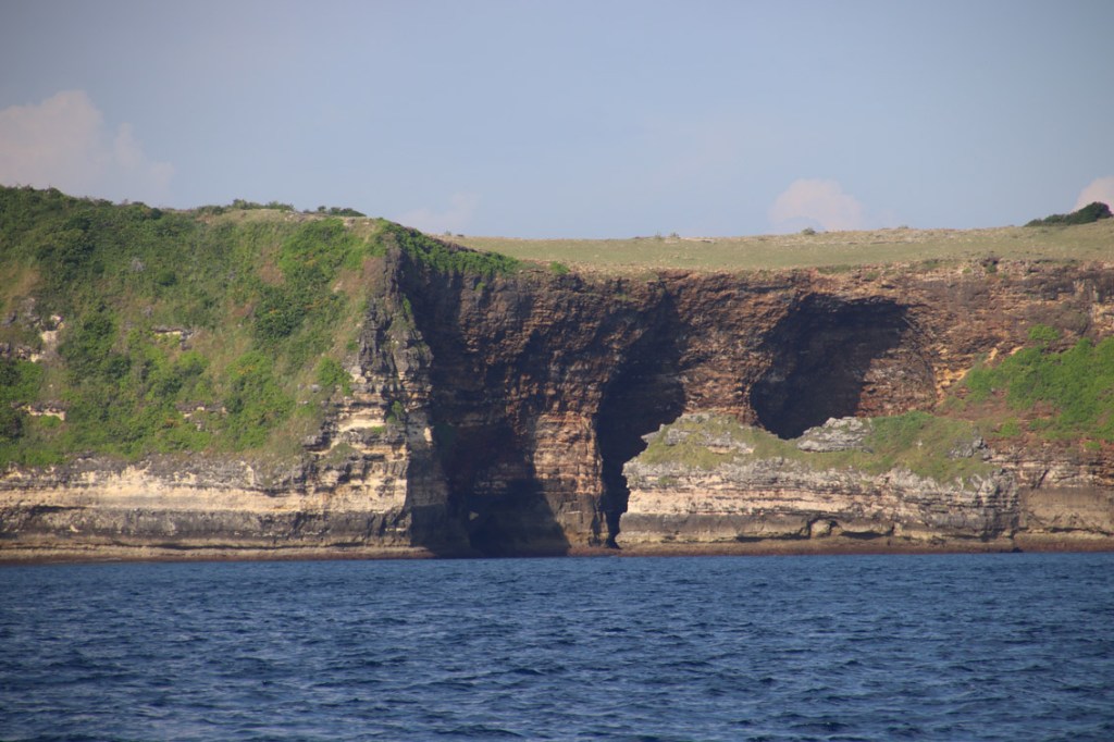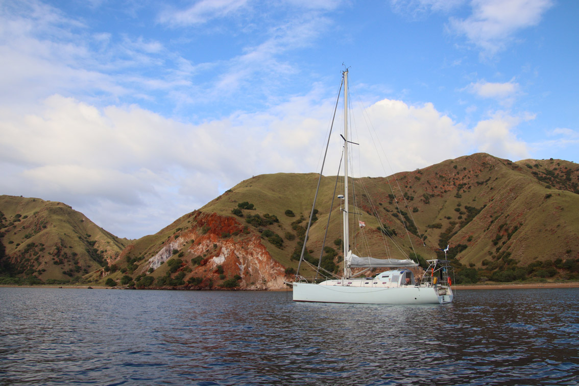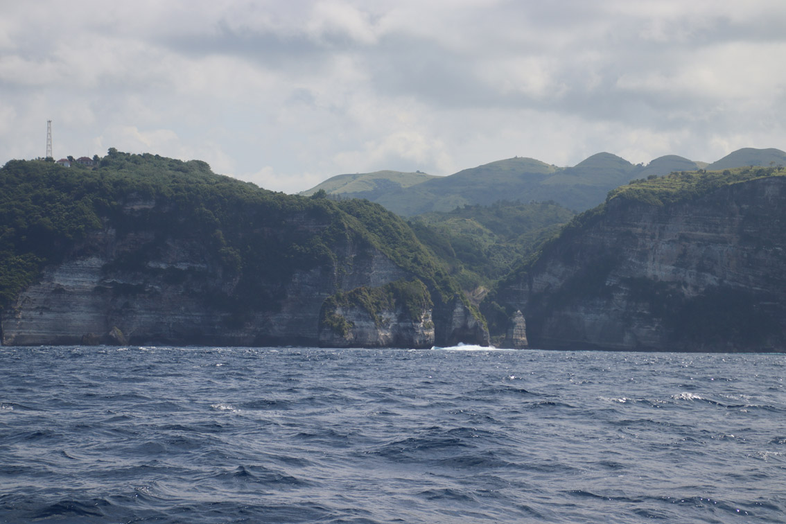 Dehors la mer est plutôt calme et le courant porte au large, le choix est rapide nous prendrons la route sud. Le vent de secteur Est est assez irrégulier. Par endroit il s’oppose au courant générant des vagues très courtes si bien que quand il descend en dessous de 9 nœuds on a du mal à avancer, qu’à cela ne tienne, on appuie légèrement au moteur dans ces moments là. Le courant nous pousse au large mais n’est jamais franchement contraire. A midi nous sommes à la pointe Sud Est de Nusapenida et de ses superbes falaises. Le courant devient carrément favorable et augmentant sa puissance, le vent aussi à mis beaucoup de Sud dans son Est si bien que la mer certes parfois un peu confuse n’est pas trop agitée. Nous traversons le détroit à plus de huit nœuds sur le fond. A 15:30 nous prenons le dernier corps mort libre devant Gili Asahan. Il nous reste une grosse semaine pour préparer notre escapade terrestre, ranger le bateau pour accueillir nos amis et effectuer les quelques vérifications et réparations de routine en vue de la traversée de l’Indien, et nous sommes bien contents d’être ici au calme plutôt qu’au milieu de la vie trépidante de Bali.