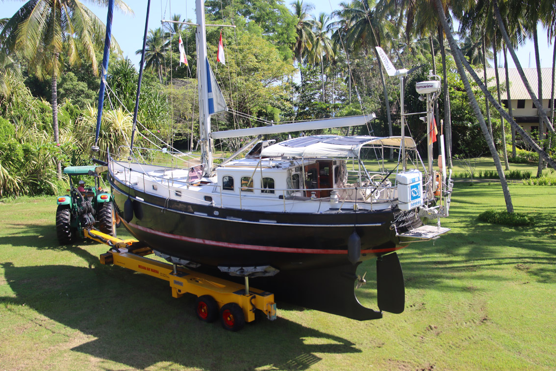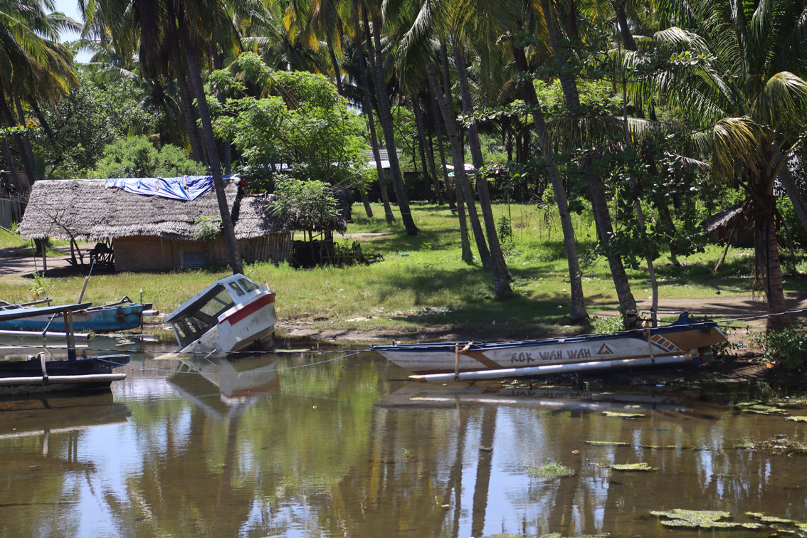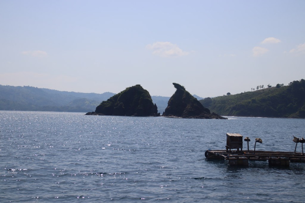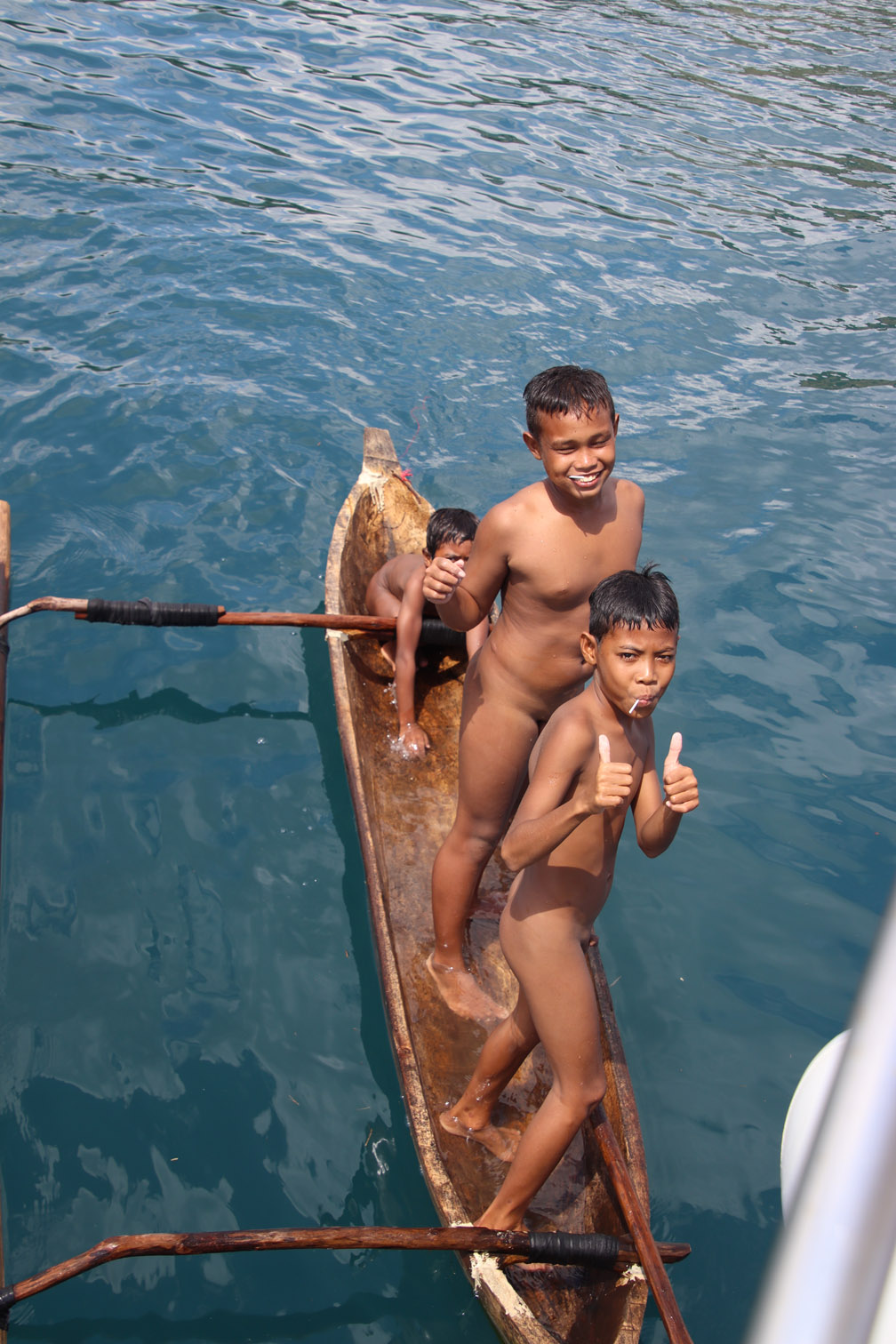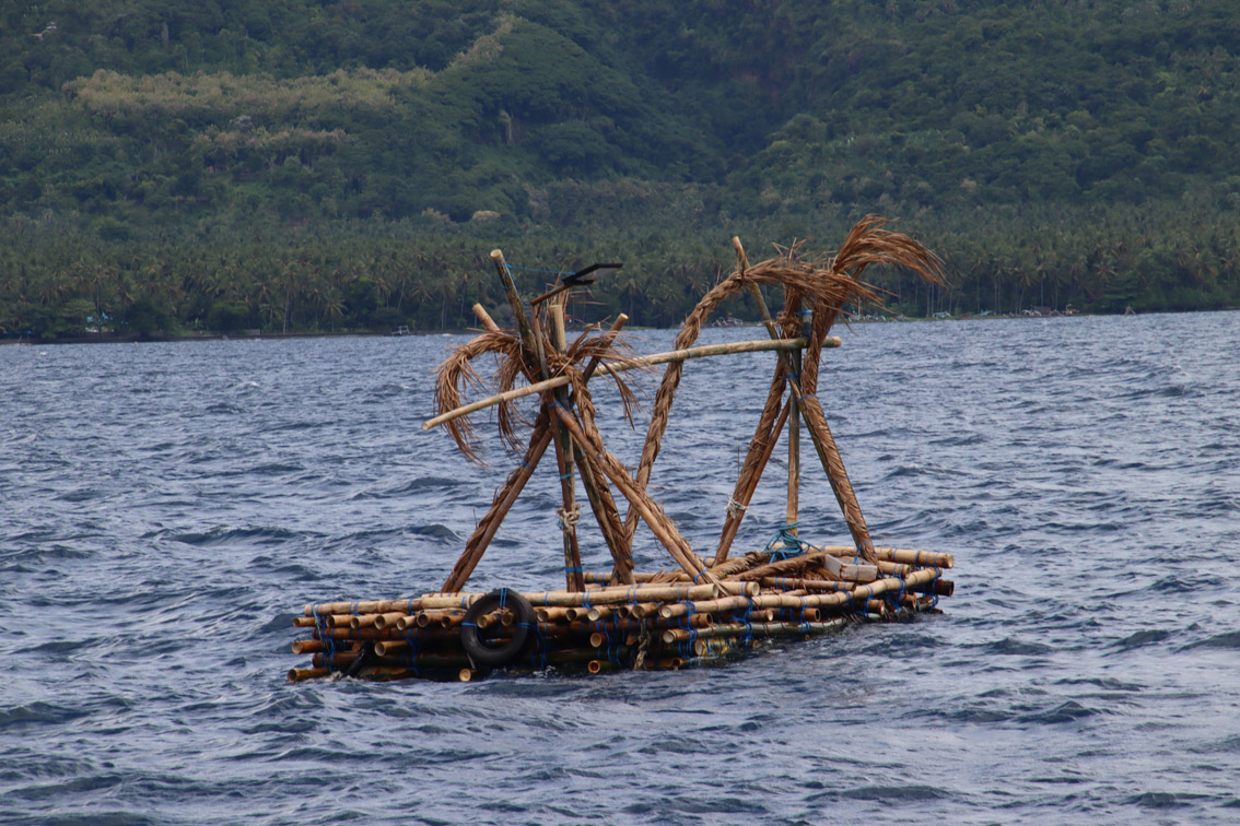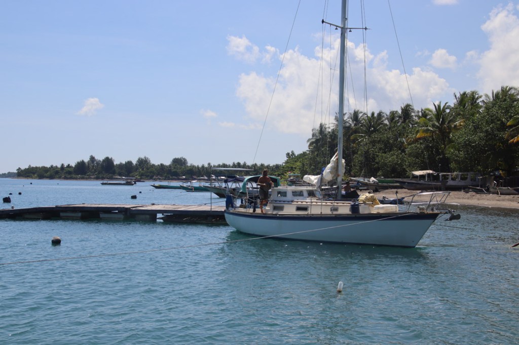 Au matin à huit heure nous mettons les voiles. Le vent nous rejoint avant la pointe pas tout à fait face à la route directe mais il y aura des bords à tirer. Au passage de la pointe Bungkalang le vent monte d’un cran nous contraignant à prendre un ris que l’on enlève très rapidement. Toute la journée nous progressons bien le long de la côte qui est très belle. C’est intéressant de voir de jour tous ces radeaux que nous avions aperçu de nuit à l’aller. En fin d’après midi nous sommes devant Ambat ou nous voyons des dizaines de pirogues traditionnelles partir vers le large avec leur voile triangulaire de couleur puis revenir vers la terre.