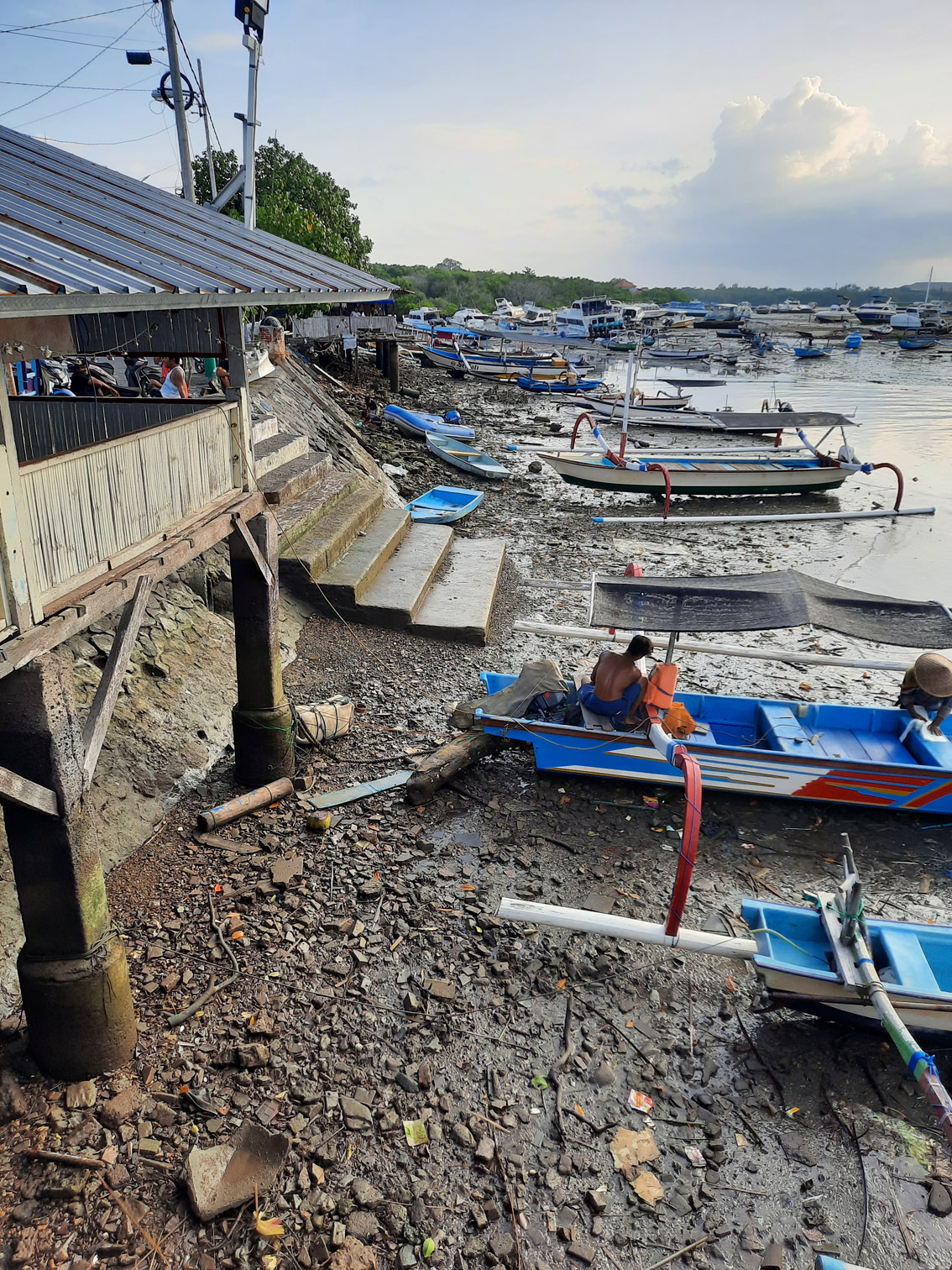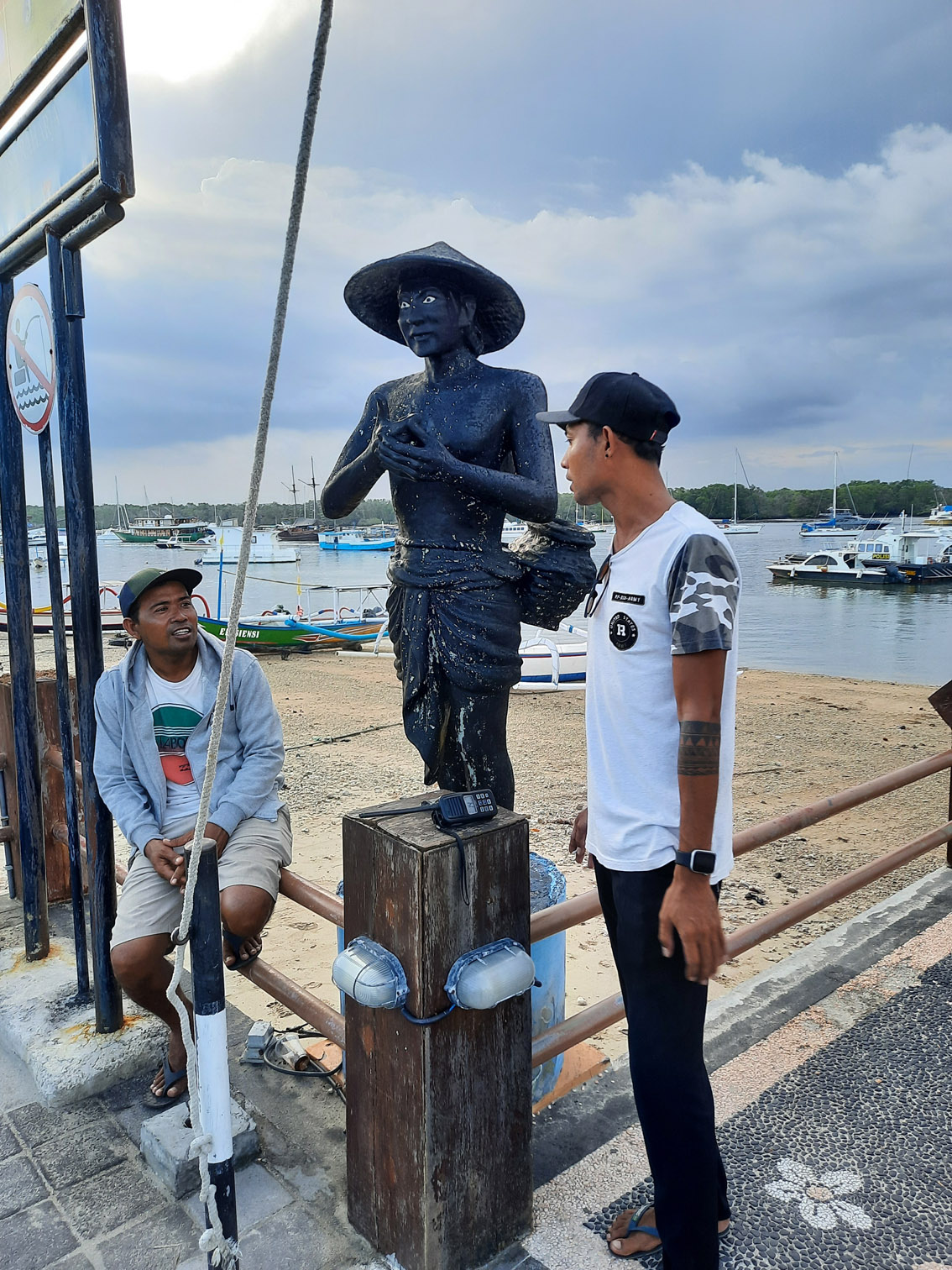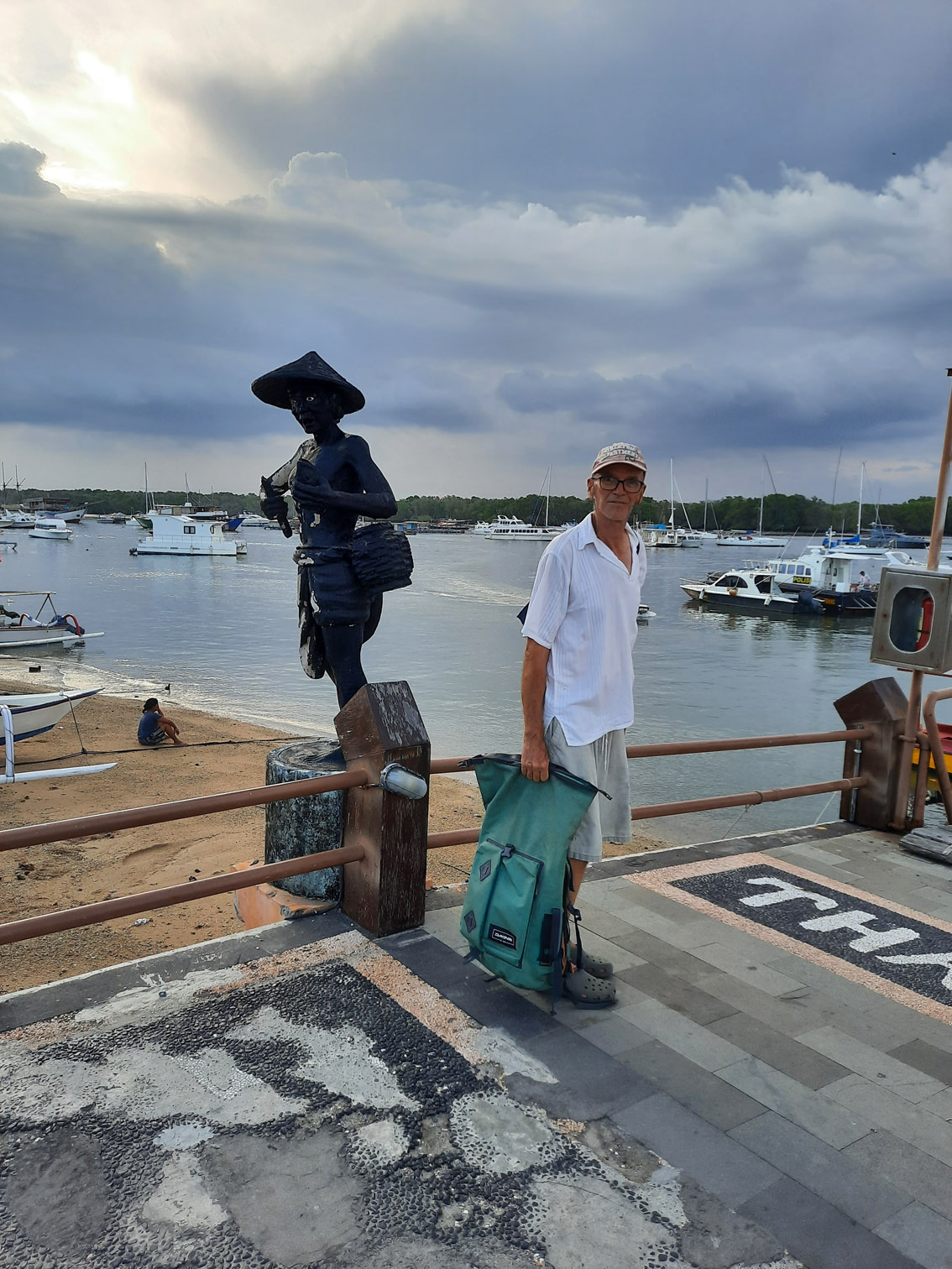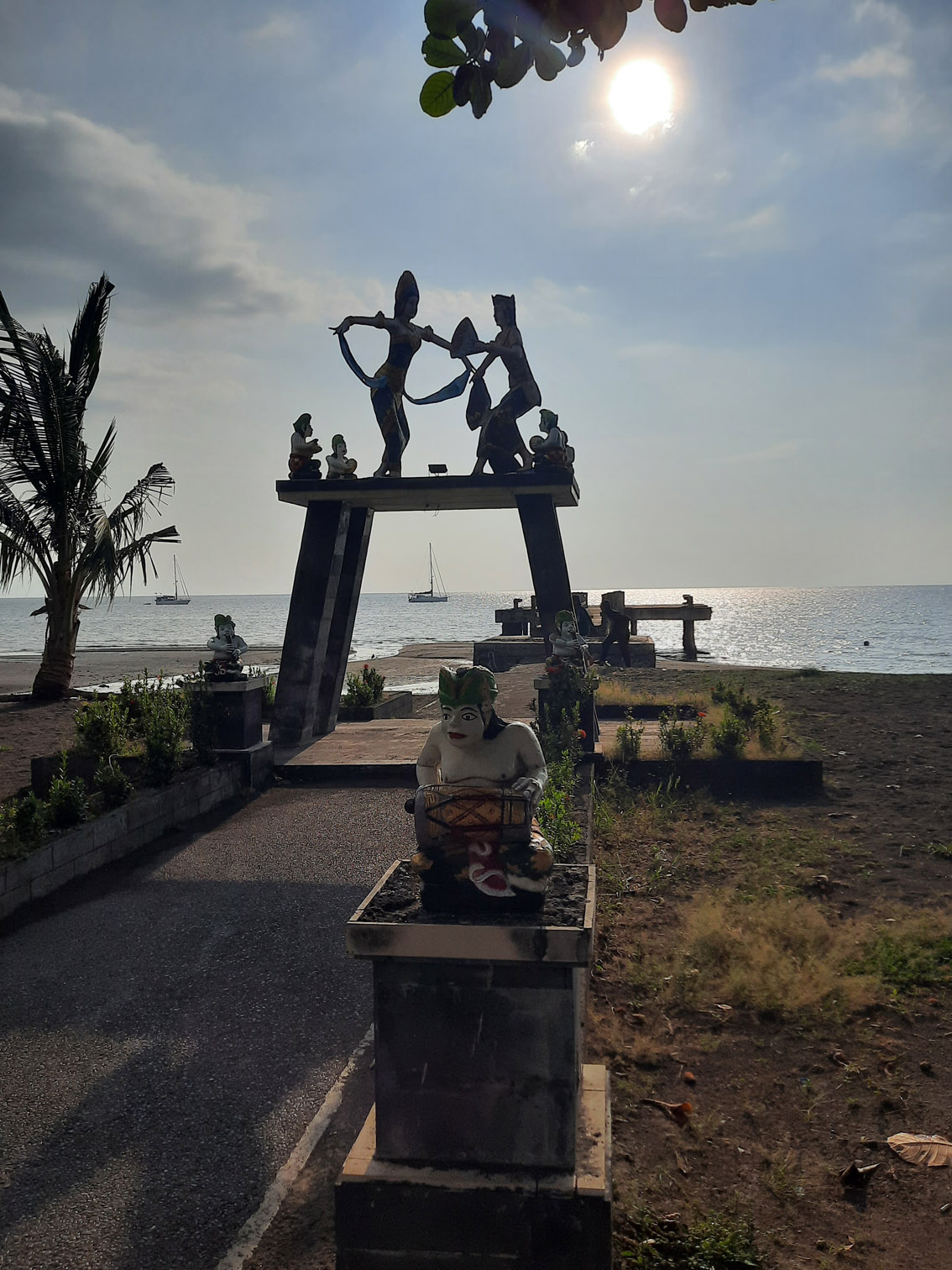 La première chose qui frappe quand on descend à terre c’est les fioritures et autres scultures d’inspiration hindou qui ornent tous les bâtiments fussent-ils temples, commerces restaurants ou maisons d’habitation. Chaque île d’Indonésie est vraiment un pays à part ! La deuxième chose c’est le désespoir des habitants qui ont dû survivre tant bien que mal à ces deux années de COVID,eux dont l’économie est entièrement basée sur le tourisme. Du coup ils sautent littéralement sur le premier étranger qu’ils voient (aujourd’hui c’est nous:() pour lui vendre des bijoux traditionnels, des perles, des fruits, de la boisson, une promenade en bateau pour aller voir les dauphins ou en voiture pour aller voir les cascades ou des temples et il est très difficile de leur faire lâcher prise et de les convaincre que pour l’instant on veut juste se dégourdir les jambes le long du bord de mer. Pour les chutes d’eau et les temples on aura tout le temps d’en faire la tournée avec nos amis Régine et Michel à la fin du mois.